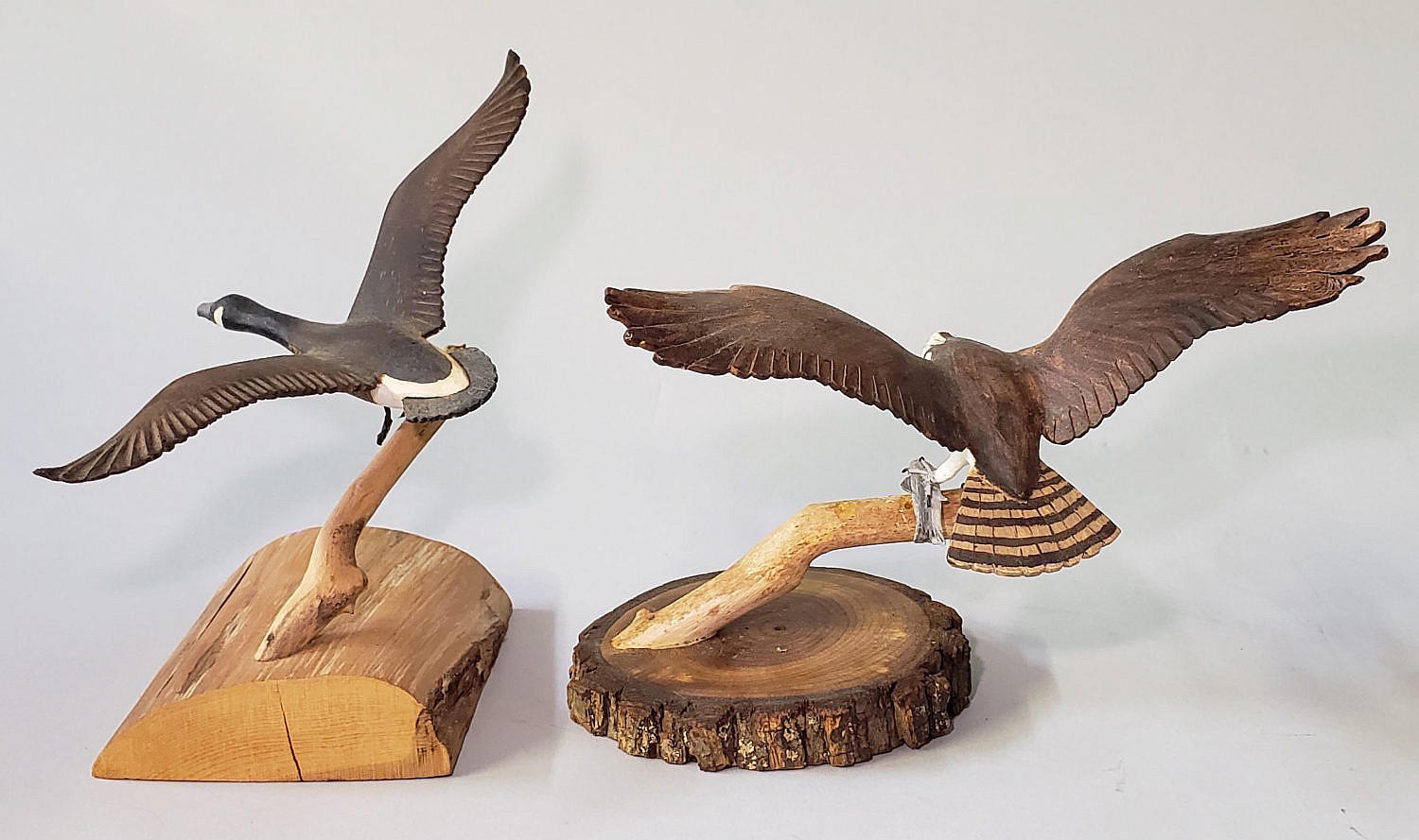 Two Hand Carved and Painted Spread Winged Bird Decoys Consign Now Dept20th Century Design, Collections, Furniture/Decorative ArtsSizeHeight 6 in. Width 5 in. Two Hand Carved and Painted Spread Winged Bird Decoys, each signed upon the base, “L.F.G. Newmarket, N.H., ’89 and 94, Canada Goose, and Osprey. Height 6 in. Width 5 in. Please note that this auction has ended. Click here for an overview of this auction.