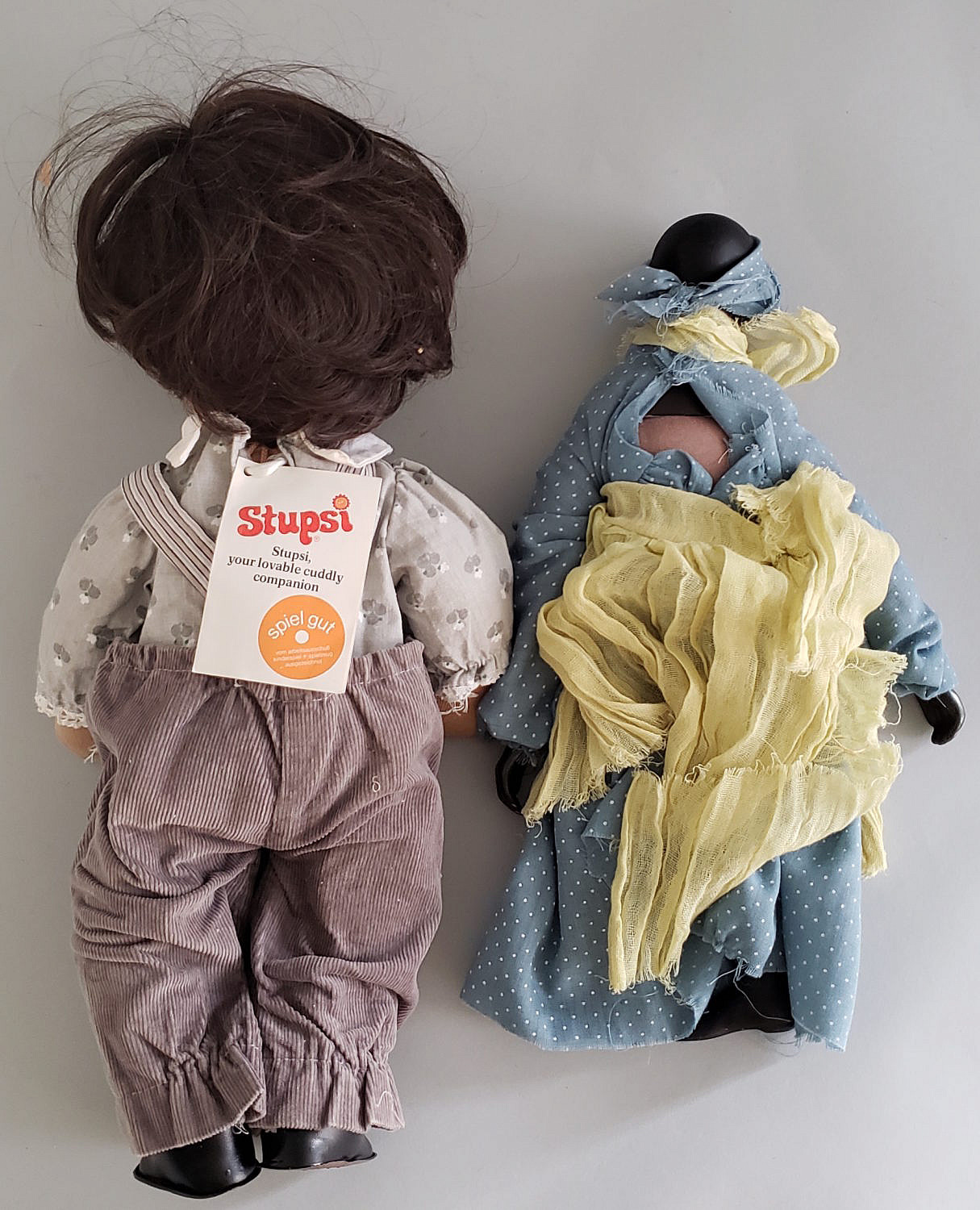 Two Vintage Porcelain Stupsi Dolls Consign Now Dept20th Century Design, Collections, Furniture/Decorative ArtsSizeHeight 18 in. Width 8 in. and 15 in. x 8 in. Two Vintage Porcelain Stupsi Dolls, the Stupsi doll is all fabric with original tag, “Made in Germany 1974”, the other doll is unsigned and has porcelain hands, feet and head. No cracks or chips to the porcelain. Height 18 in. Width 8 in. and 15 in. x 8 in. Please note that this auction has ended. Click here for an overview of this auction.