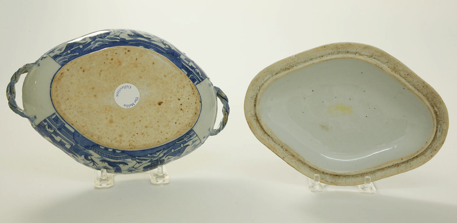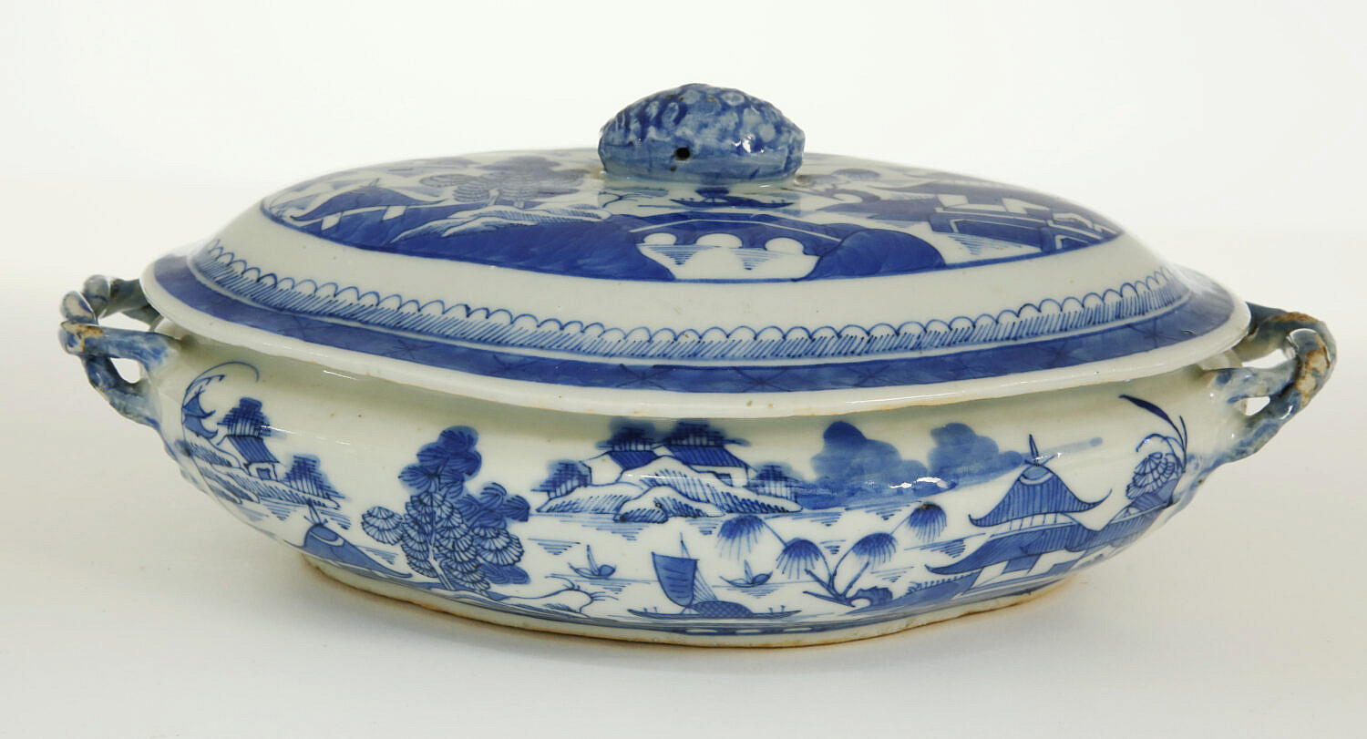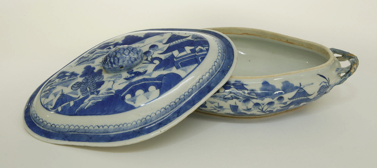 Canton Covered Vegetable Dish, 19th Century, with applied twisted handles, berry finial, rain and cloud border and Canton river landscape scene on lid and exterior body of the dish