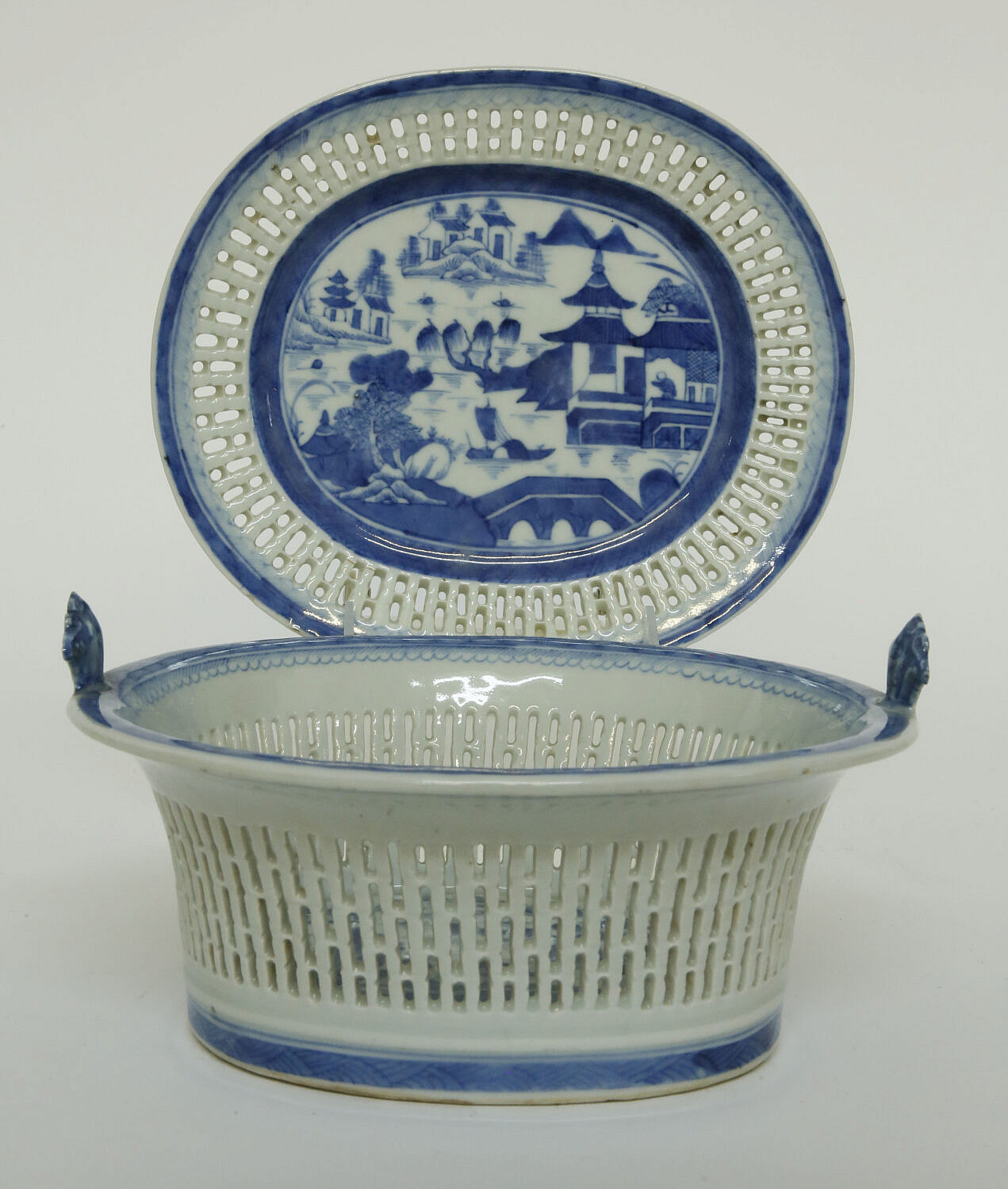 Canton Reticulated Fruit Basket and Tray, 19th Century, scroll handles, rain and cloud borders and Canton river landscape scenes on tray and interior of basket