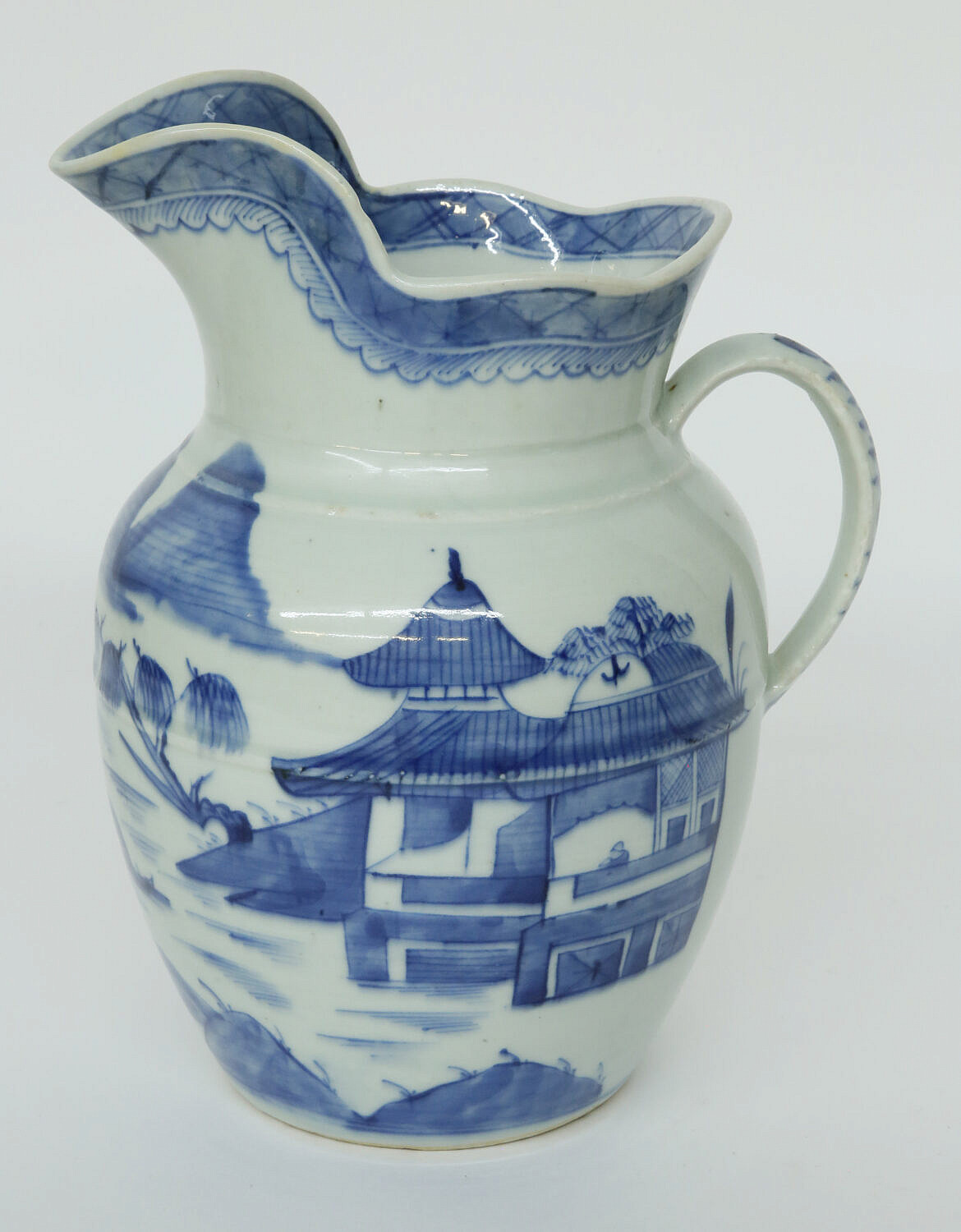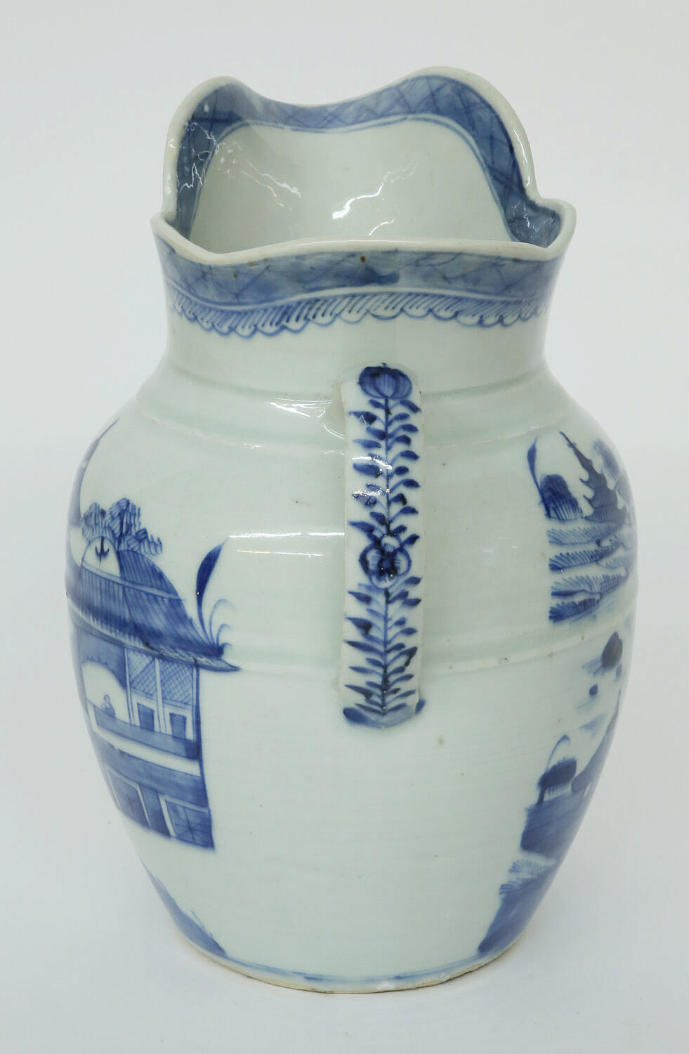 Canton Water Pitcher, 19th Century, ovoid body with unusual scalloped rim, molded collar and waist ribs; diapered and rain and cloud borders above continuous Canton river landscape scene; C-handle with stylized floral motifs
