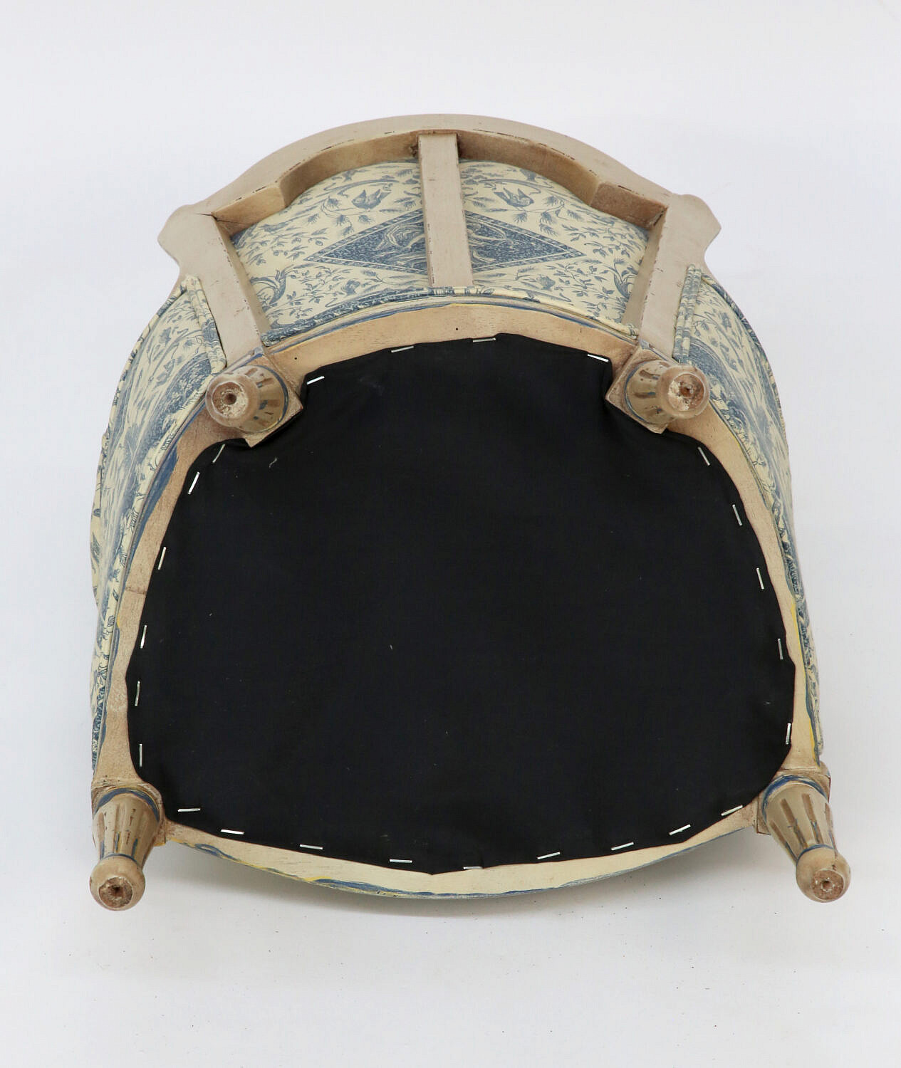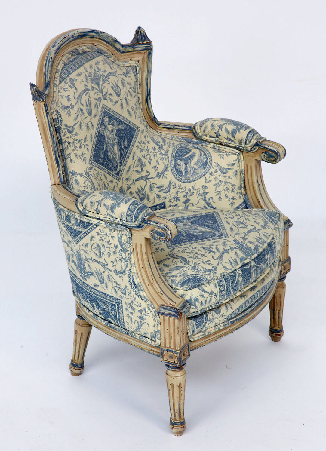French Style Miniature Bergere Consign Now DeptFurniture, Furniture/Decorative ArtsSizeHeight 19 in. Width 13.5 in. Depth 11 in. French Style Miniature Bergere, Contemporary, hand carved and decorated, upholstered in blue and creme toile Height 19 in. Width 13.5 in. Depth 11 in. Please note that this auction has ended. Click here for an overview of this auction.