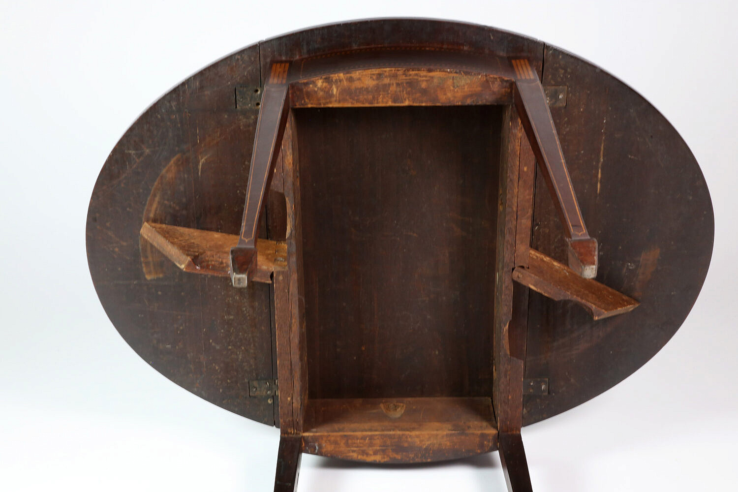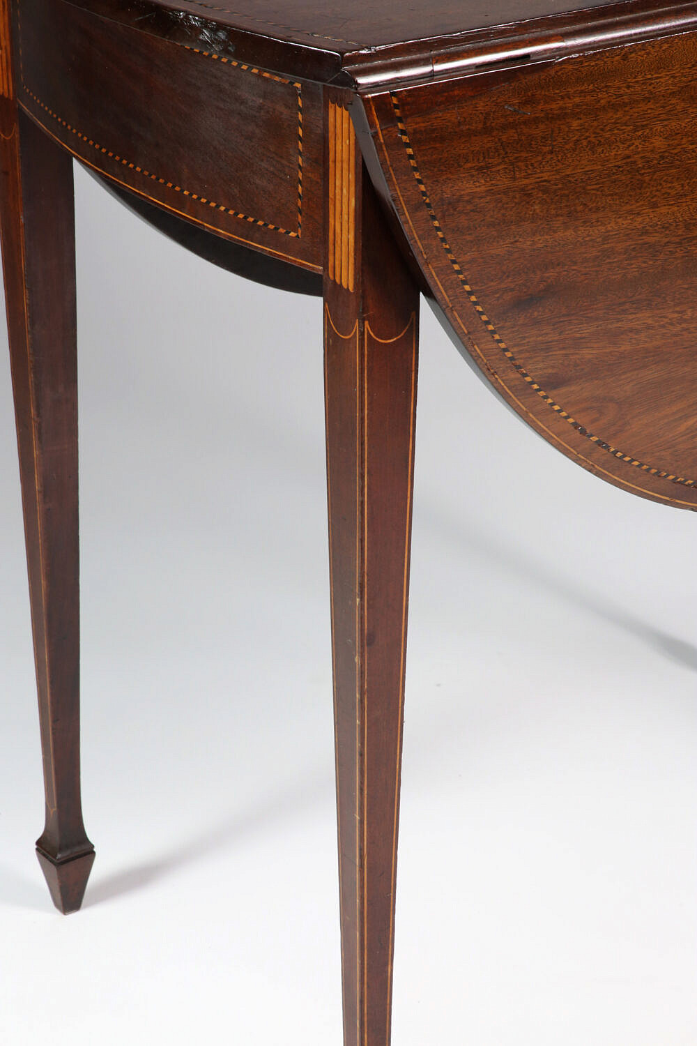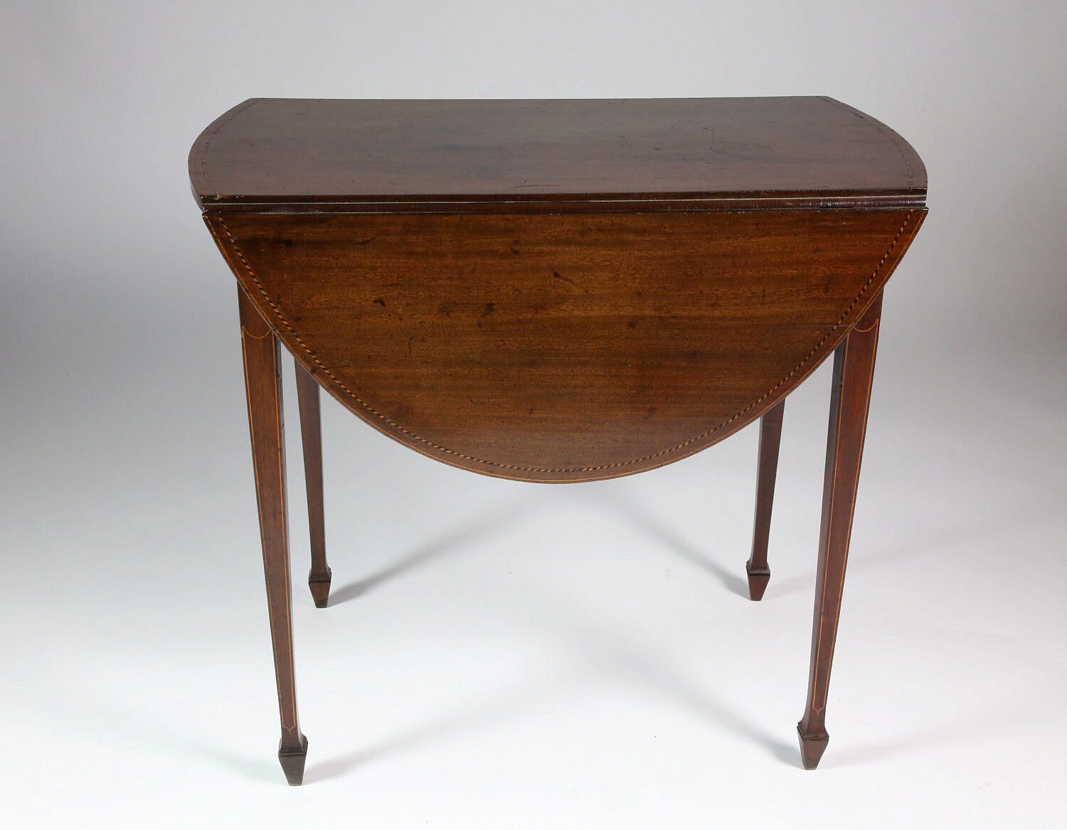George III Inlaid Mahogany Drop Leaf Table, late 18th Century, oval top with stringing, opens on swing out supports above similarly inlaid frieze, on square tapering legs with inlaid fluted stiles, outlined with stringing and ending in spade feet