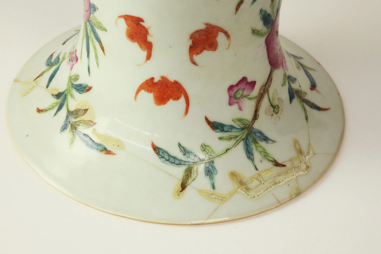 Pair of Antique Chinese Famille Rose Bats and Peaches Porcelain Vases, 19th Century Consign Now DeptAsian Arts/China Trade, Ceramics & Glass, Decorative ArtsSizeHeight 15.5 in. Diameter 8.5 in. Pair of Antique Chinese Famille Rose Bats and Peaches Porcelain Vases, 19th Century, decorated with blossoming tree bearing nine peaches, sacred fungus flanking trunk; below three iron-red bats in flight; one vase with restored lip Height 15.5 in. Diameter 8.5 in. Please note that this auction has ended. Click here for an overview of this auction.