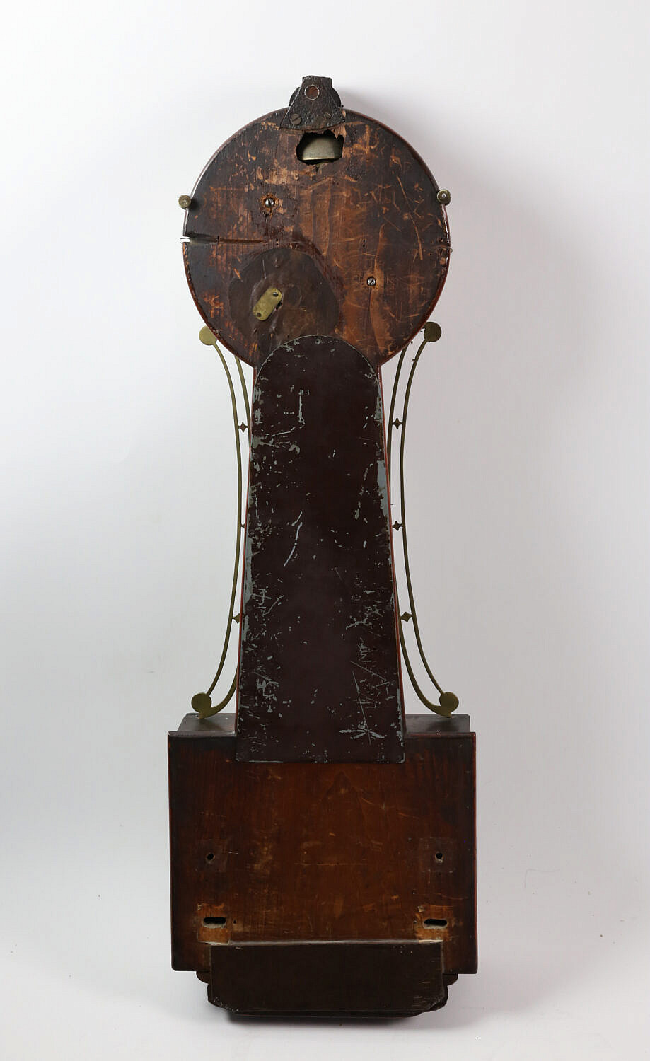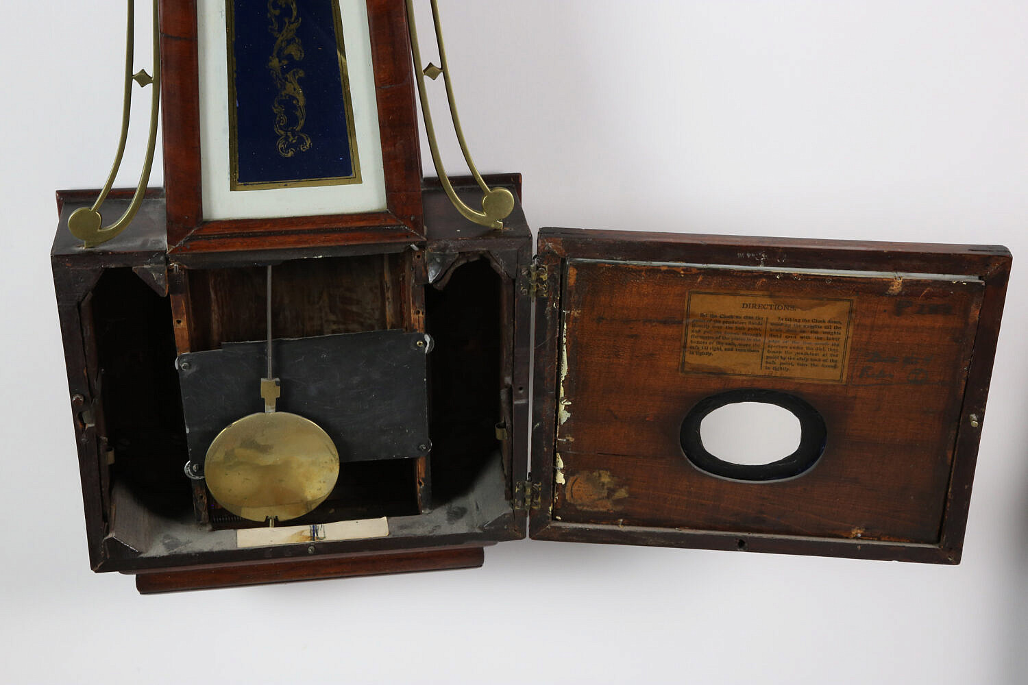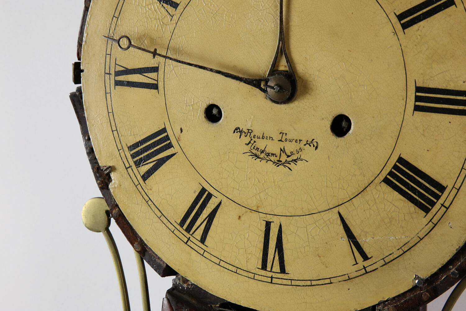 Reuben Tower Patent Timepiece with Alarm or “Banjo” Clock, Hingham, Massachusetts, circa 1822, mahogany case with brass bezel, painted iron roman numeral dial inscribed: “Reuben Tower, Hingham, Mass.” Pierced brass chutes flank black, gold and white verre eglomise panel; pendulum box decorated with Federal eagle and inscribed R. Tower; pencil inscribed “Directions” “Made 1822”