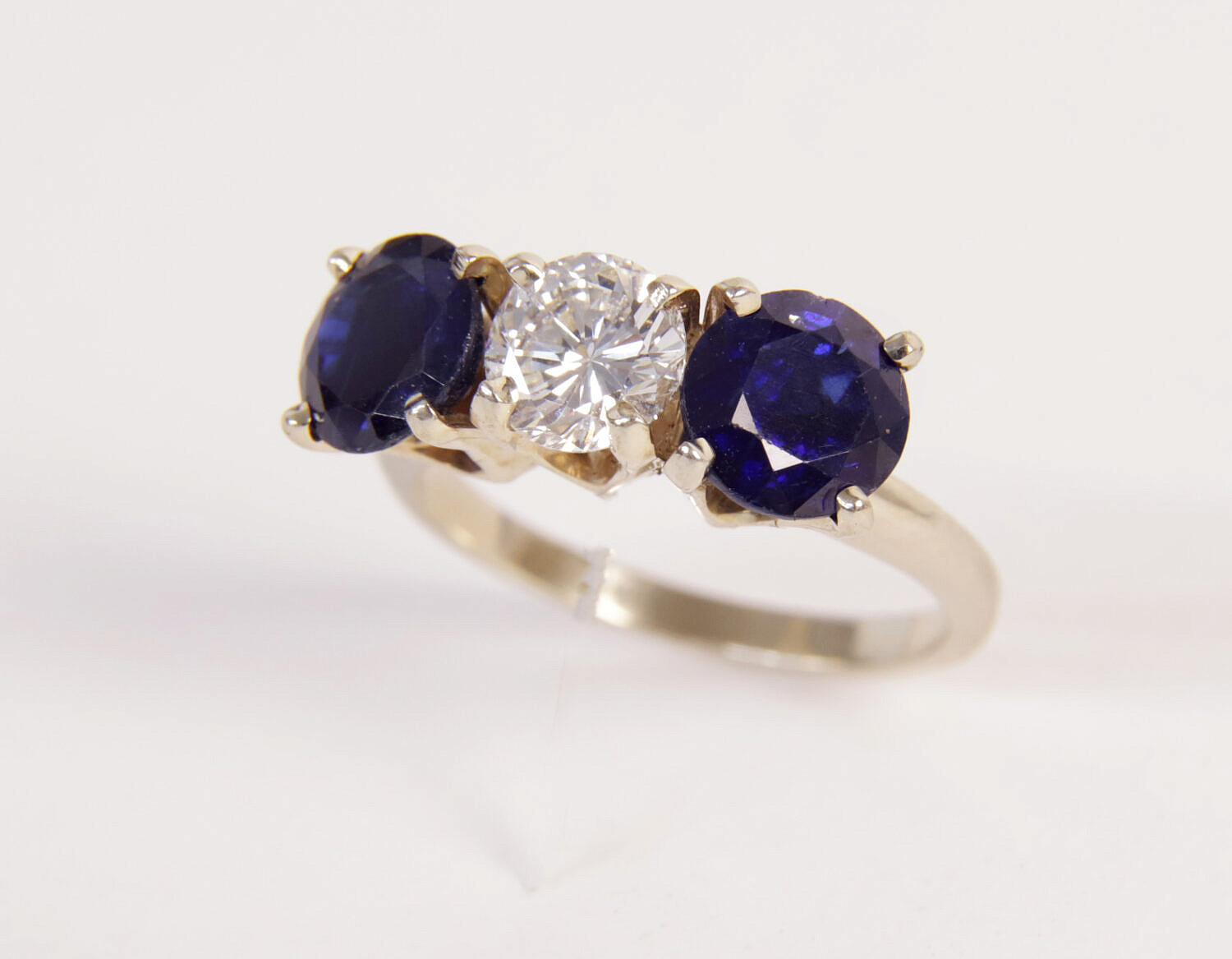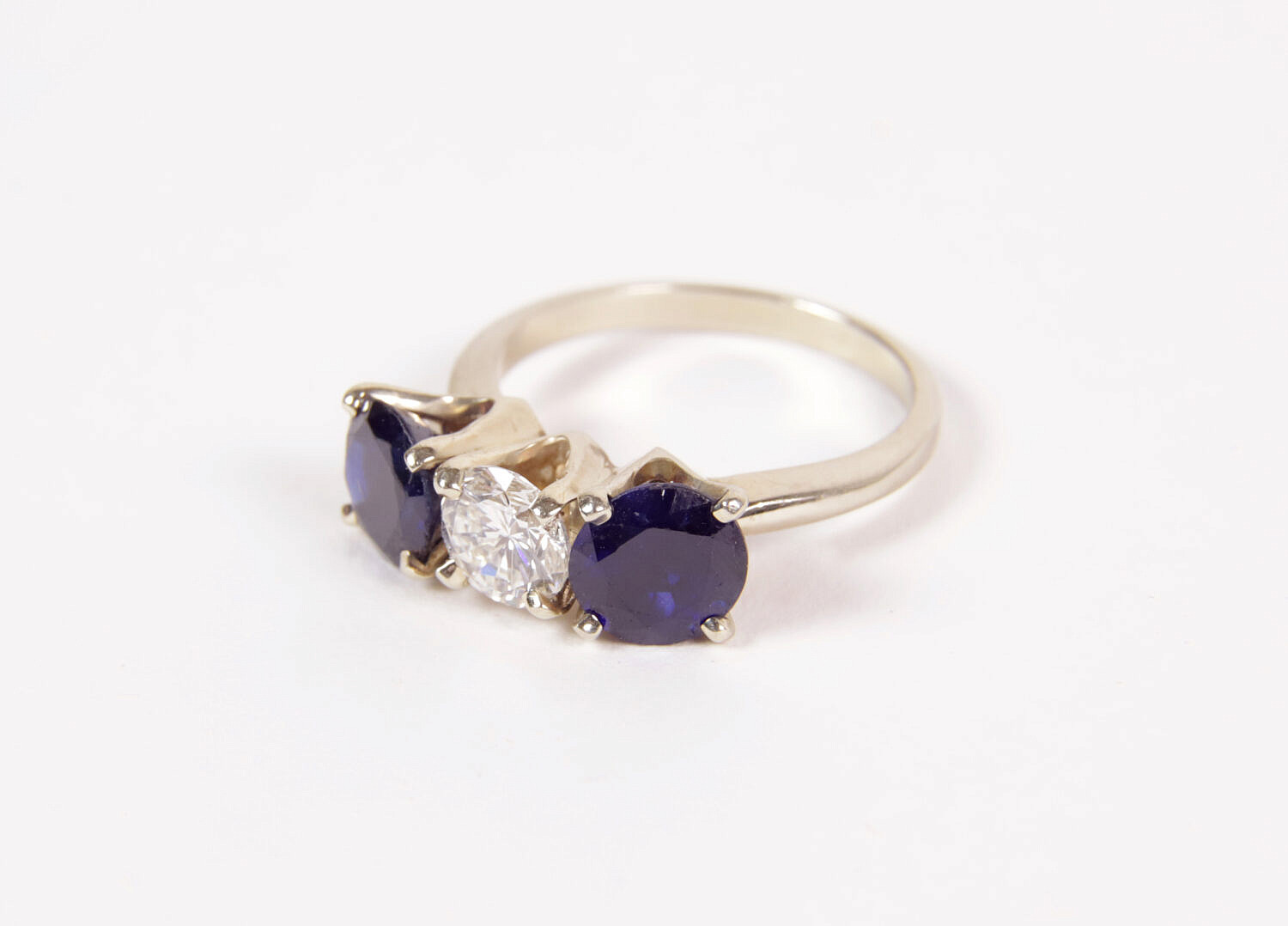 Vintage Sapphire and Diamond Ring, set with a center round brilliant cut diamond with an approximate weight of 0.85 carats exhibiting E/F color and vs clarity, diamond accented by two natural heat treated sapphires weighing approximately 1.25 carats each. The ring mounting is fabricated from 14 karat gold.
