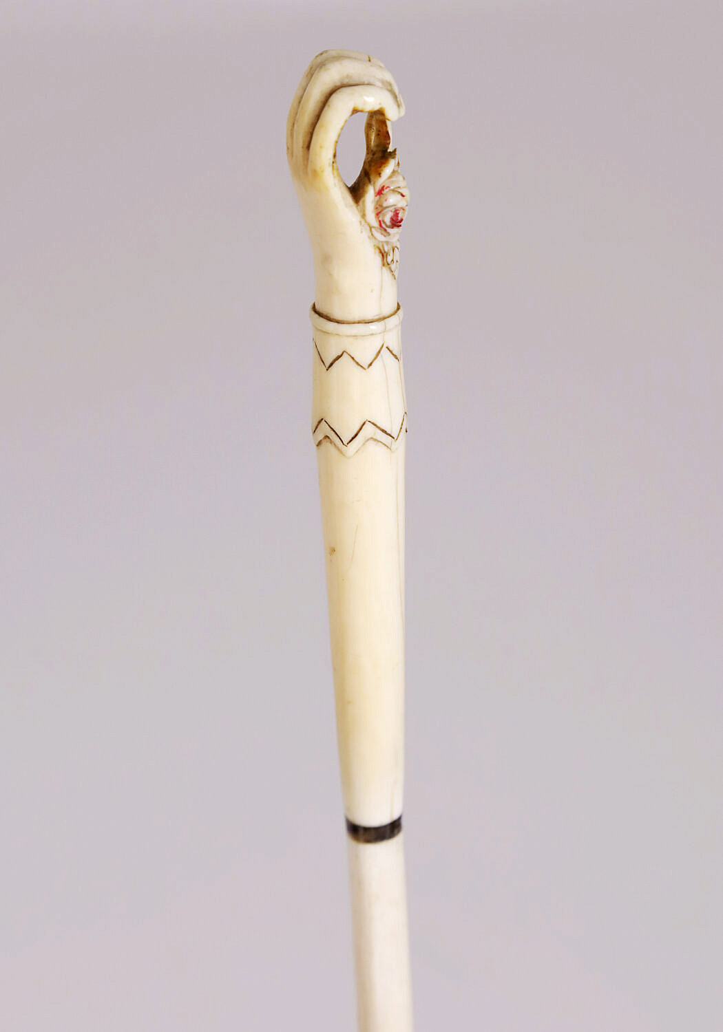 Antique Whale Ivory Lady’s Pointer, 19th Century, with hand carved hand with red stained rose blossom in the palm, scrimshaw cuff, baleen separator