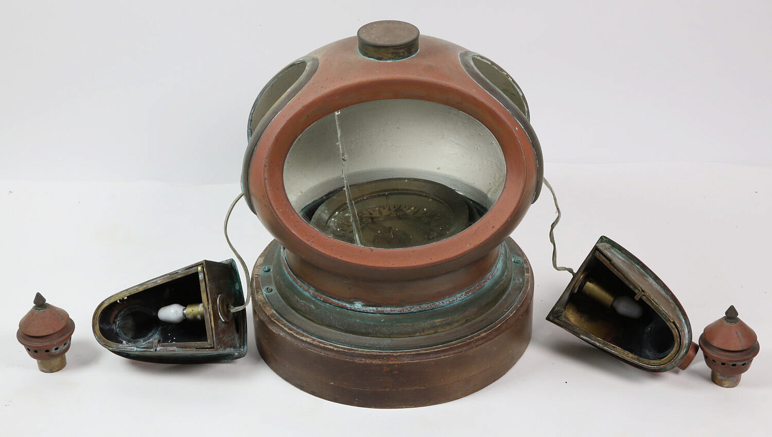 Mariner’s Brass Binnacle Compass, 19th Century, with converted lamps, manufactures label illegible