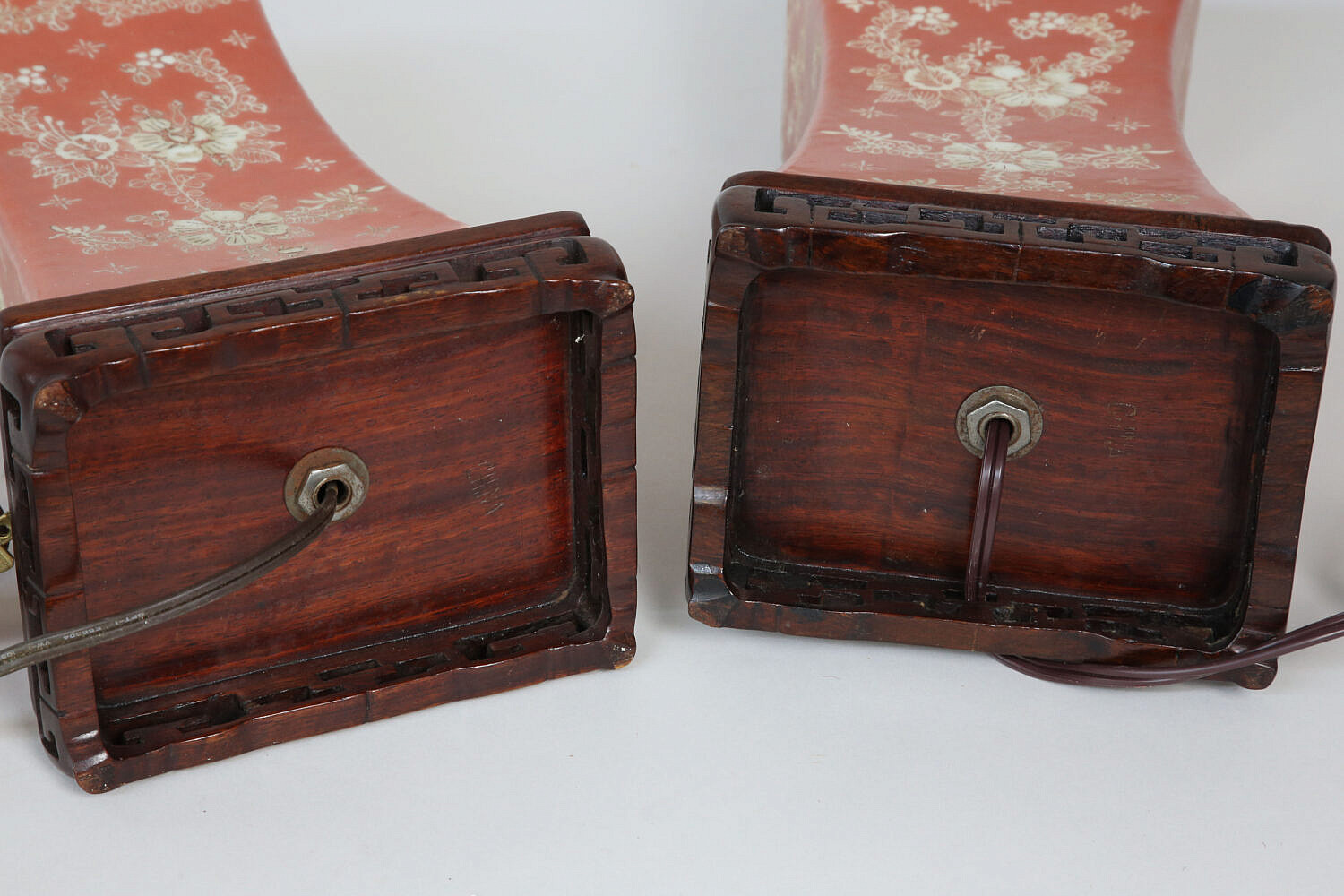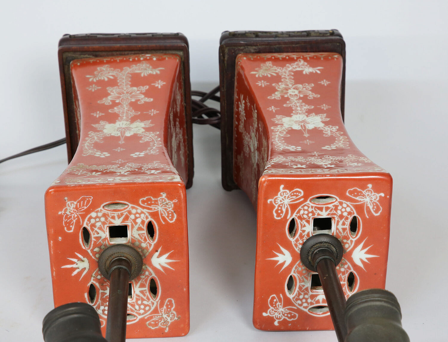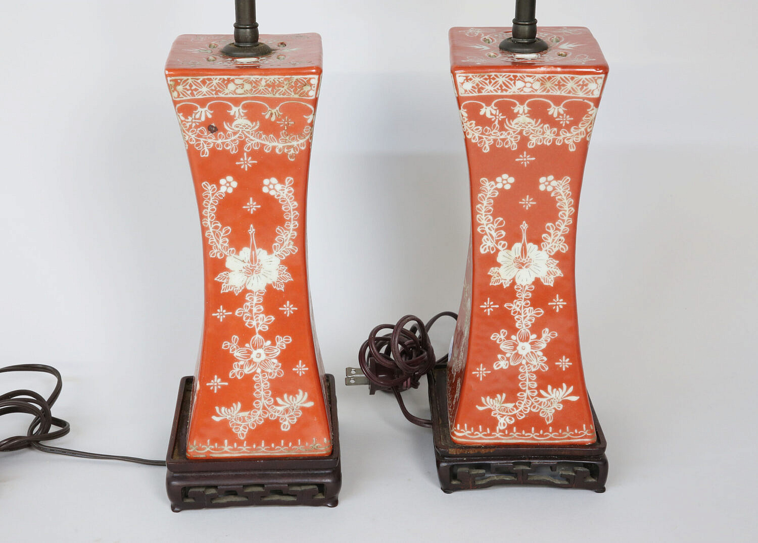 Pair of Antique Chinese Orange and White Porcelain Rectangular Vase Lamps, with flower and butterfly decoration mounted on carved rosewood plinth bases