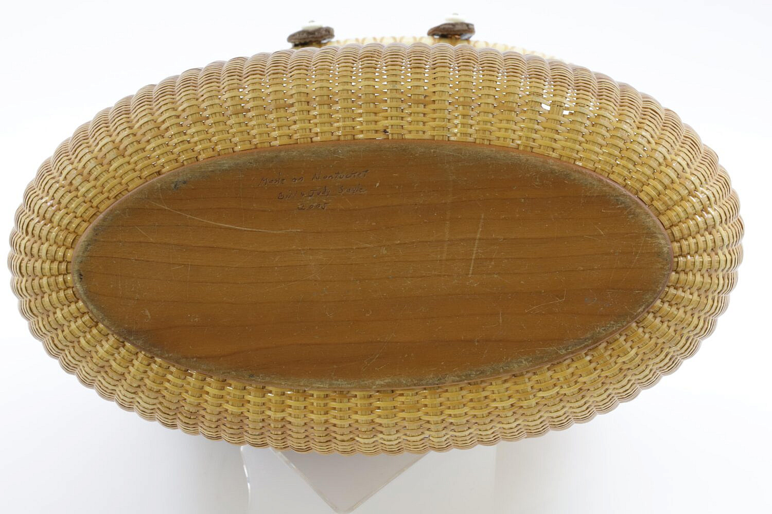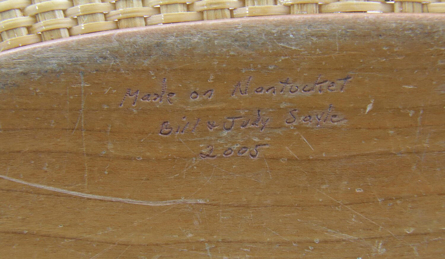 Bill and Judy Sayle Nantucket Oval Open Bucket Basket, circa 2005 Consign Now DeptDecorative Arts, Nantucket BasketsSizeHeight 11.5 in. Width 13 in. Depth 7.5 in. Bill and Judy Sayle Nantucket Oval Open Bucket Basket, circa 2005, with braided leather handles, initialed owners scrimshaw nameplate and inscribed on base, Made on Nantucket Bill & Judy Sayle, 2005 Height 11.5 in. Width 13 in. Depth 7.5 in. Please note that this auction has ended. Click here for an overview of this auction.