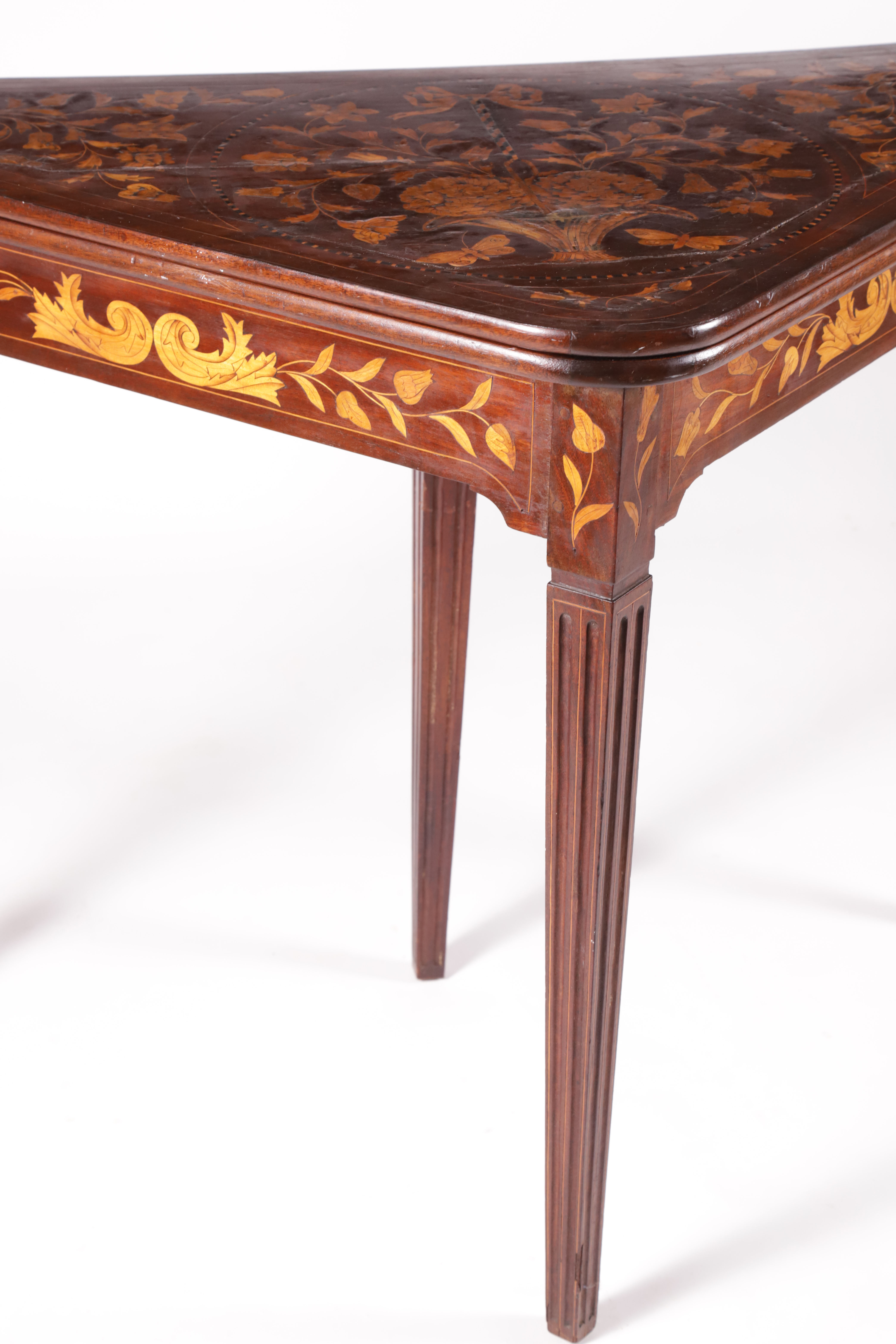 Marquetry Inlaid Flip Top Corner Game Table, 18th Century Consign Now DeptFurnitureSizeHeight 28 in. Width 40 in. Depth 20 in. Marquetry Inlaid Flip Top Corner Game Table, 18th Century, with turquoise felt playing surface, fluted legs Height 28 in. Width 40 in. Depth 20 in. Please note that this auction has ended. Click here for an overview of this auction.