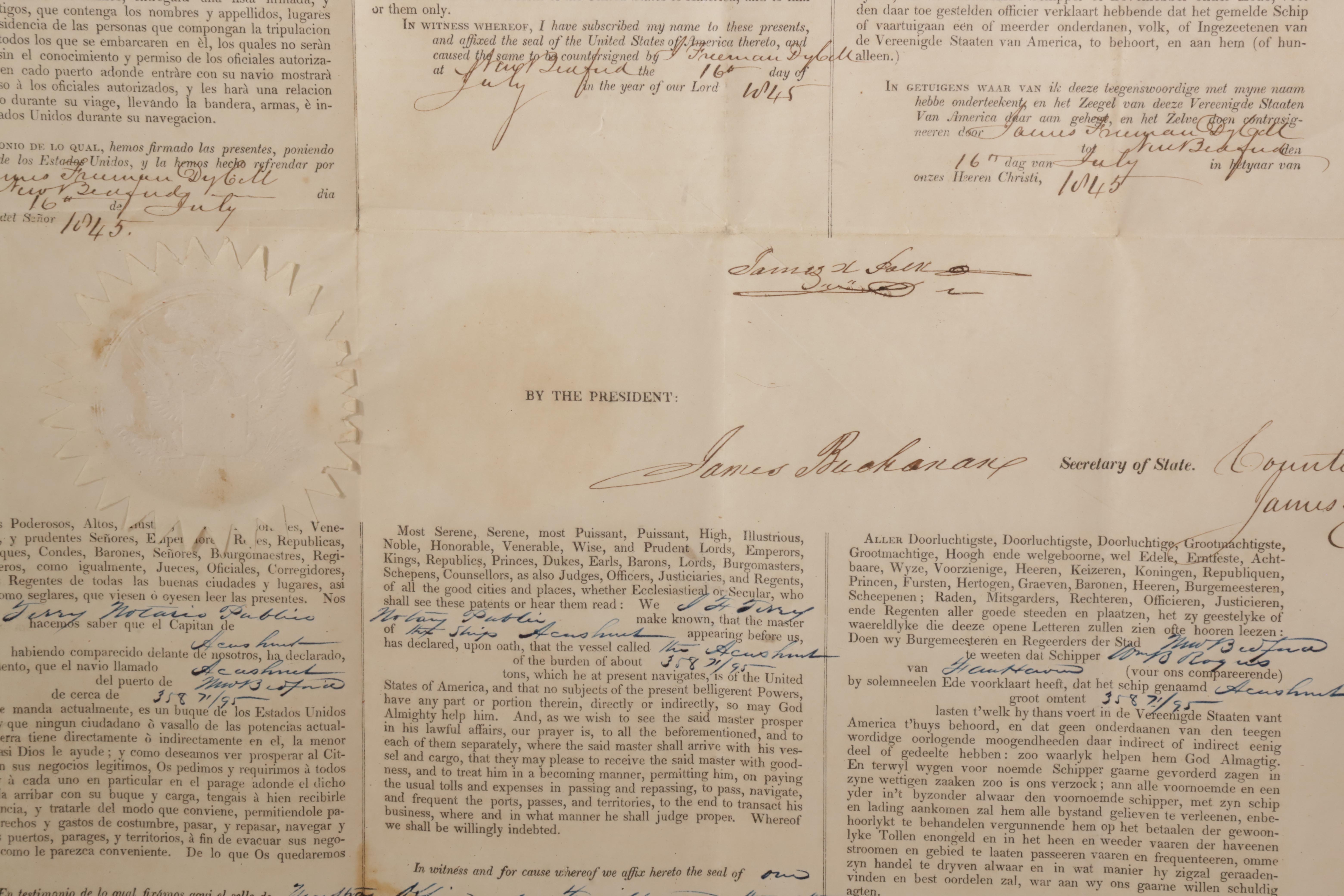 President Buchanan Signed Whaling Documents, circa 1854 Consign Now DeptDecorative ArtsSize15 in. x 20 in. Framed 26.5 in. x 28 in. President Buchanan Signed Whaling Documents, circa 1854, for William B. Rogers, Acushnet, New Haven, destination to the Indian Ocean 15 in. x 20 in. Framed 26.5 in. x 28 in. Please note that this auction has ended. Click here for an overview of this auction.
