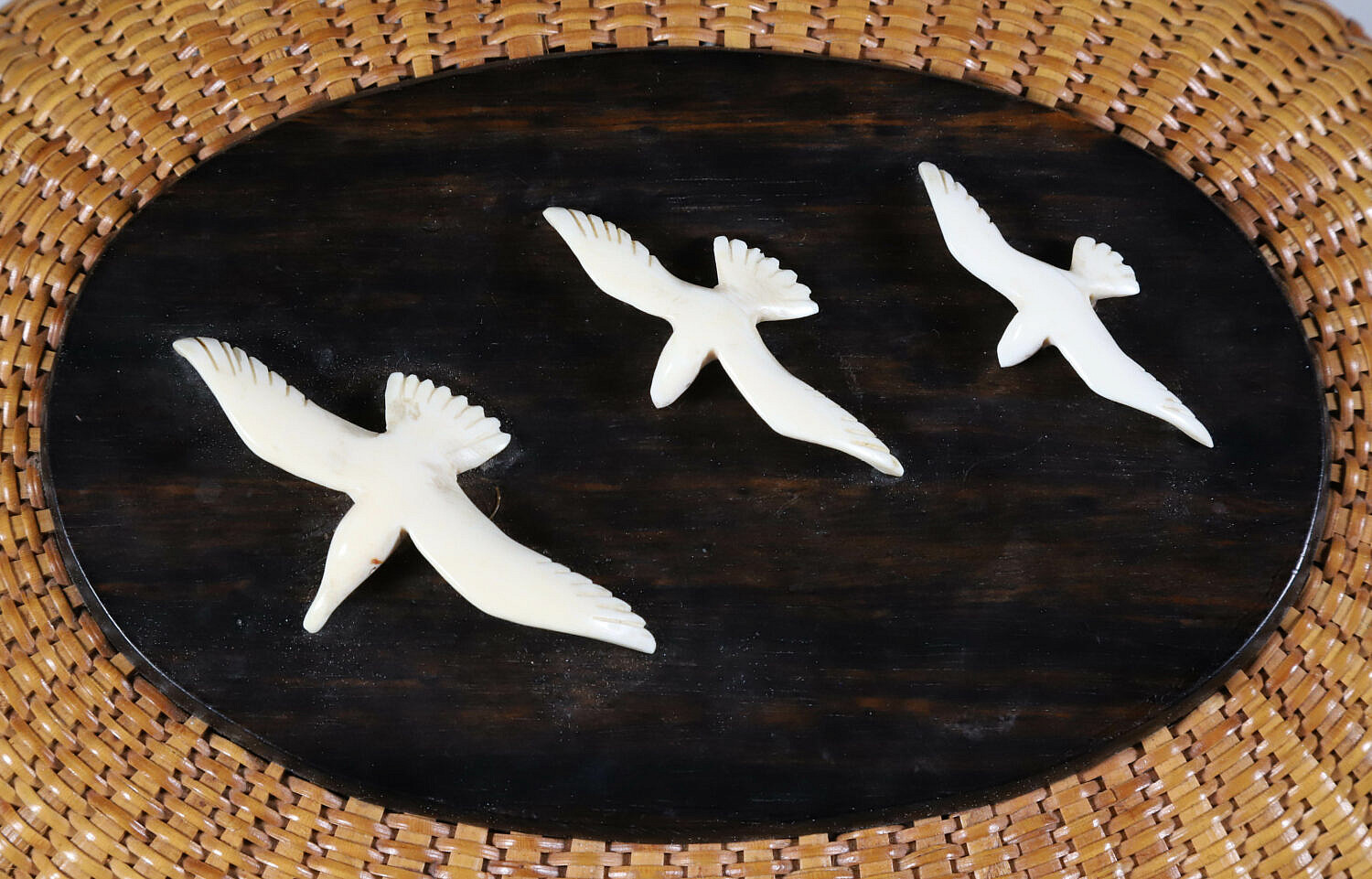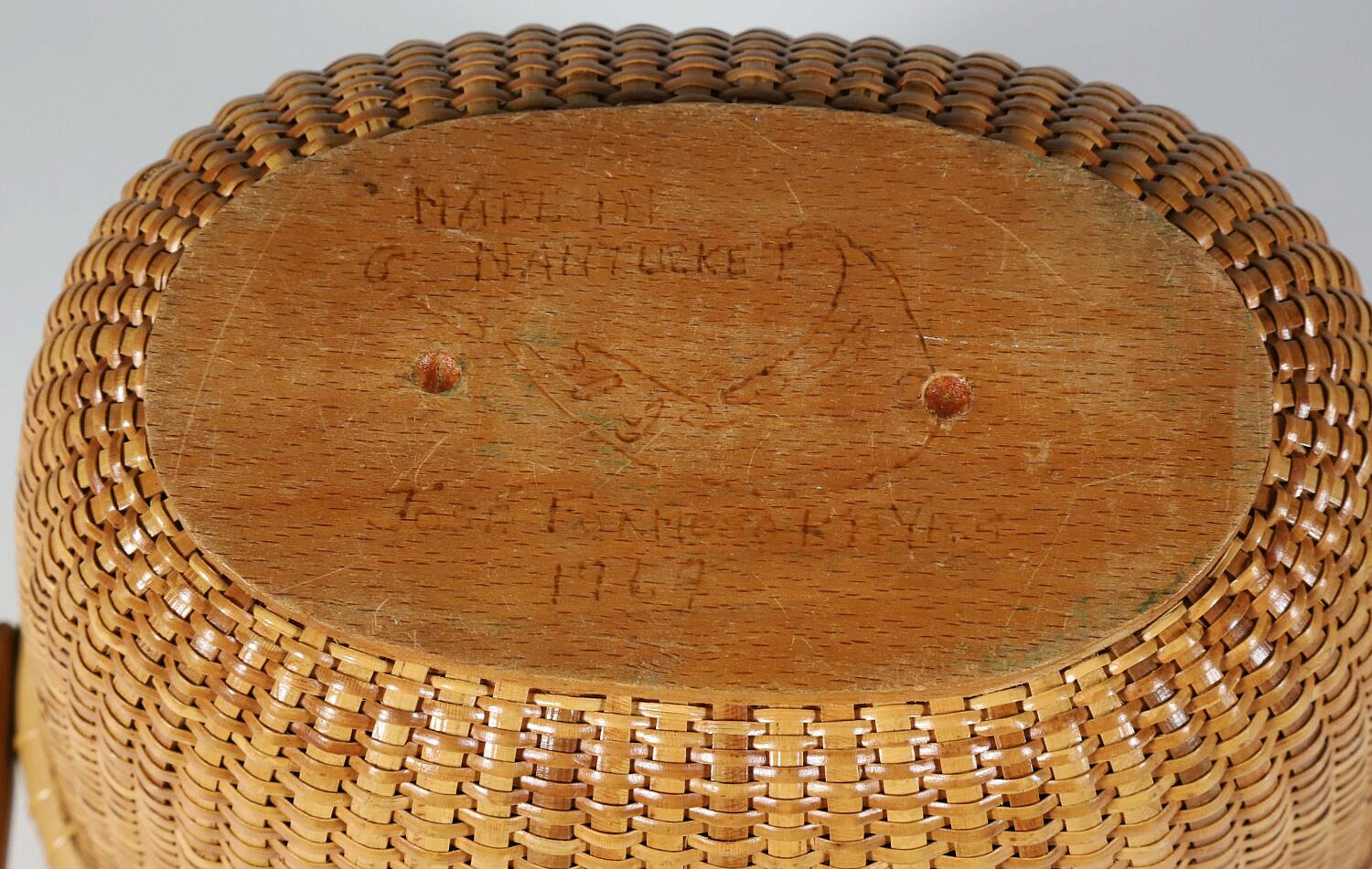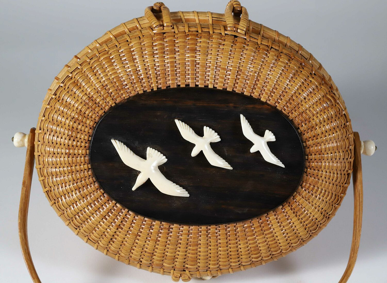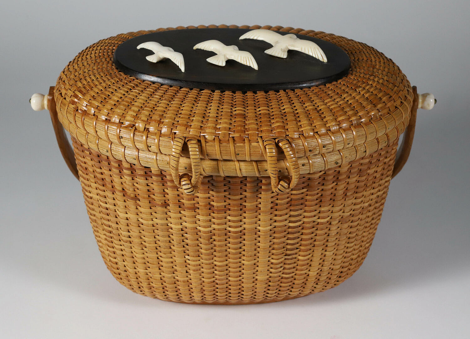 Jose Formoso Reyes (1902-1980) Nantucket Friendship Basket, circa 1967, covered basket with shaped swing handle, top surmounted with three seagulls in flight on a tropical wood plaque; the cherrywood bottom plate inscribed Made in Nantucket, Jose Formoso Reyes, 1967, with outline of Nantucket map