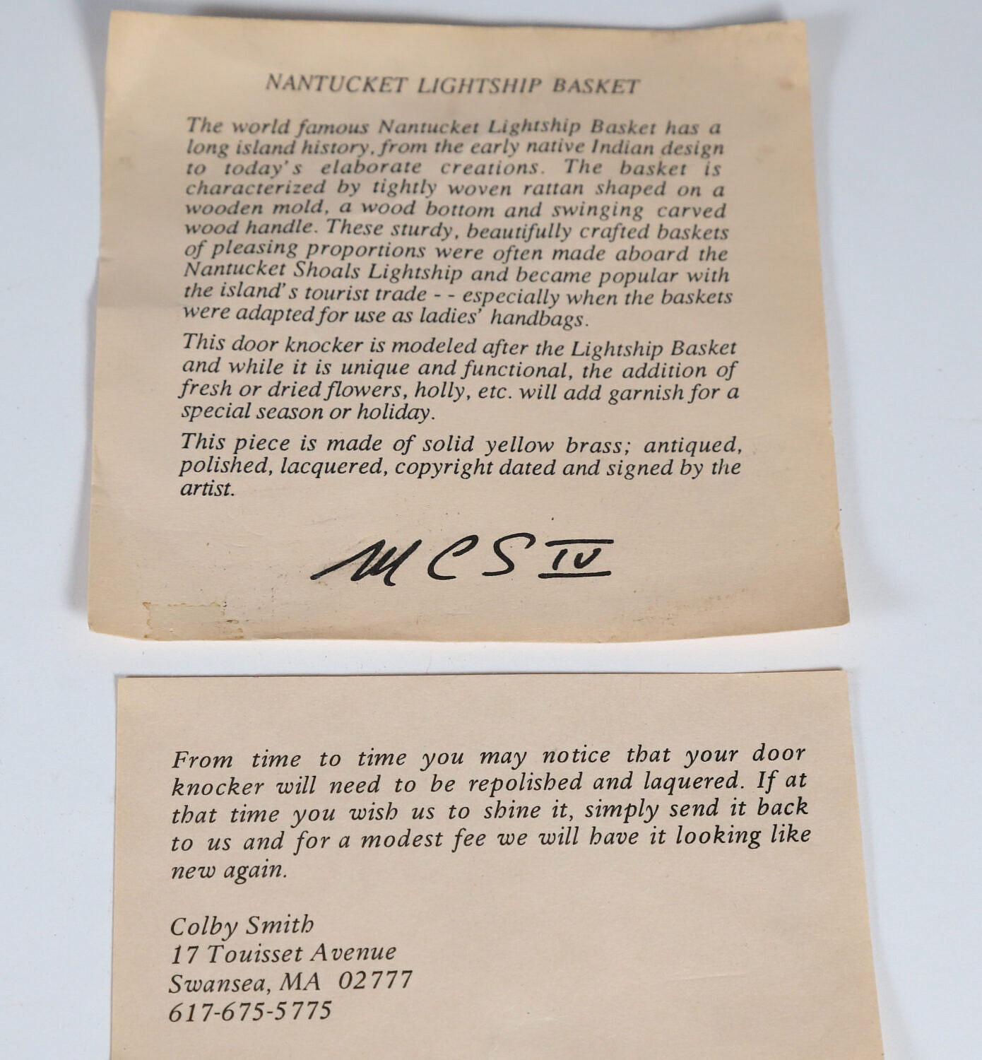 Vintage Brass Nantucket Basket Door Knocker, Signed “MCS 87” On Reverse Consign Now DeptDecorative Arts, Nantucket BasketsSizeHeight 4.5 in. Width 6.25 in. Vintage Brass Nantucket Basket Door Knocker, Signed “MCS 87” On Reverse, with original box, unused Height 4.5 in. Width 6.25 in. Please note that this auction has ended. Click here for an overview of this auction.