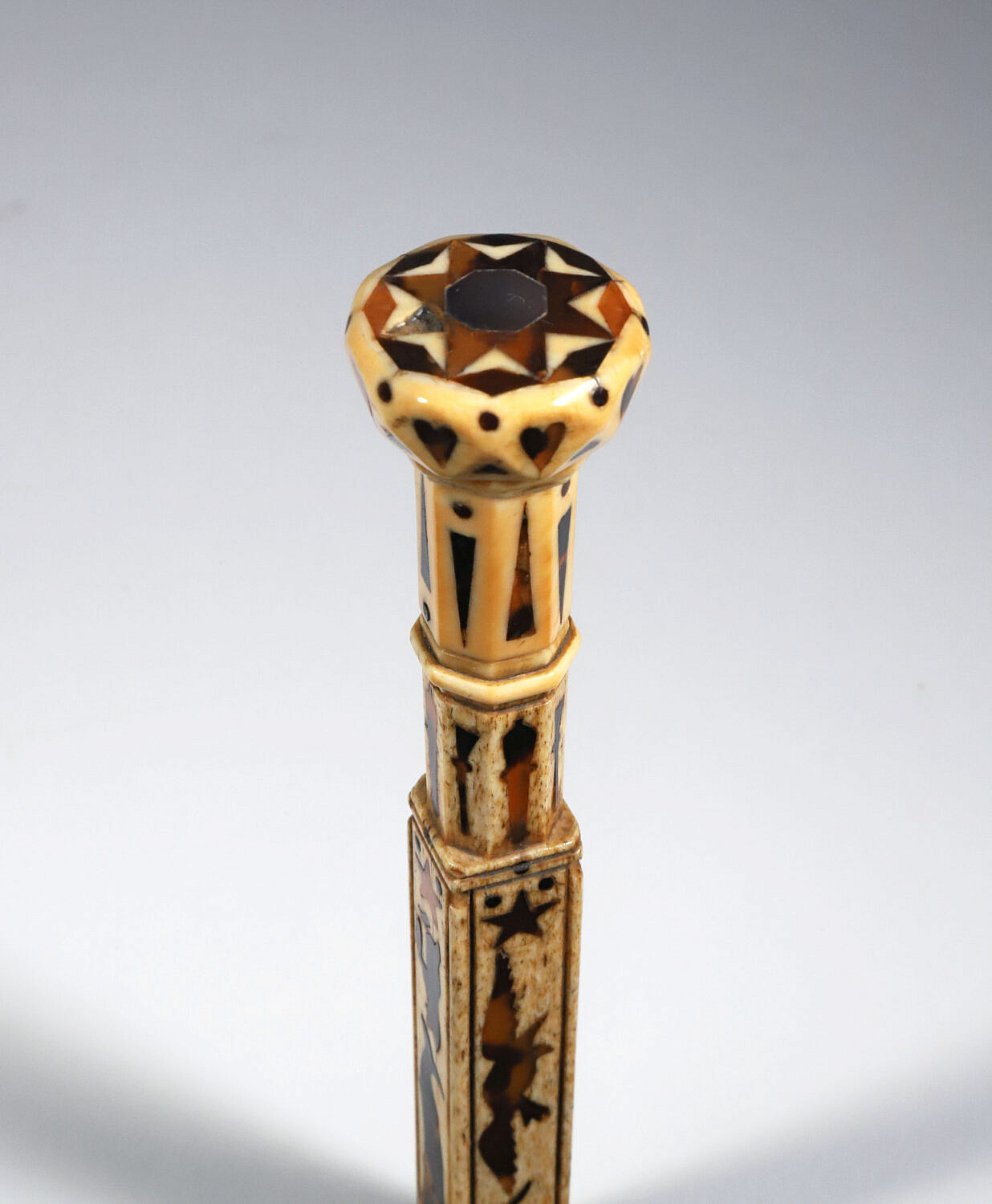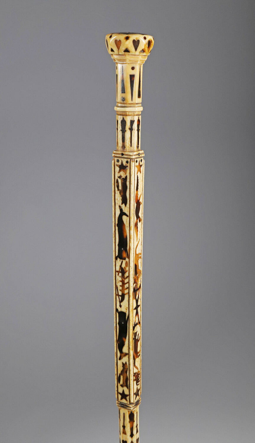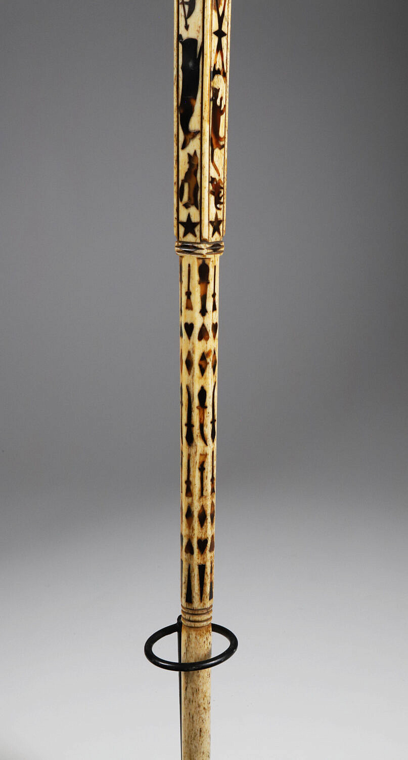 American Whaler Made Crown Grip Walking Stick, early 19th Century, antique whale ivory carved crown grip, whale bone paneled shaft, both inlaid with tortoise, whaling scene, hearts, eagle, foxes, cannon, rifles, sabers, horses, etc.