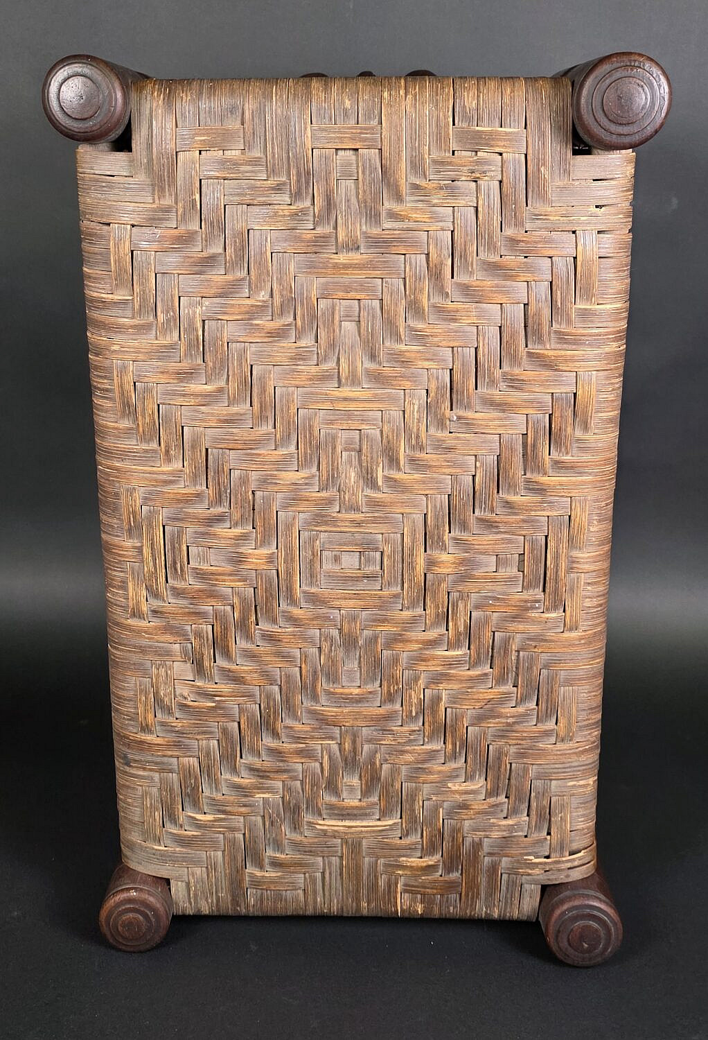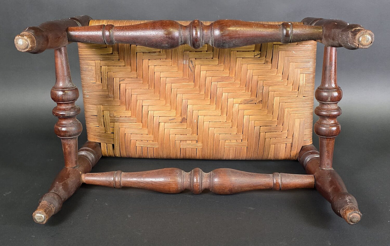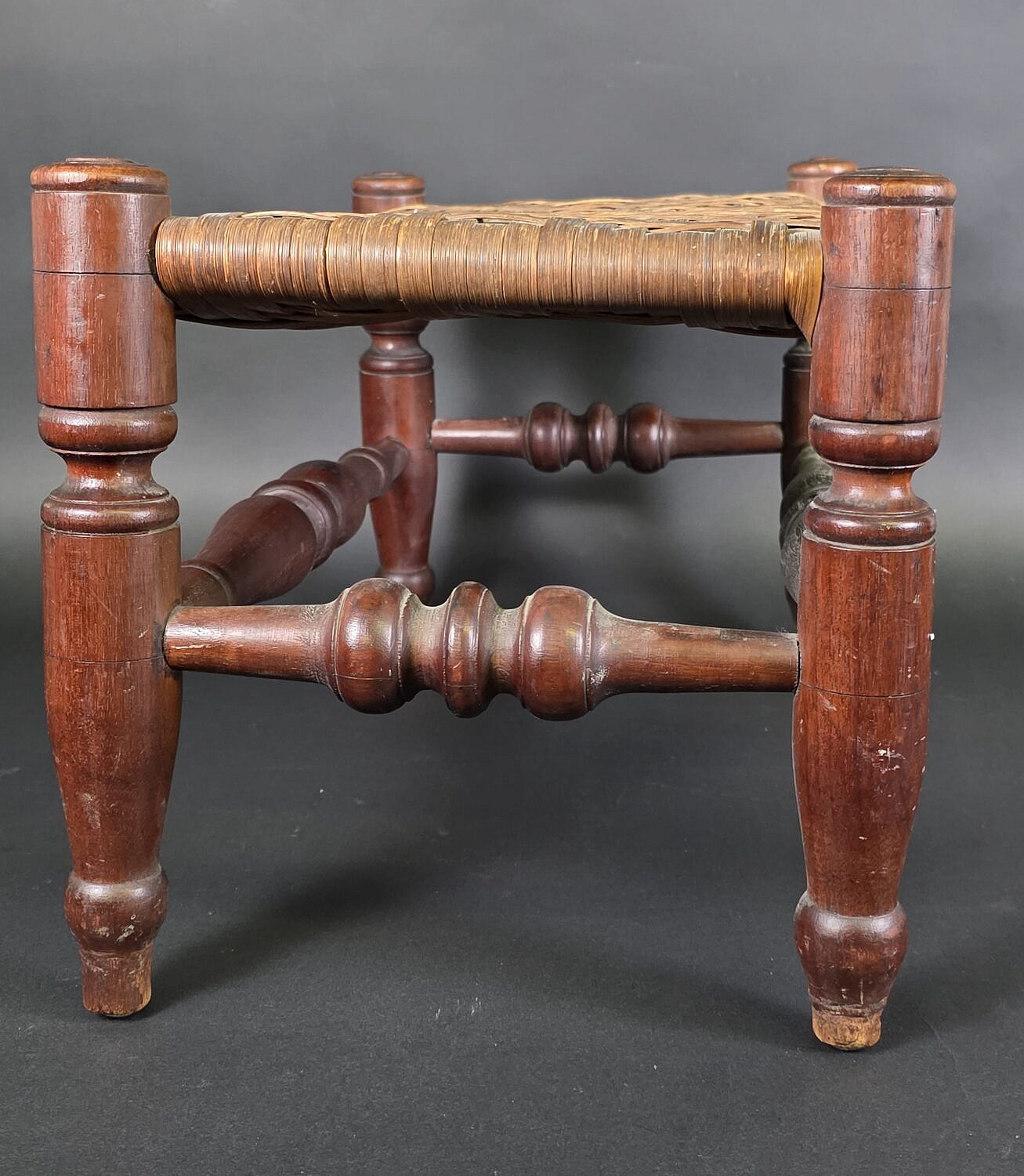Antique American Rush Seat Mahogany Sheraton Stool, 19th century, with unique chair style turned stretchers and spindles.