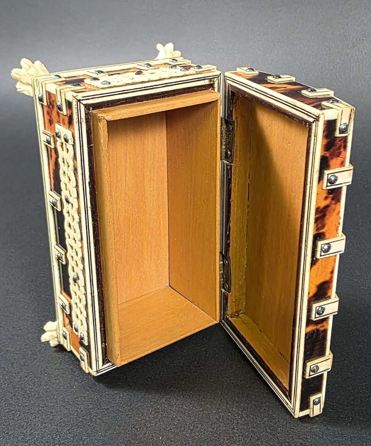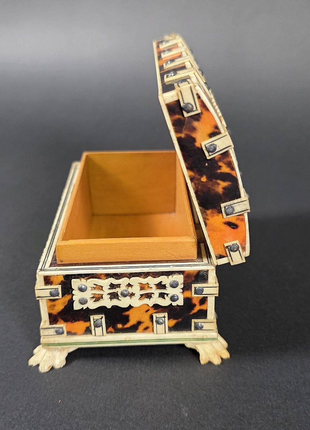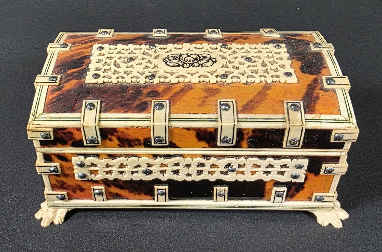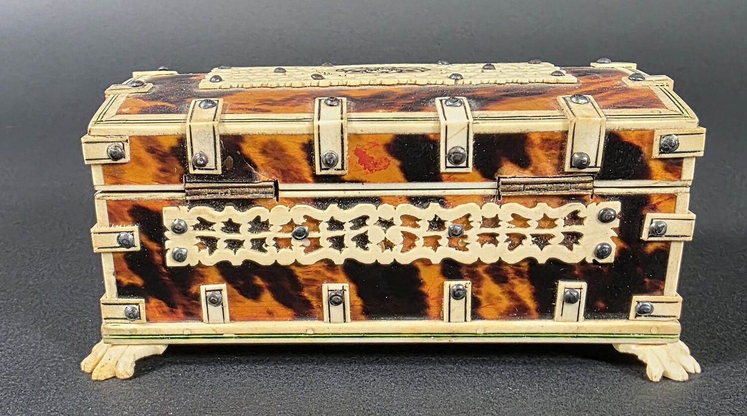 Antique British Regency Tortoiseshell Box, 19th Century Consign Now DeptDecorative ArtsSizeHeight 2.25 in. Width 5 in. Depth 3 in. Antique British Regency Tortoiseshell Box, 19th Century, with elaborately pierced bone decoration throughout on carved paw feet. Height 2.25 in. Width 5 in. Depth 3 in. Please note that this auction has ended. Click here for an overview of this auction.