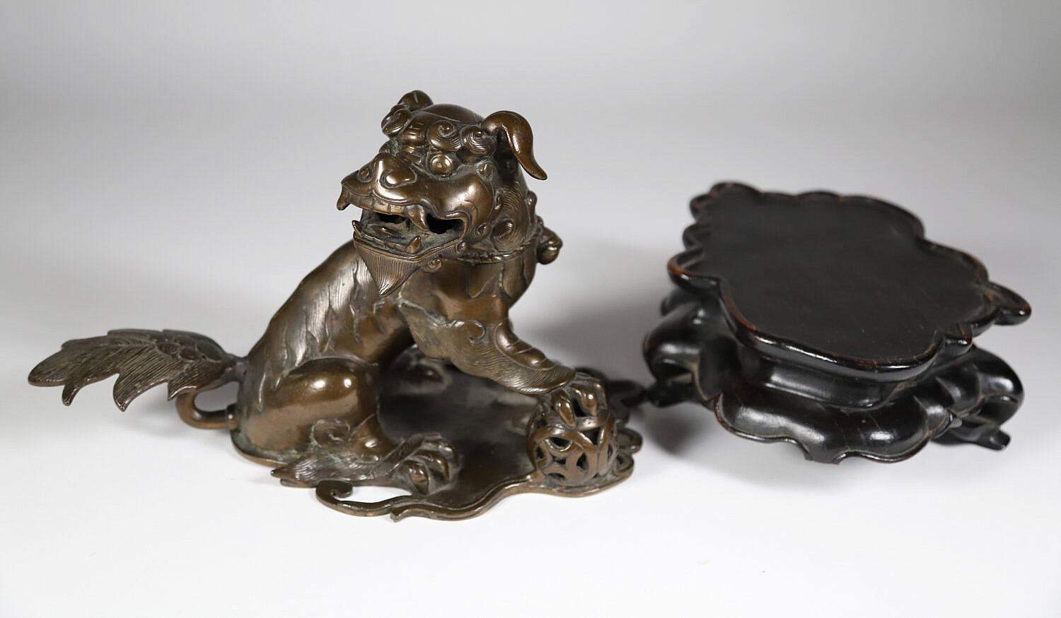 Antique Chinese Bronze Foo Dog Sensor, 18th / 19th Century, on elaborately carved teakwood base