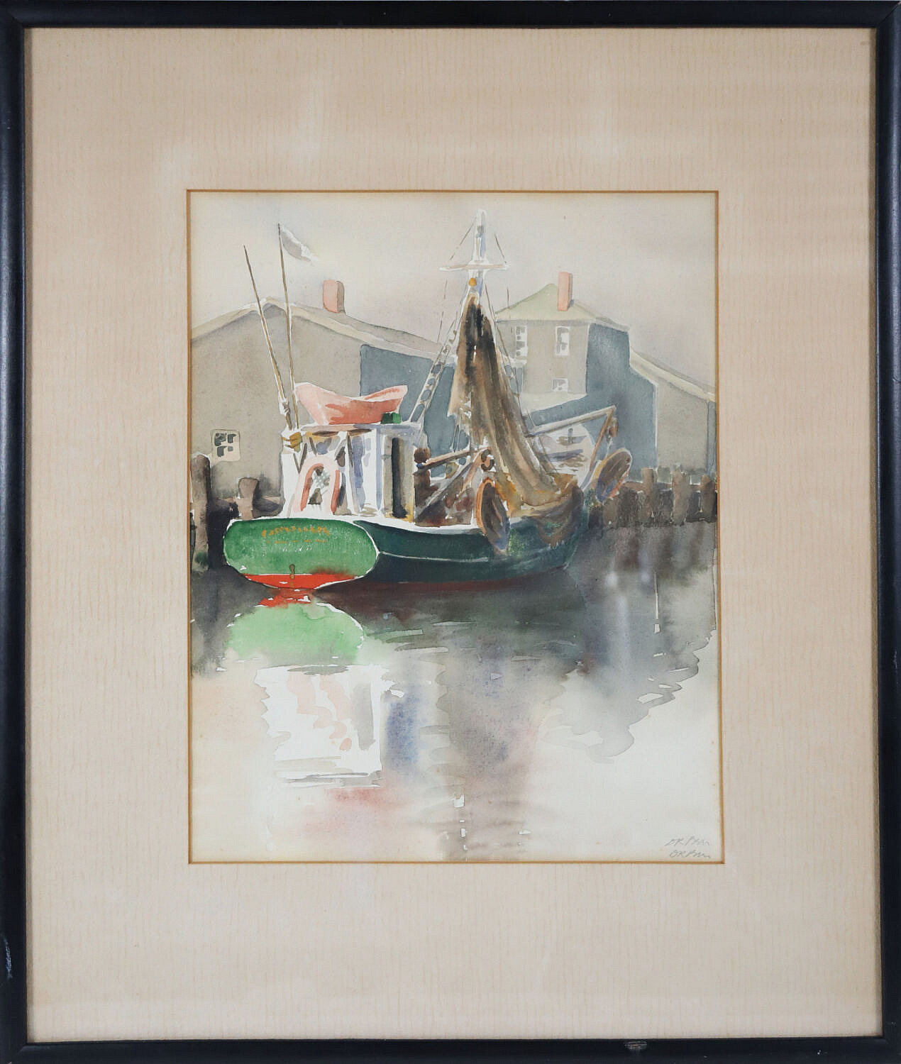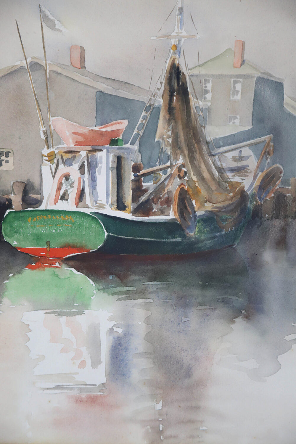 Doris and Richard Beer Watercolor on Paper “Green Hulled Fishing Boat Docked”