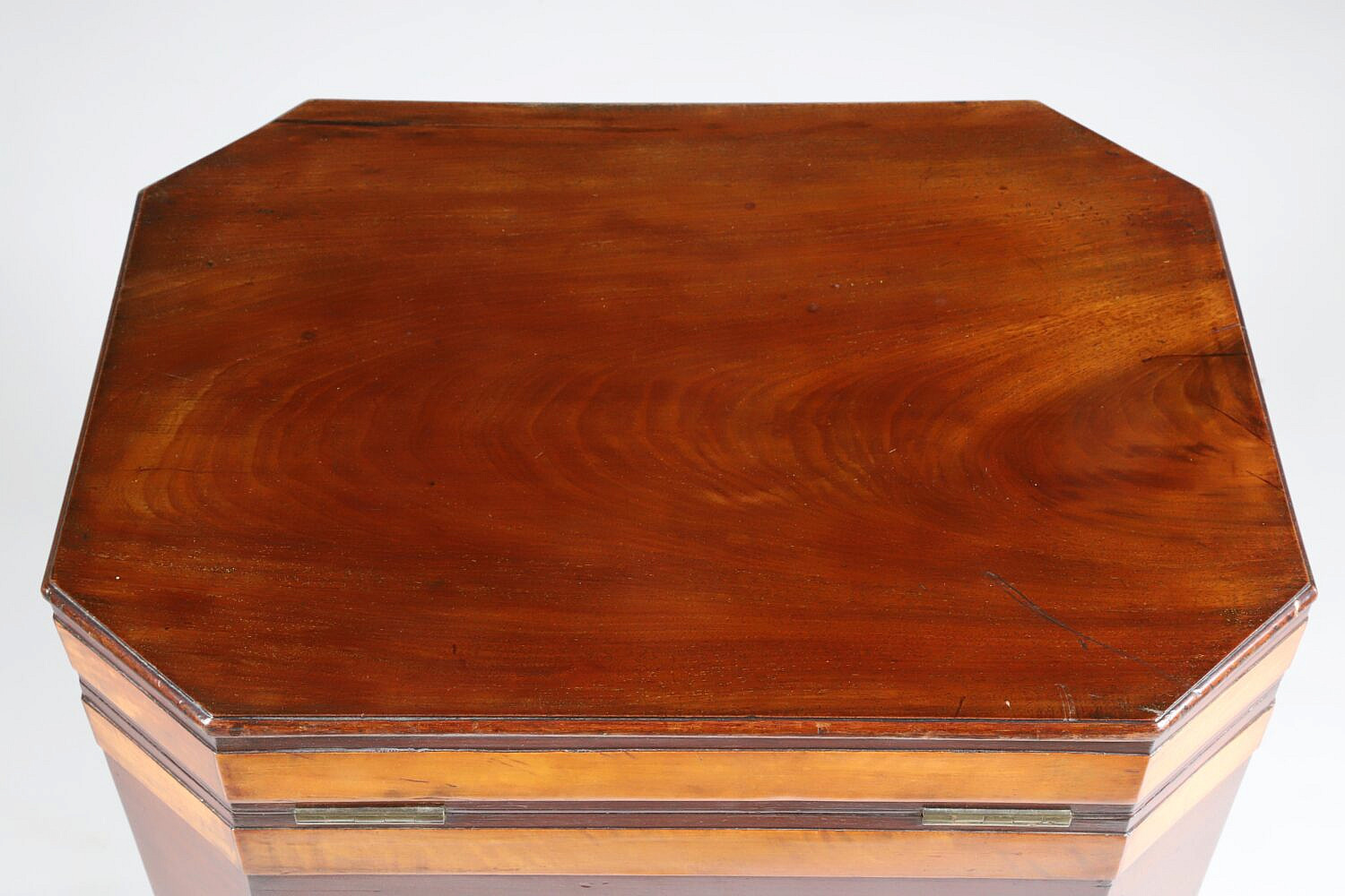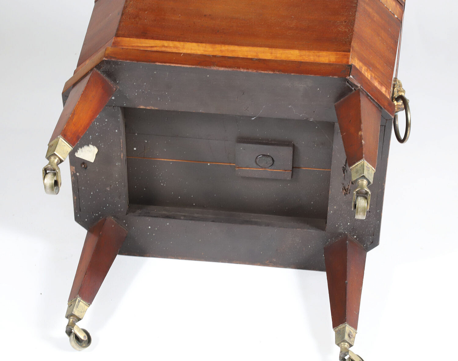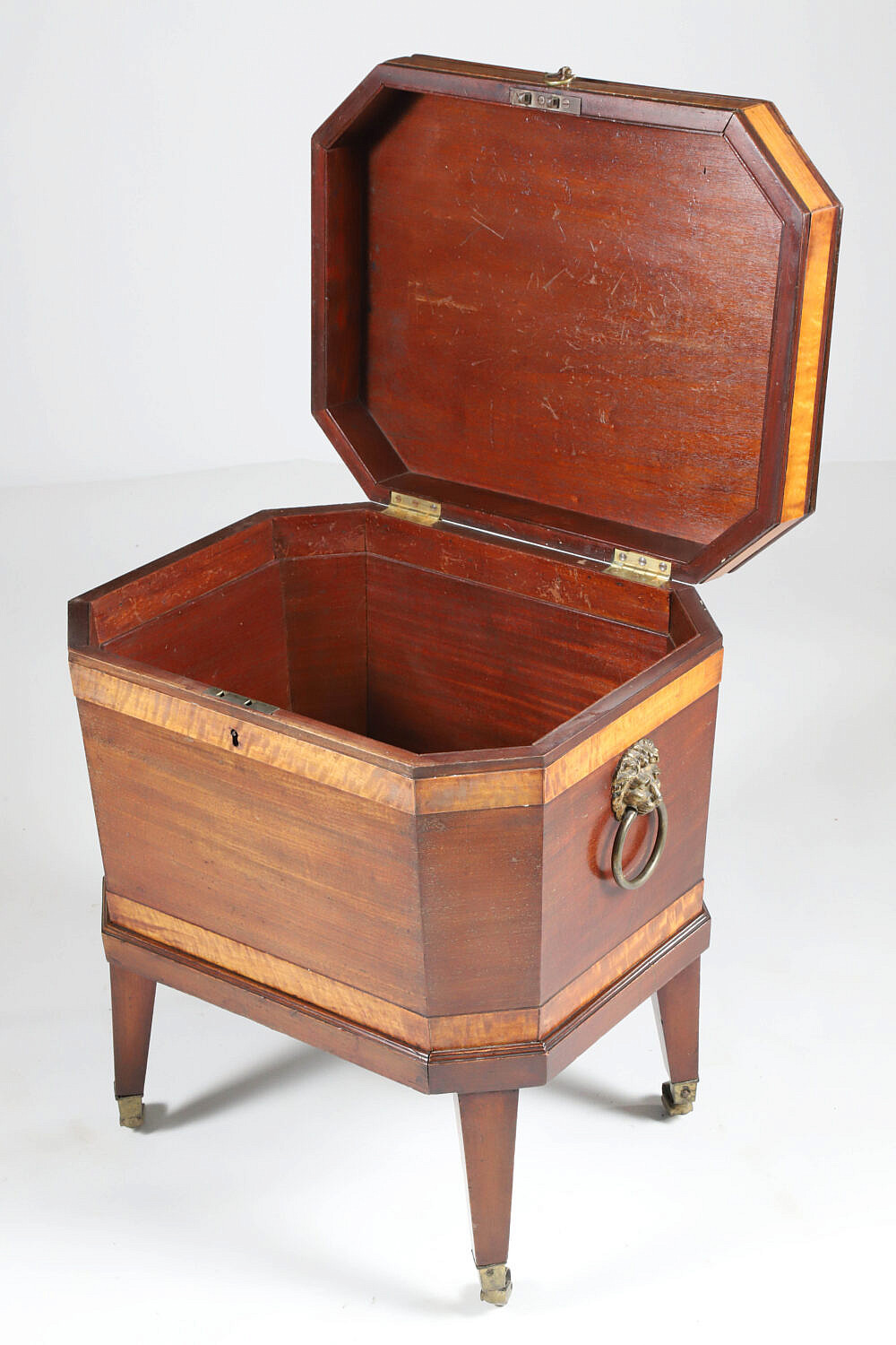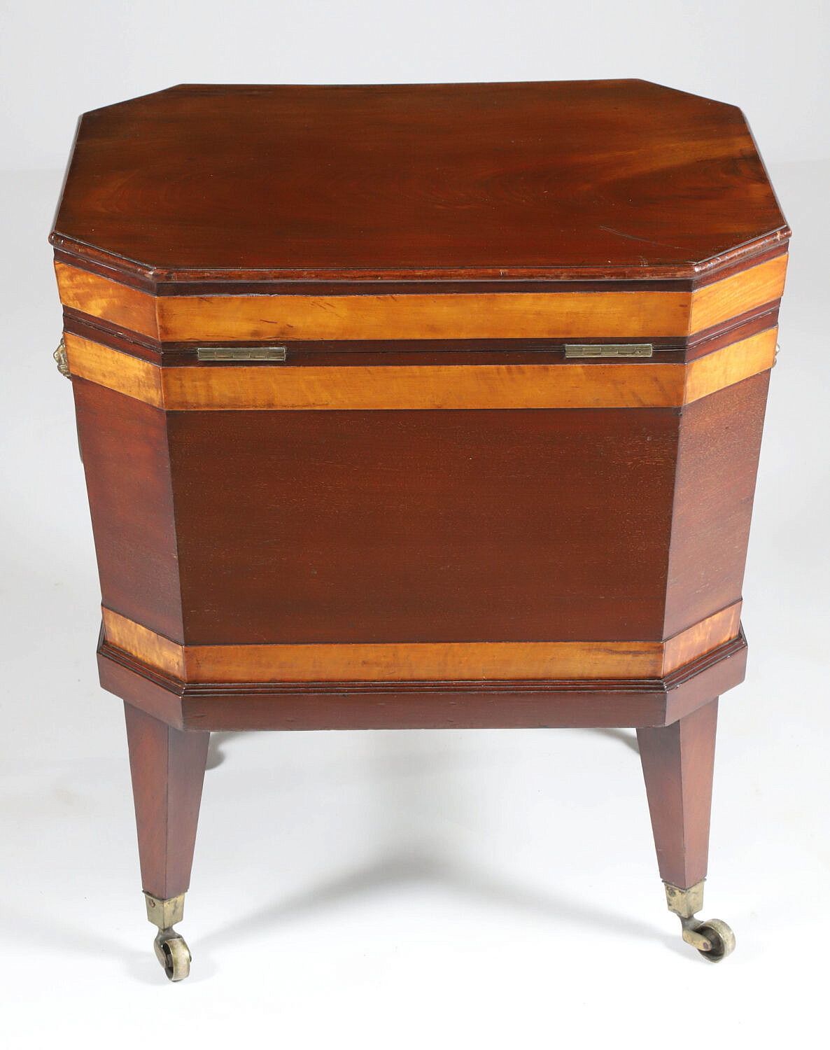 George III Mahogany and Tiger Maple Banded Cellarette, early 19th Century, applied brass repousse lion’s head handles, tapering legs ending in brass casters