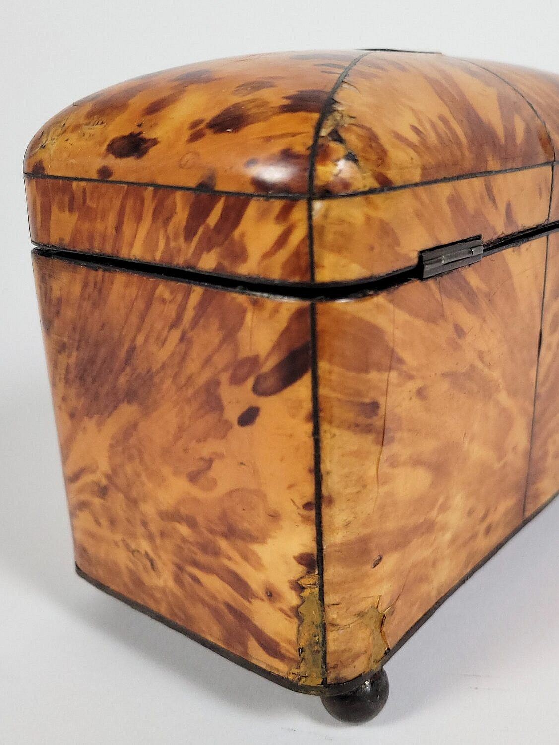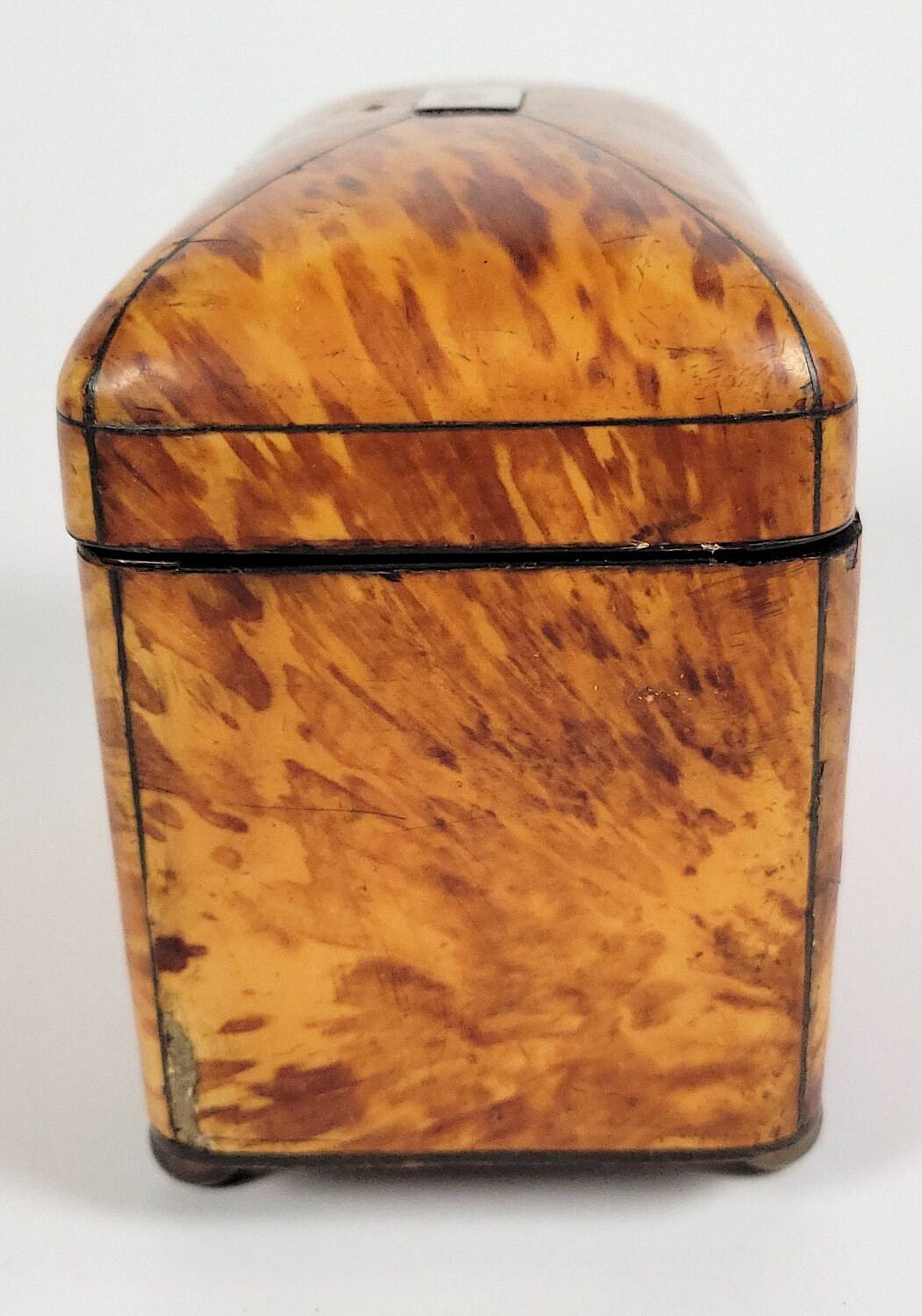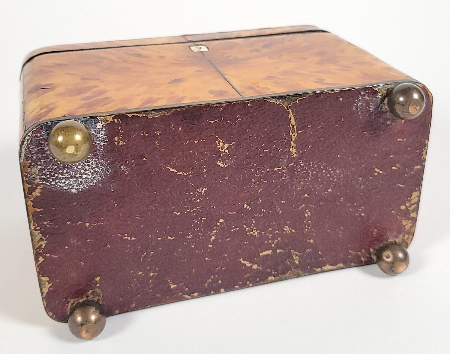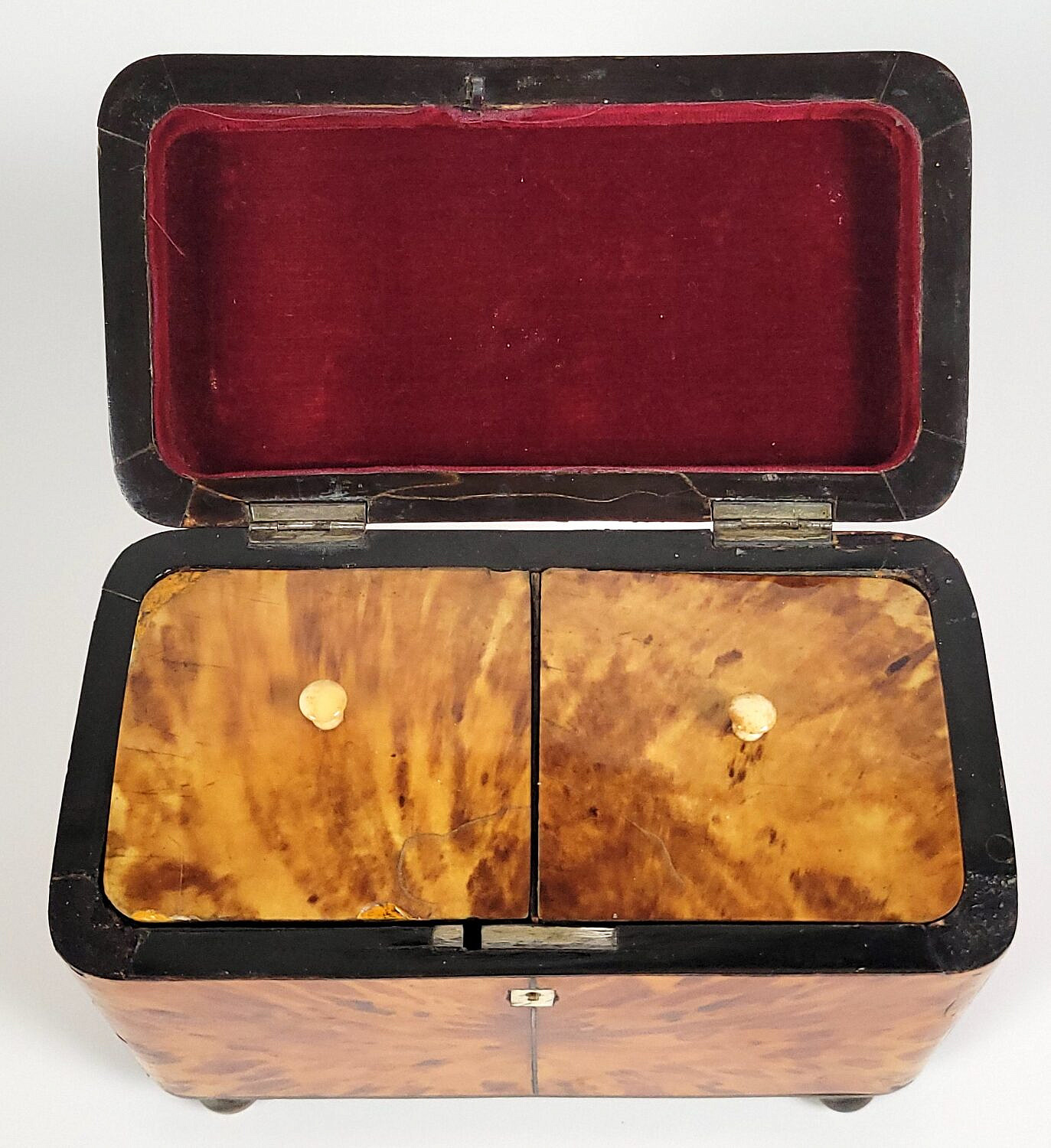 English Regency Antique Tortoiseshell Tea Caddy, 19th Century Consign Now DeptDecorative ArtsSizeHeight 5.5 in. Width 6.75 in. Depth 3.75 in. English Regency Antique Tortoiseshell Tea Caddy, 19th Century, domed lid, line inlay with initials engraved on plaque, dual compartments with matching lids, on bun feet. Height 5.5 in. Width 6.75 in. Depth 3.75 in. Please note that this auction has ended. Click here for an overview of this auction.