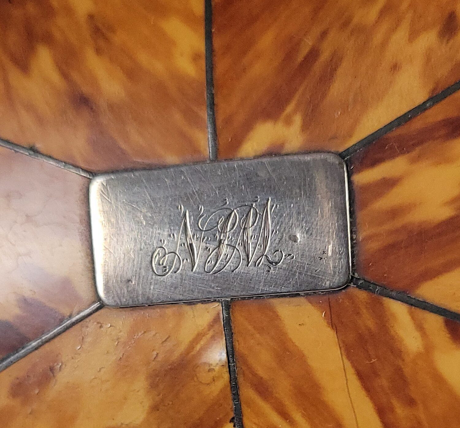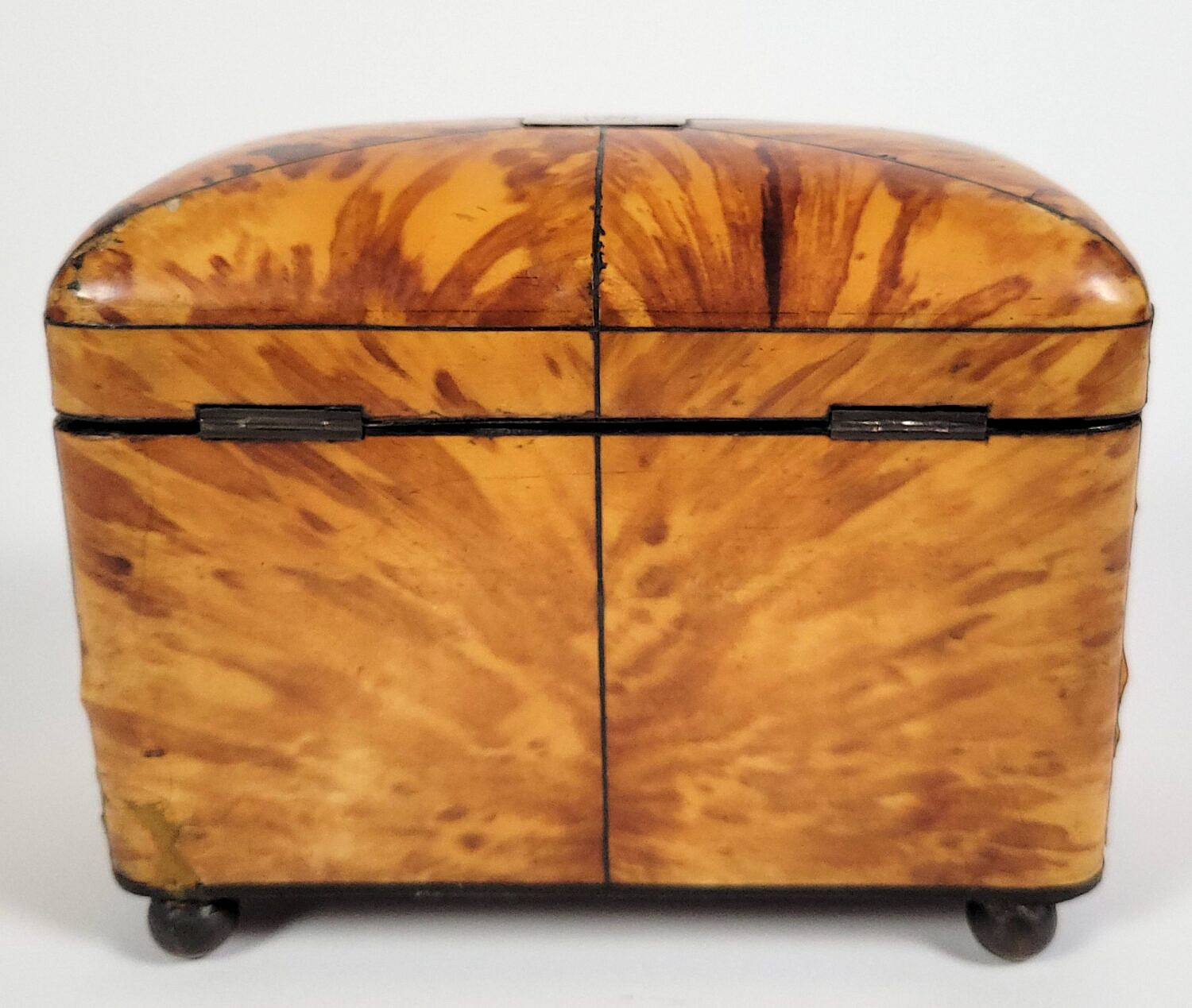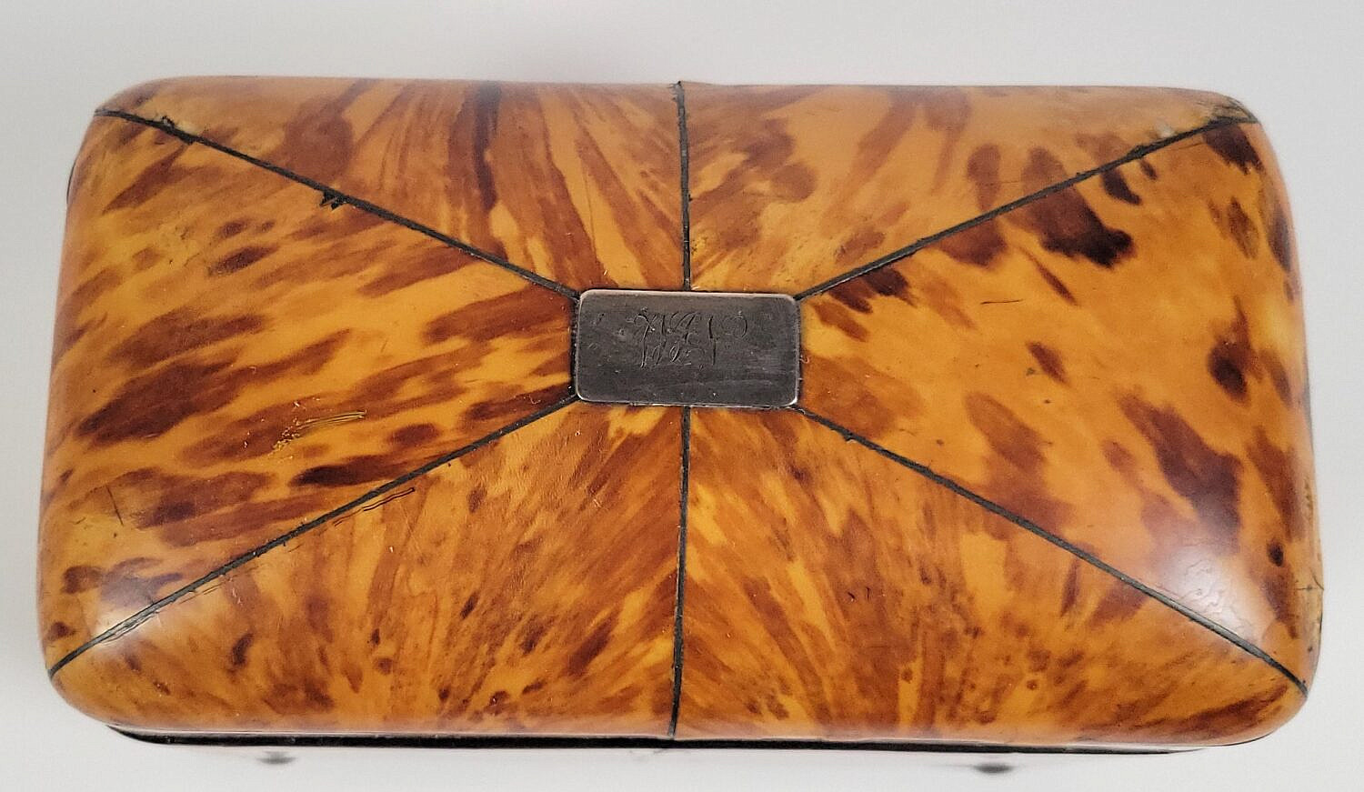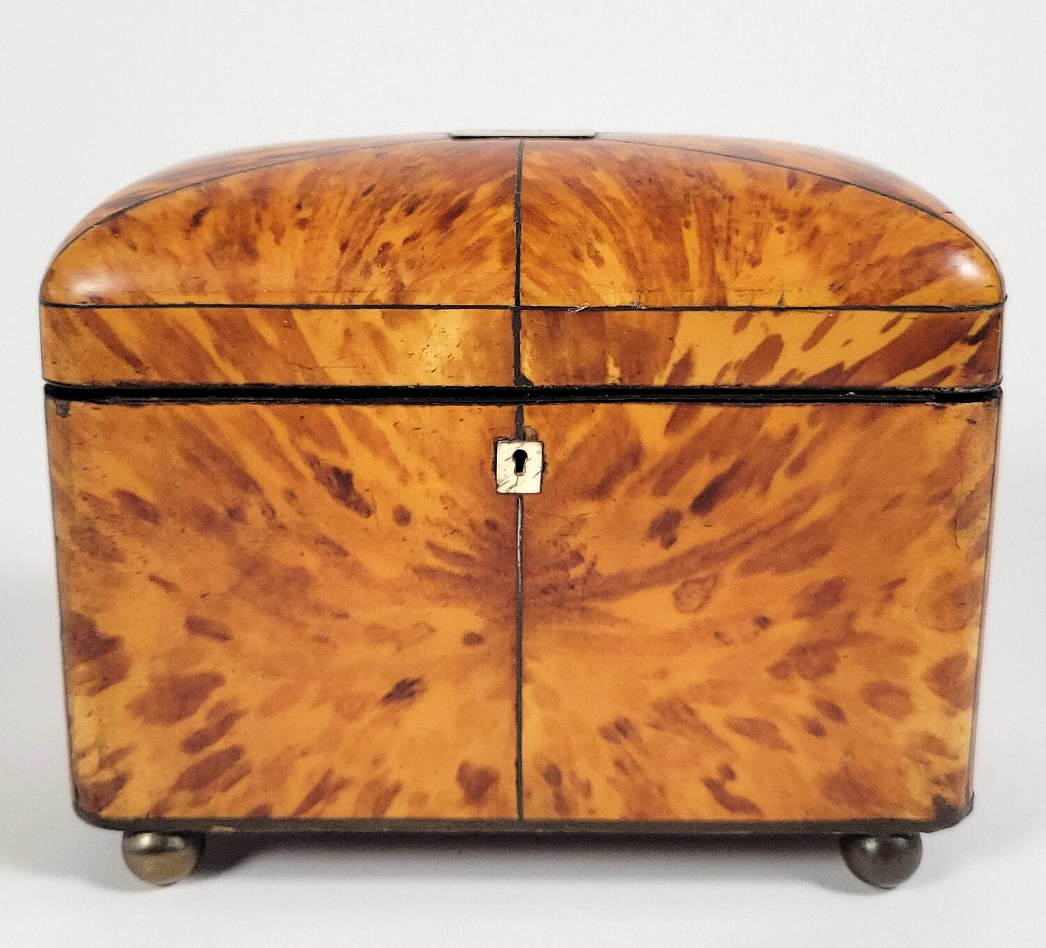 English Regency Antique Tortoiseshell Tea Caddy, 19th Century Consign Now DeptDecorative ArtsSizeHeight 5.5 in. Width 6.75 in. Depth 3.75 in. English Regency Antique Tortoiseshell Tea Caddy, 19th Century, domed lid, line inlay with initials engraved on plaque, dual compartments with matching lids, on bun feet. Height 5.5 in. Width 6.75 in. Depth 3.75 in. Please note that this auction has ended. Click here for an overview of this auction.