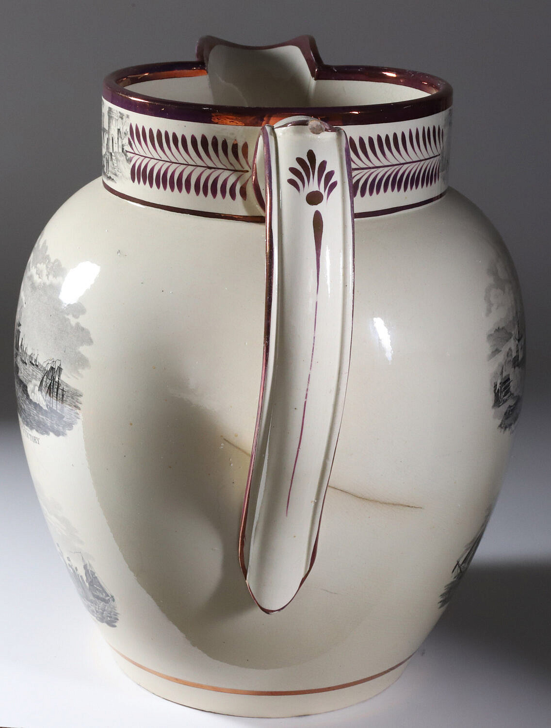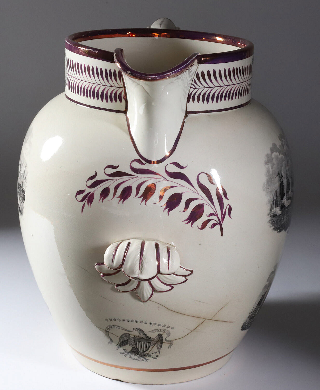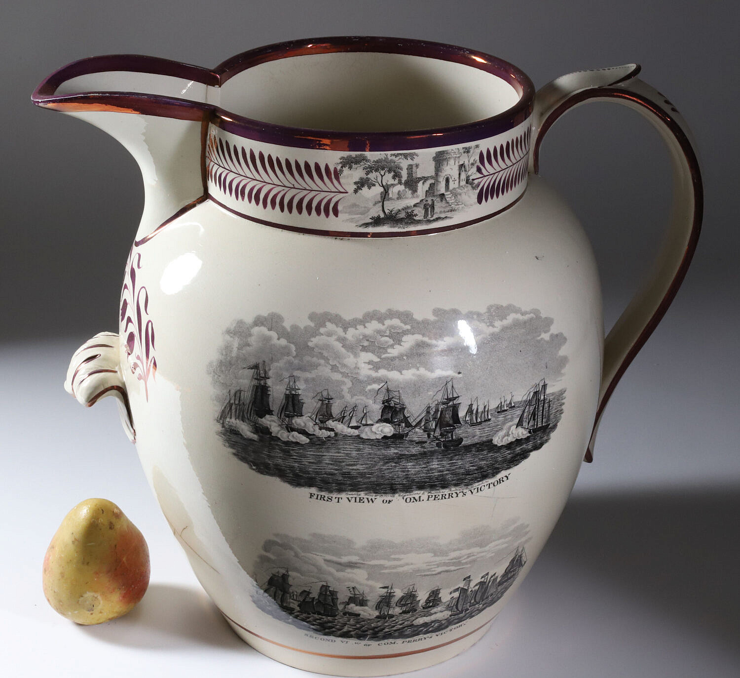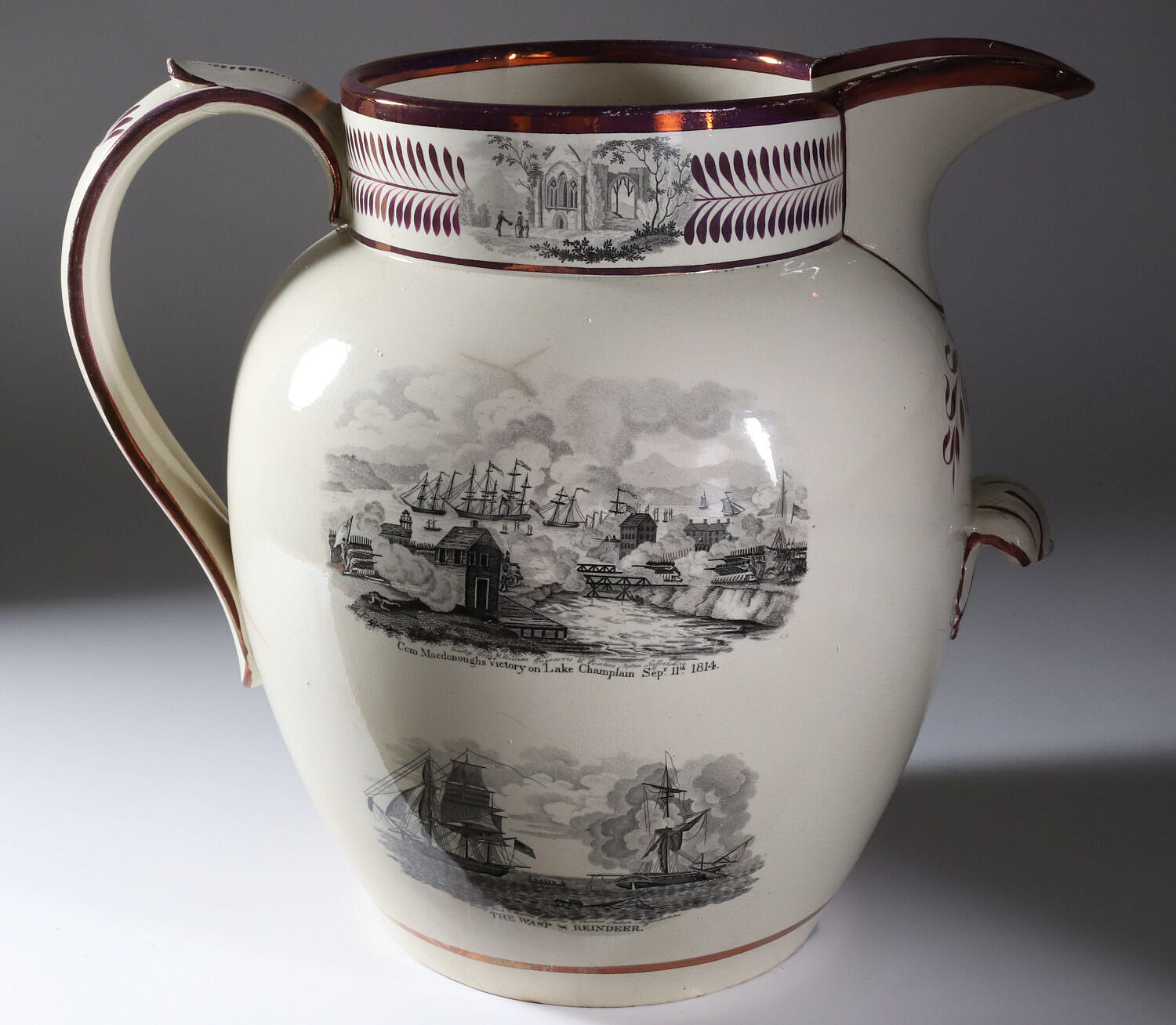 English Sunderland Monumental Pink Lustre Commemorative Pitcher, 19th Century, with cartouches: Commodor Macdonoughs Victory on Lake Champlain, Sept. 11, 1814; American eagle with 16 stars; first view of Com. Perry’s victory, and second view of Com. Perry’s victory; the Wasp and Reindeer