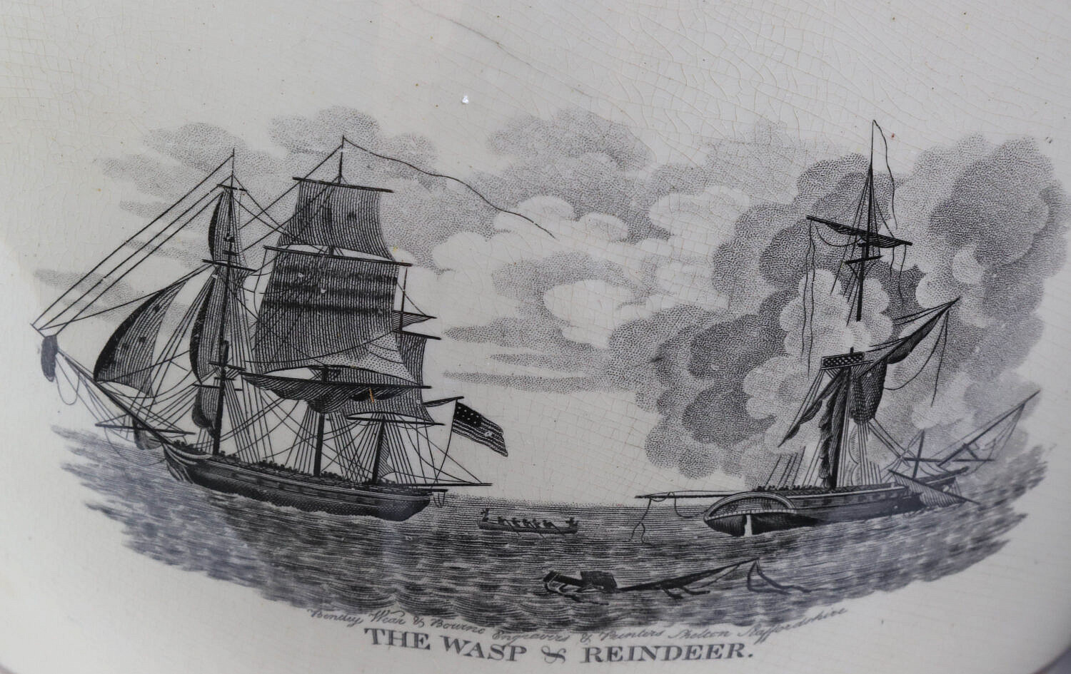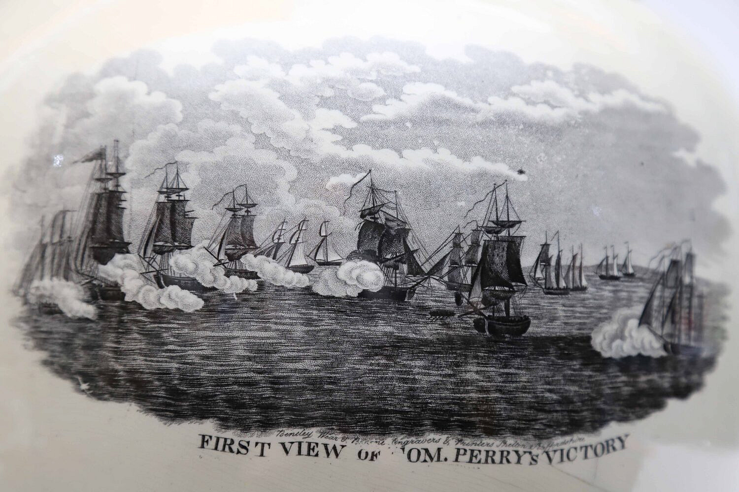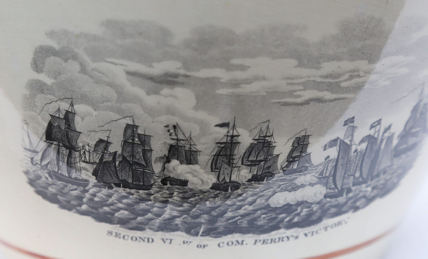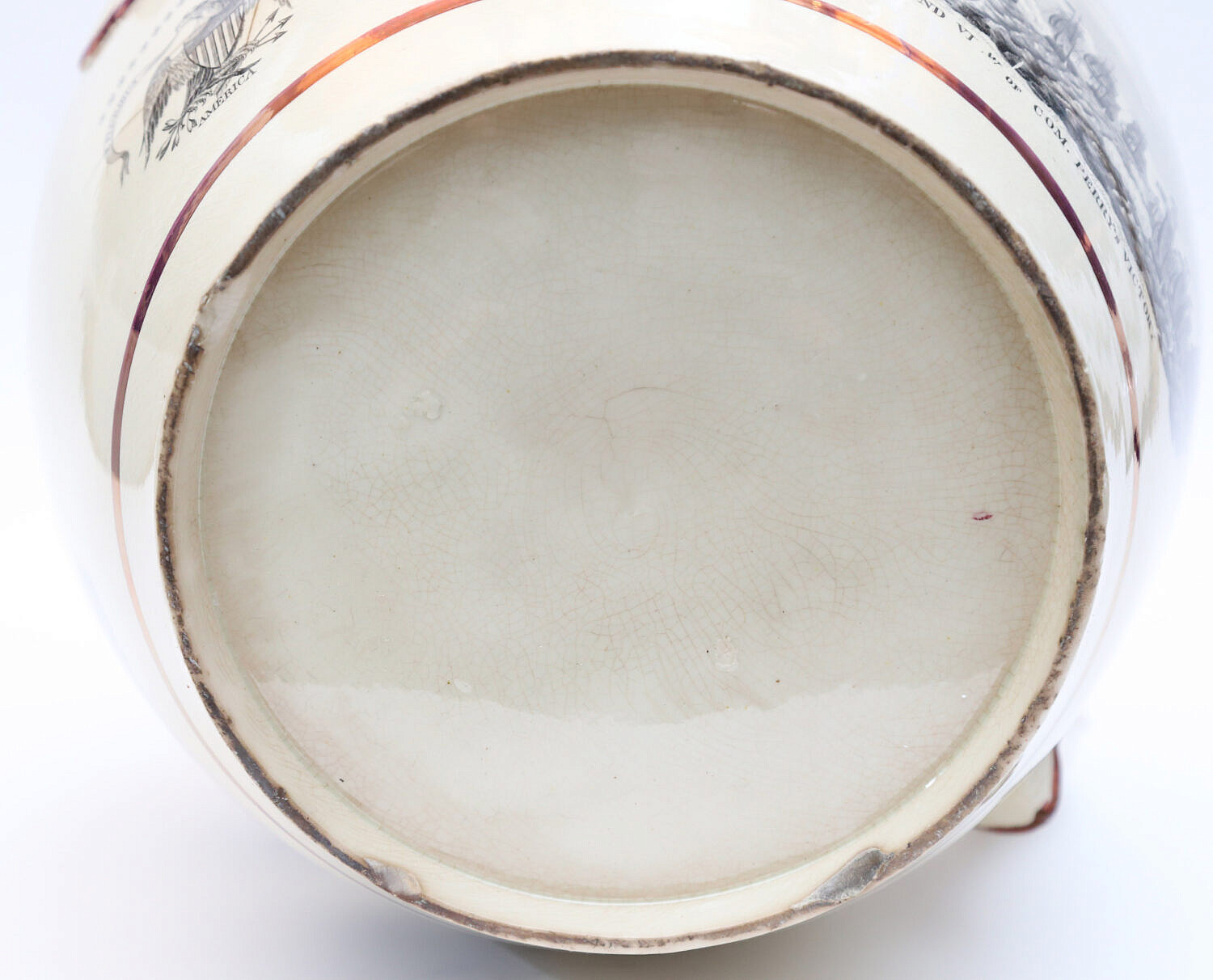 English Sunderland Monumental Pink Lustre Commemorative Pitcher, 19th Century, with cartouches: Commodor Macdonoughs Victory on Lake Champlain, Sept. 11, 1814; American eagle with 16 stars; first view of Com. Perry’s victory, and second view of Com. Perry’s victory; the Wasp and Reindeer