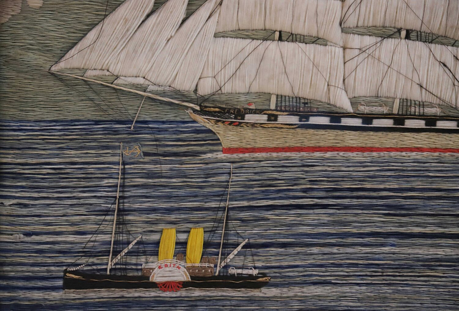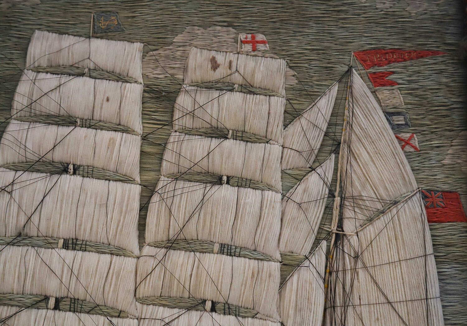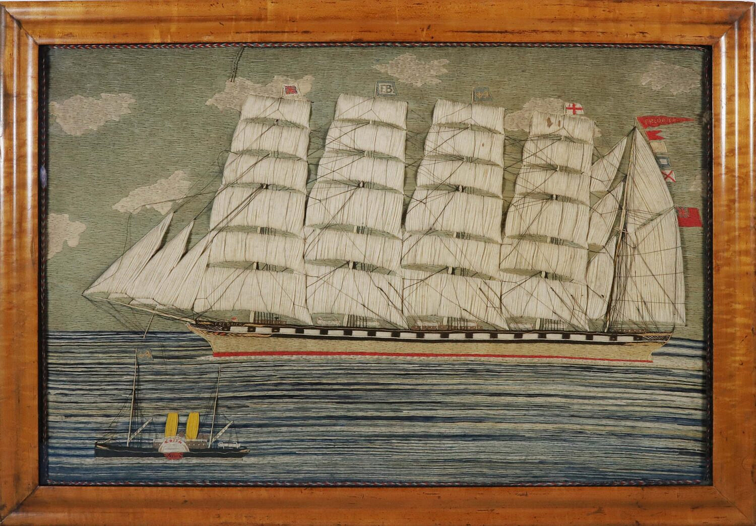 Fine British Man-O-War Woolie, 19th Century Consign Now DeptDecorative Arts, Maritime Arts, Textiles and QuiltsSize23 in. x 35 in. Framed 28 in. x 40 in. Fine British Man-O-War Woolie, 19th Century, depicting the 5-masted British ship Frederick with steam paddle Edity in foreground, in figured maple frame 23 in. x 35 in. Framed 28 in. x 40 in. Provenance: Joe Vallejo to the Present Owner Please note that this auction has ended. Click here for an overview of this auction.