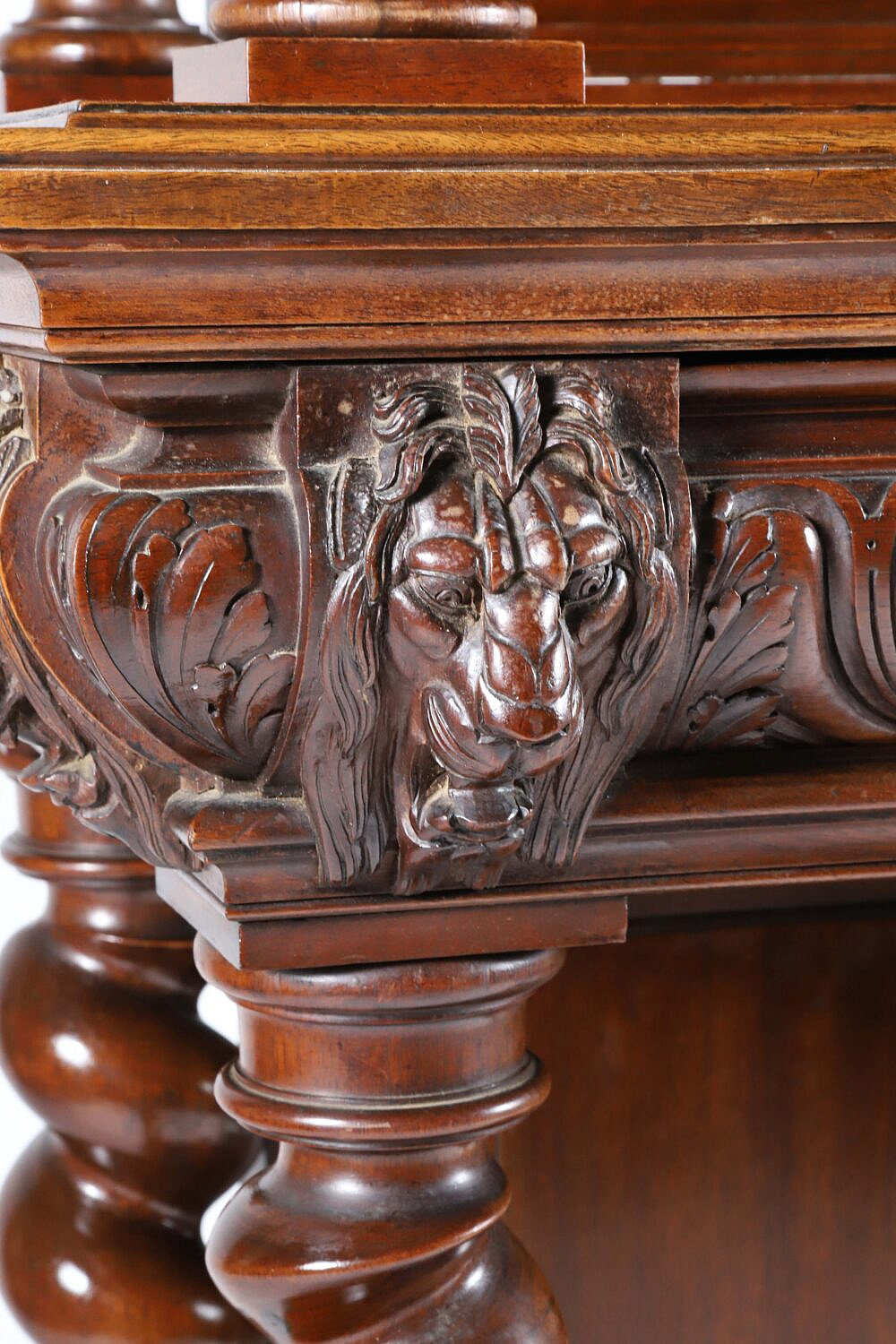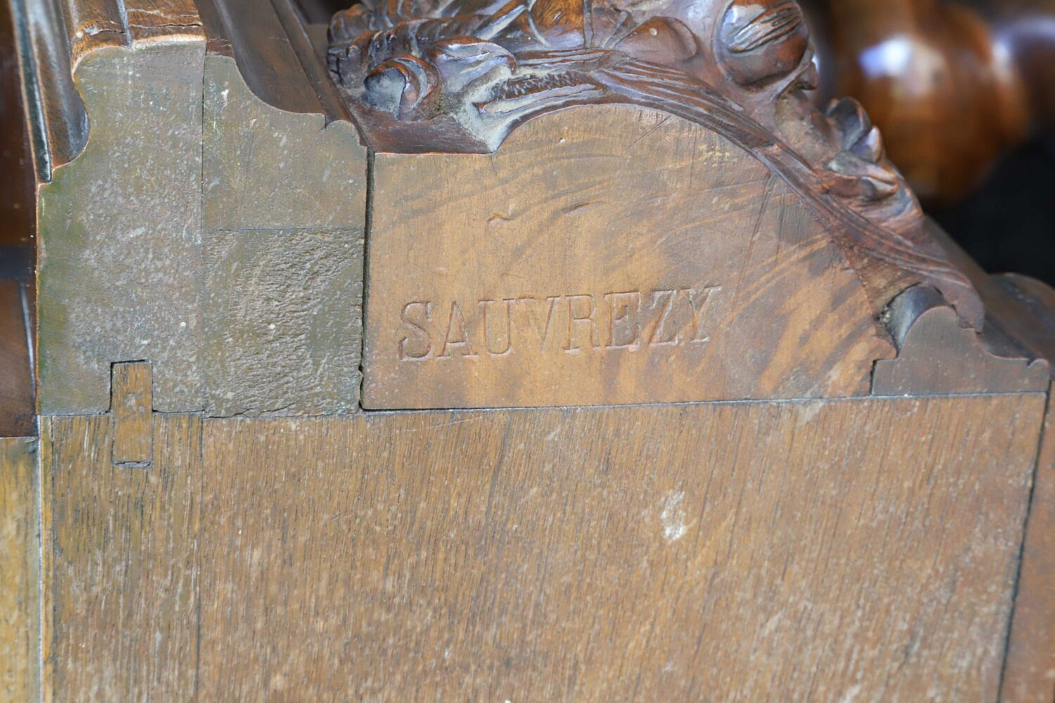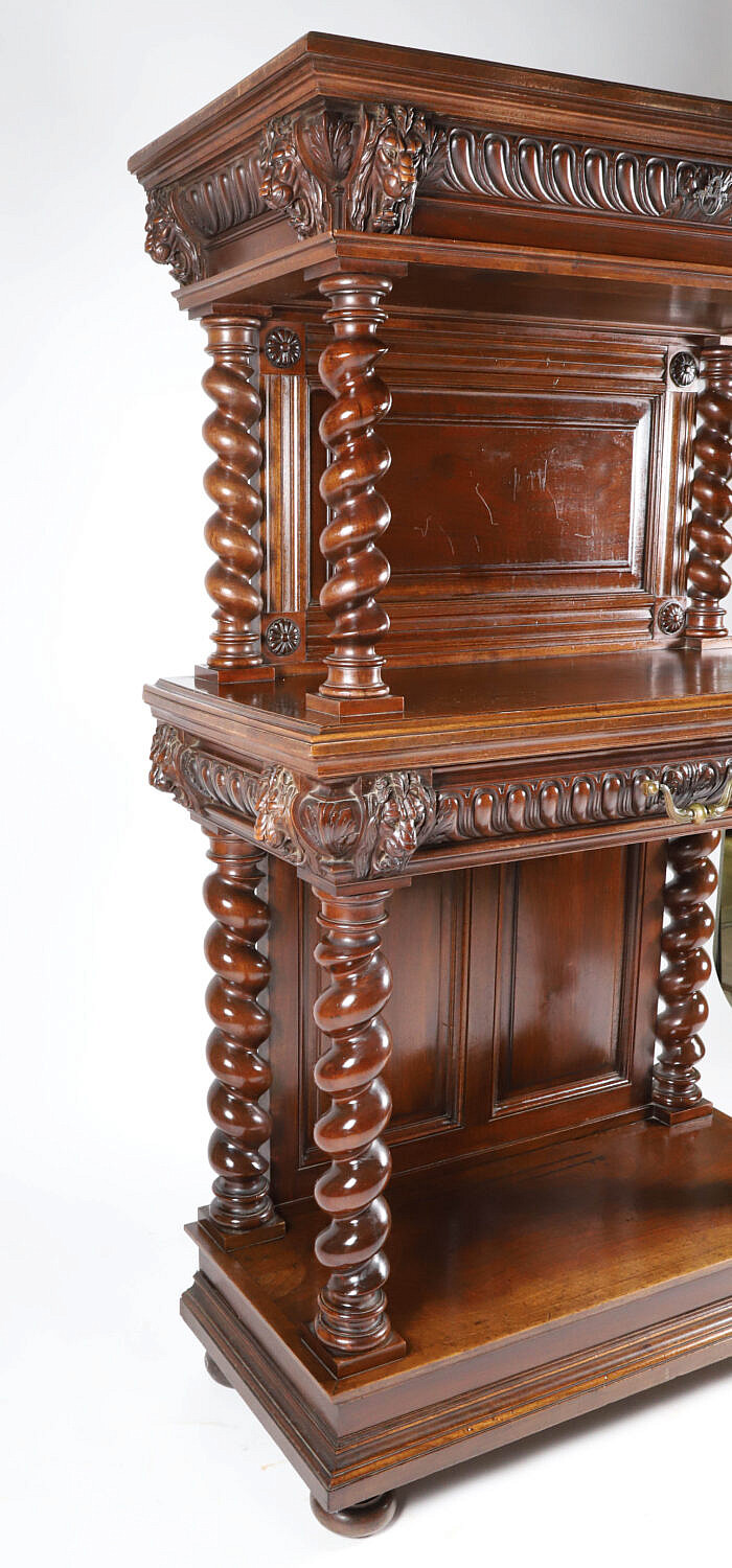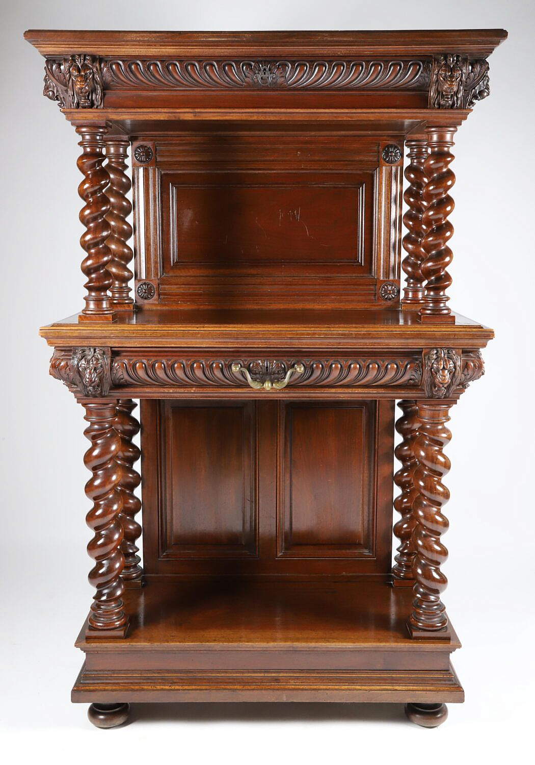 Finely Carved Signed Sauvrezy Two Tier Cabinet, 19th Century Consign Now DeptFurnitureSizeHeight 65.5 in. Width 43.5 in. Depth 19.5 in. Finely Carved Signed Sauvrezy Two Tier Cabinet, 19th Century, Gothic influence with carved lion’s heads, 8 bold spiral columns, single drawer beneath the first tier platform, paneled backs, on bun feet. Signed on the reverse Sauvrezy. Height 65.5 in. Width 43.5 in. Depth 19.5 in. Please note that this auction has ended. Click here for an overview of this auction.