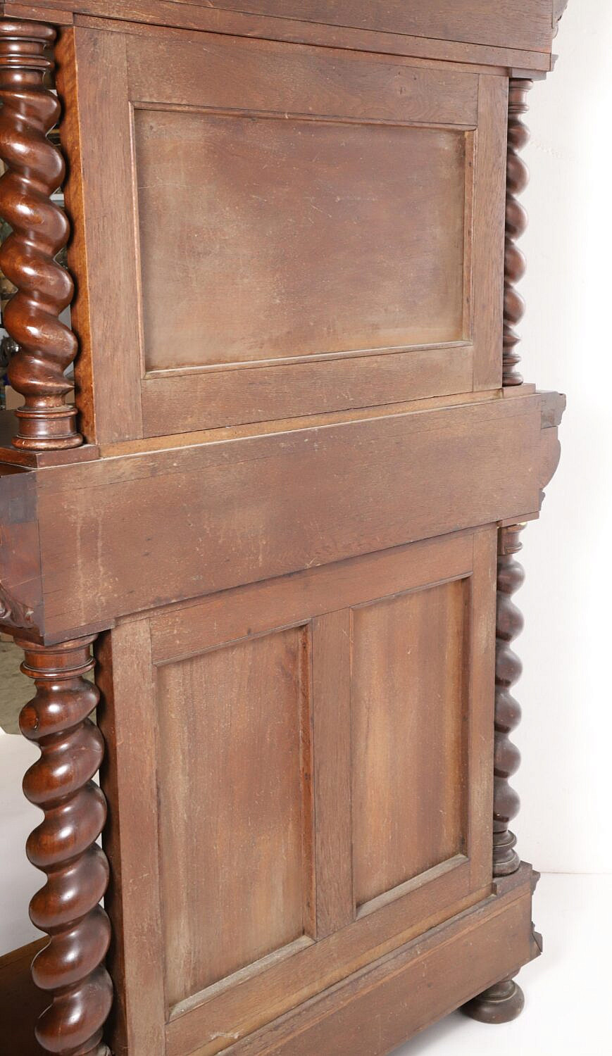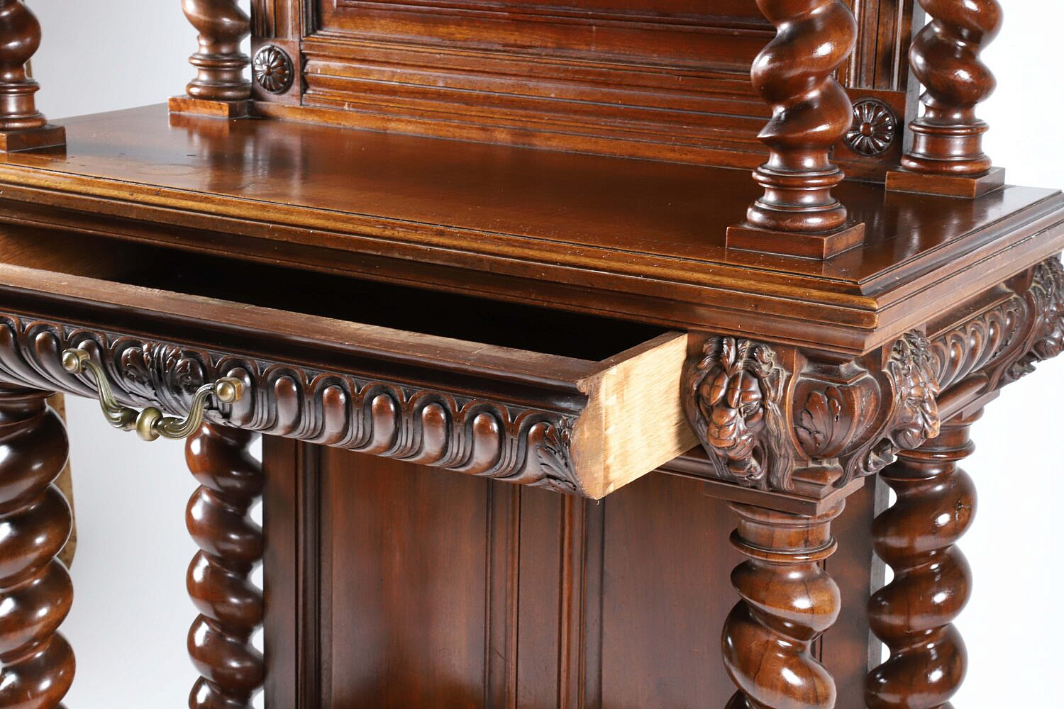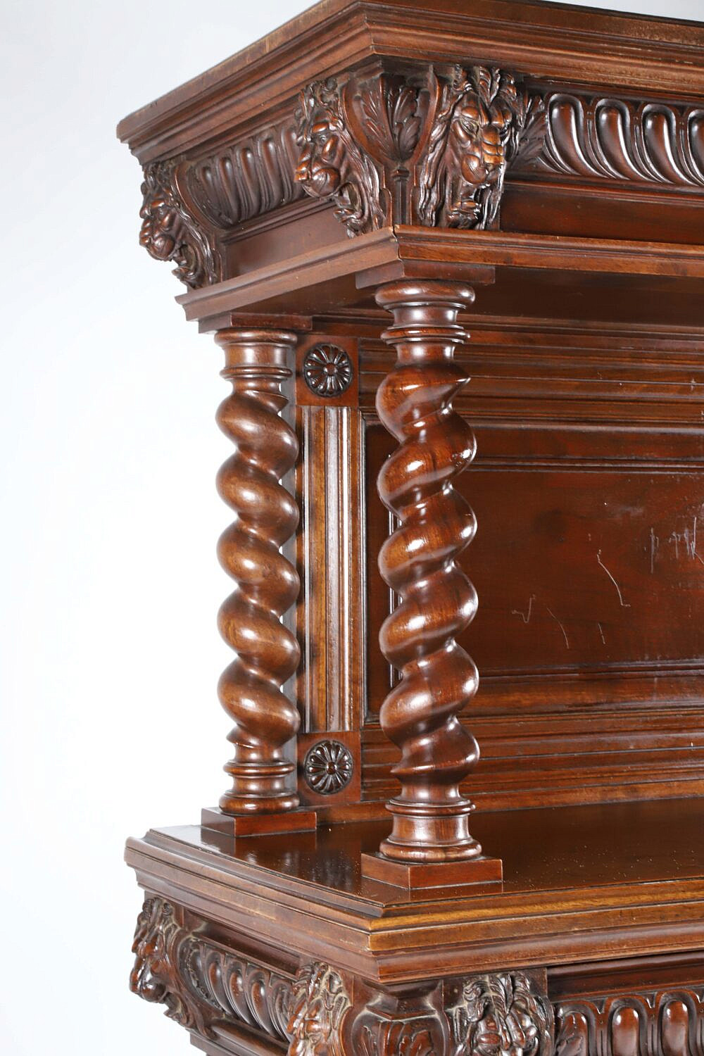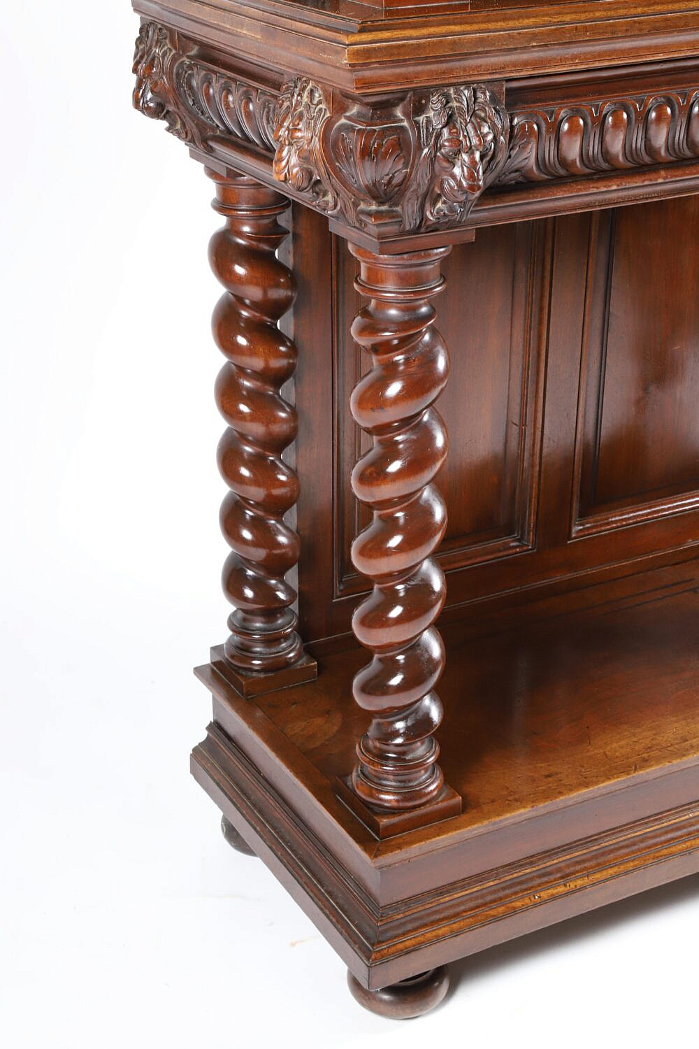 Finely Carved Signed Sauvrezy Two Tier Cabinet, 19th Century Consign Now DeptFurnitureSizeHeight 65.5 in. Width 43.5 in. Depth 19.5 in. Finely Carved Signed Sauvrezy Two Tier Cabinet, 19th Century, Gothic influence with carved lion’s heads, 8 bold spiral columns, single drawer beneath the first tier platform, paneled backs, on bun feet. Signed on the reverse Sauvrezy. Height 65.5 in. Width 43.5 in. Depth 19.5 in. Please note that this auction has ended. Click here for an overview of this auction.
