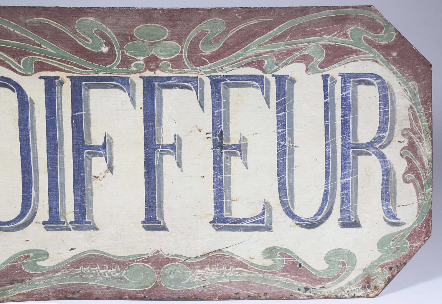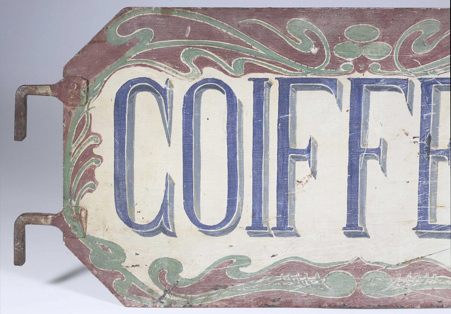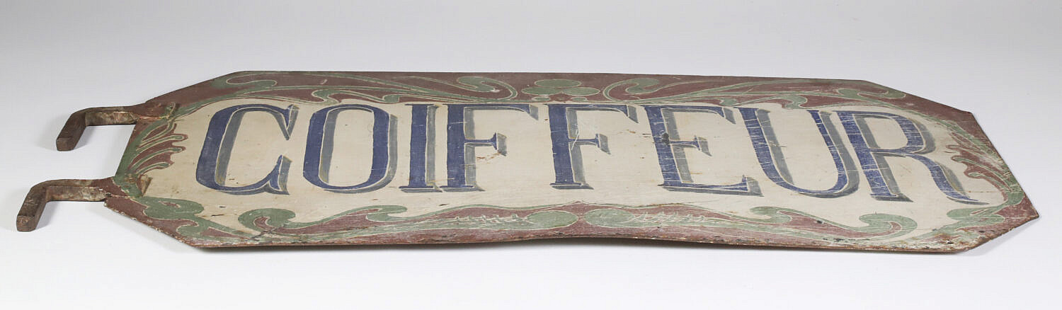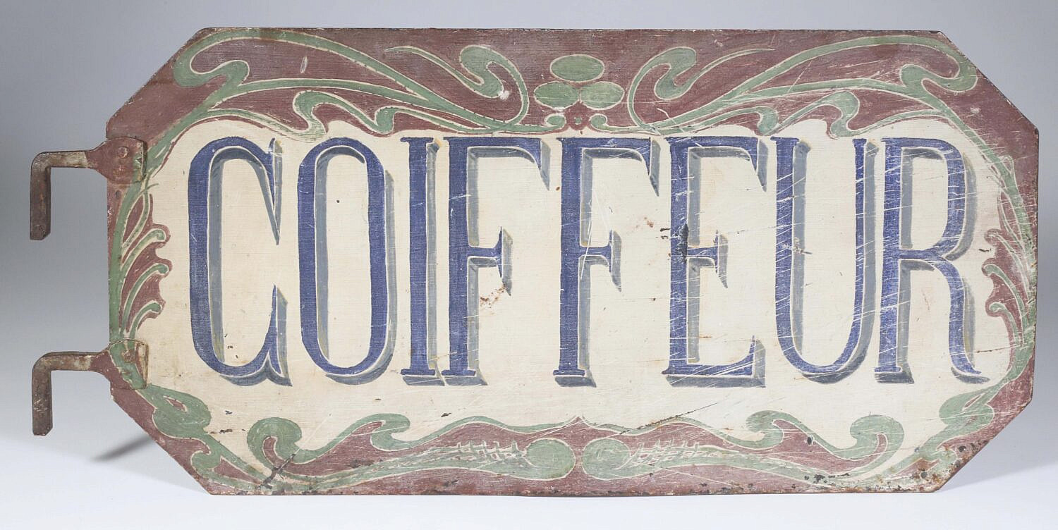 French Art Nouveau Hand Painted “Coiffeur” Trade Sign Consign Now DeptDecorative ArtsSize21.25 in. x 10 in. French Art Nouveau Hand Painted “Coiffeur” Sign, a Parisian hair dresser trade sign, painted on both sides 21.25 in. x 10 in. Please note that this auction has ended. Click here for an overview of this auction.