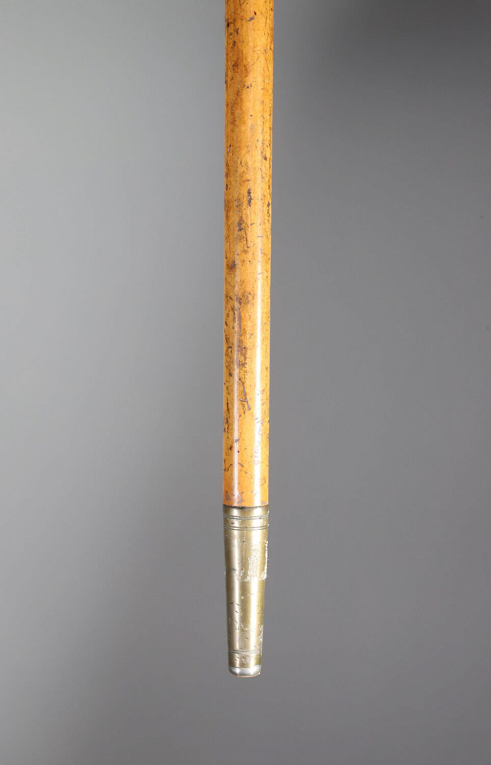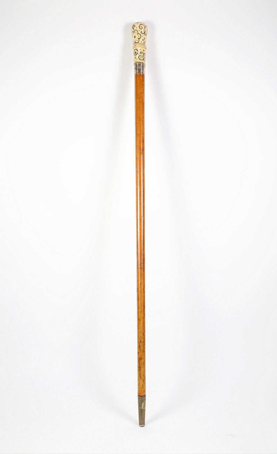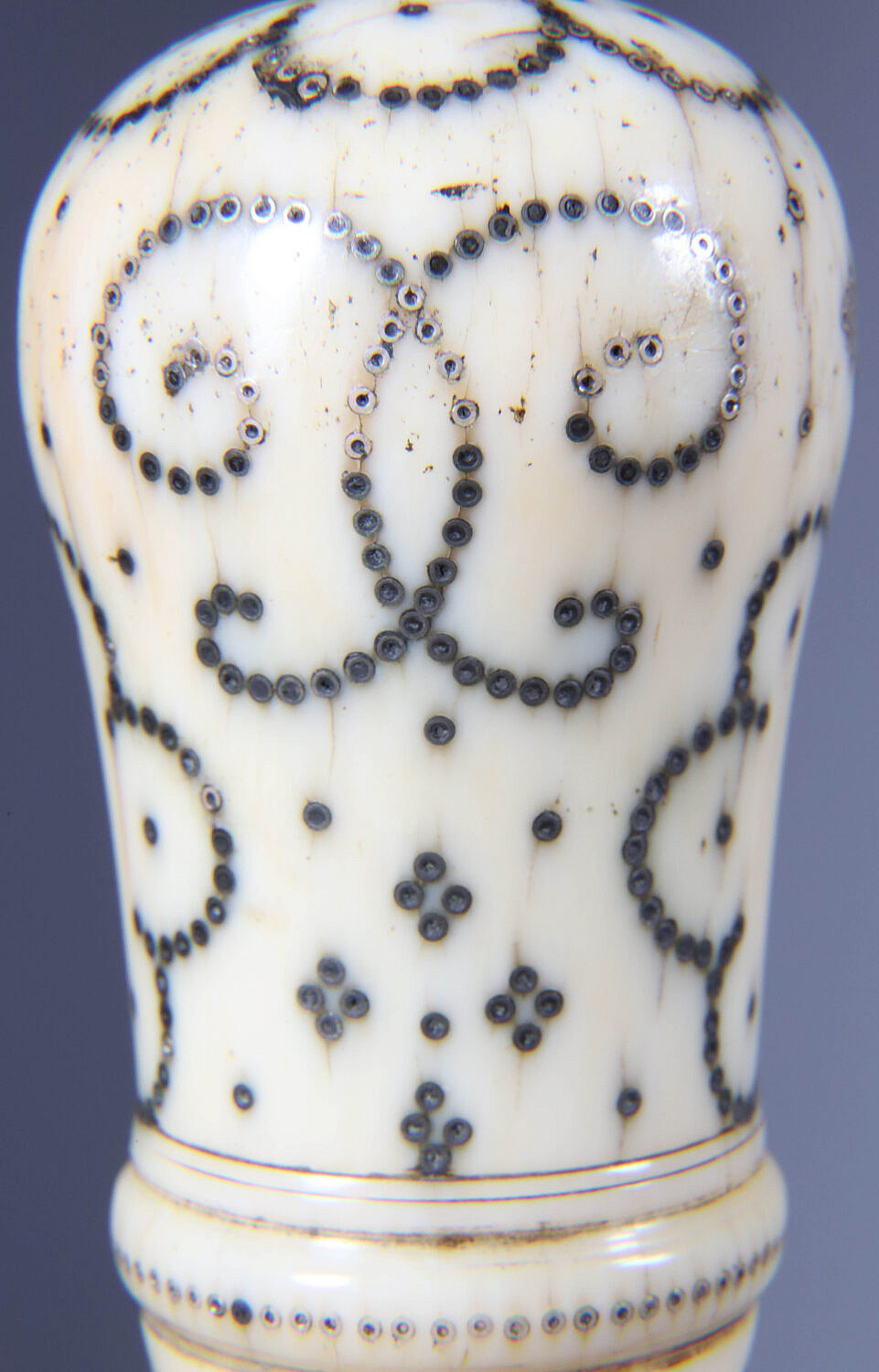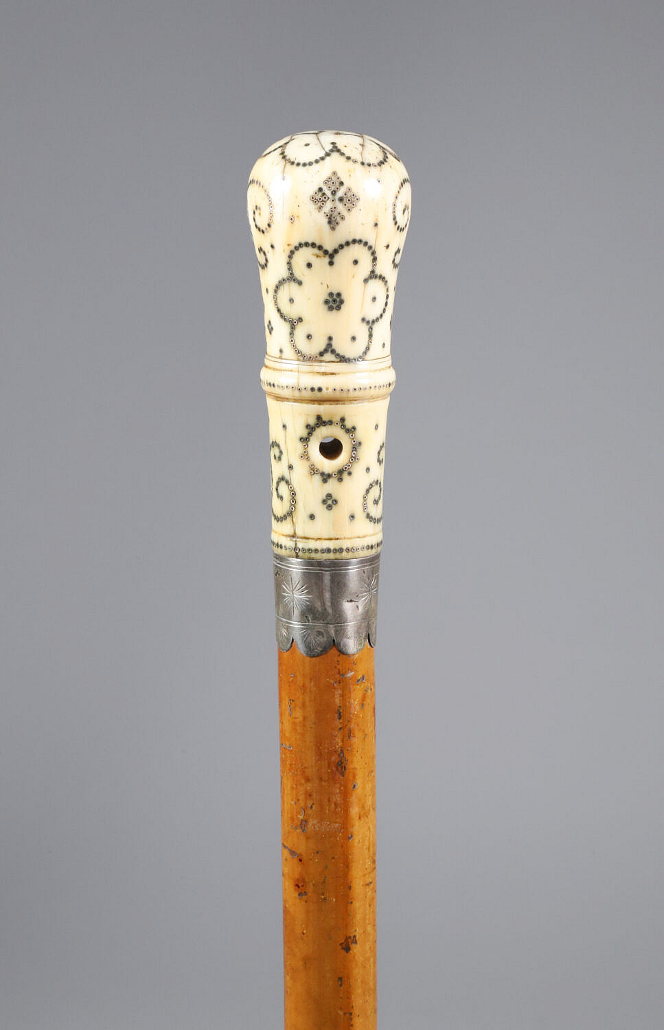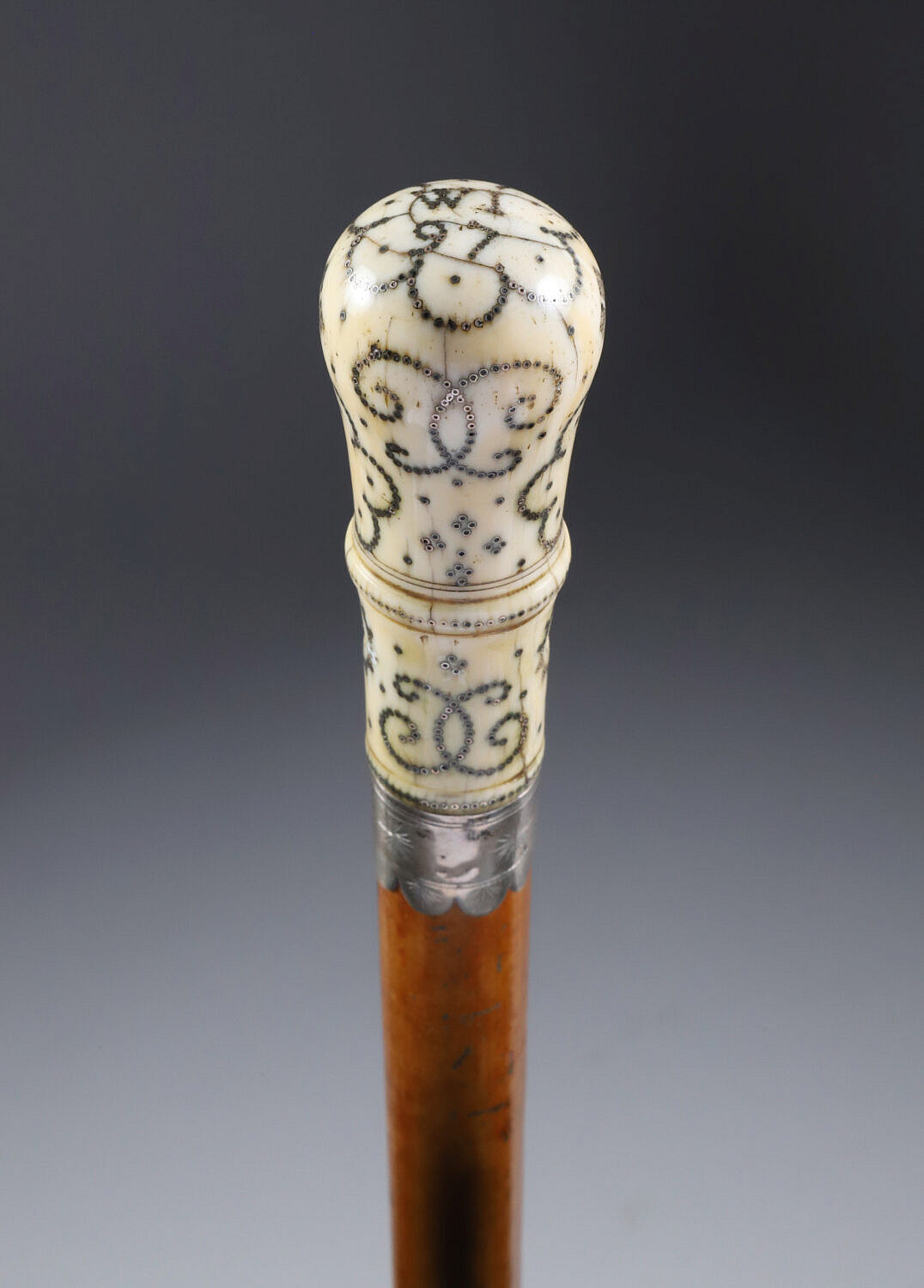 French Pique Walking Stick, circa 1697, antique whale ivory grip profusely inlaid and initialed W.I. and dated ’97; engraved silver collar on a malacca wood shaft ending in a brass ferrule