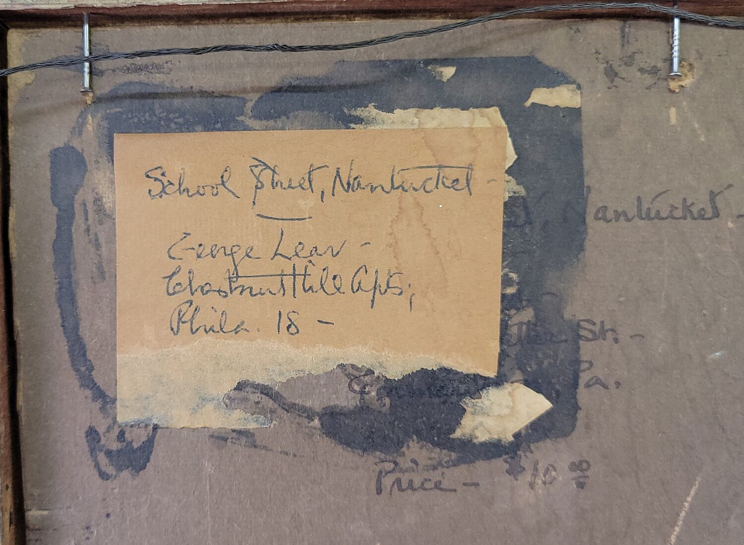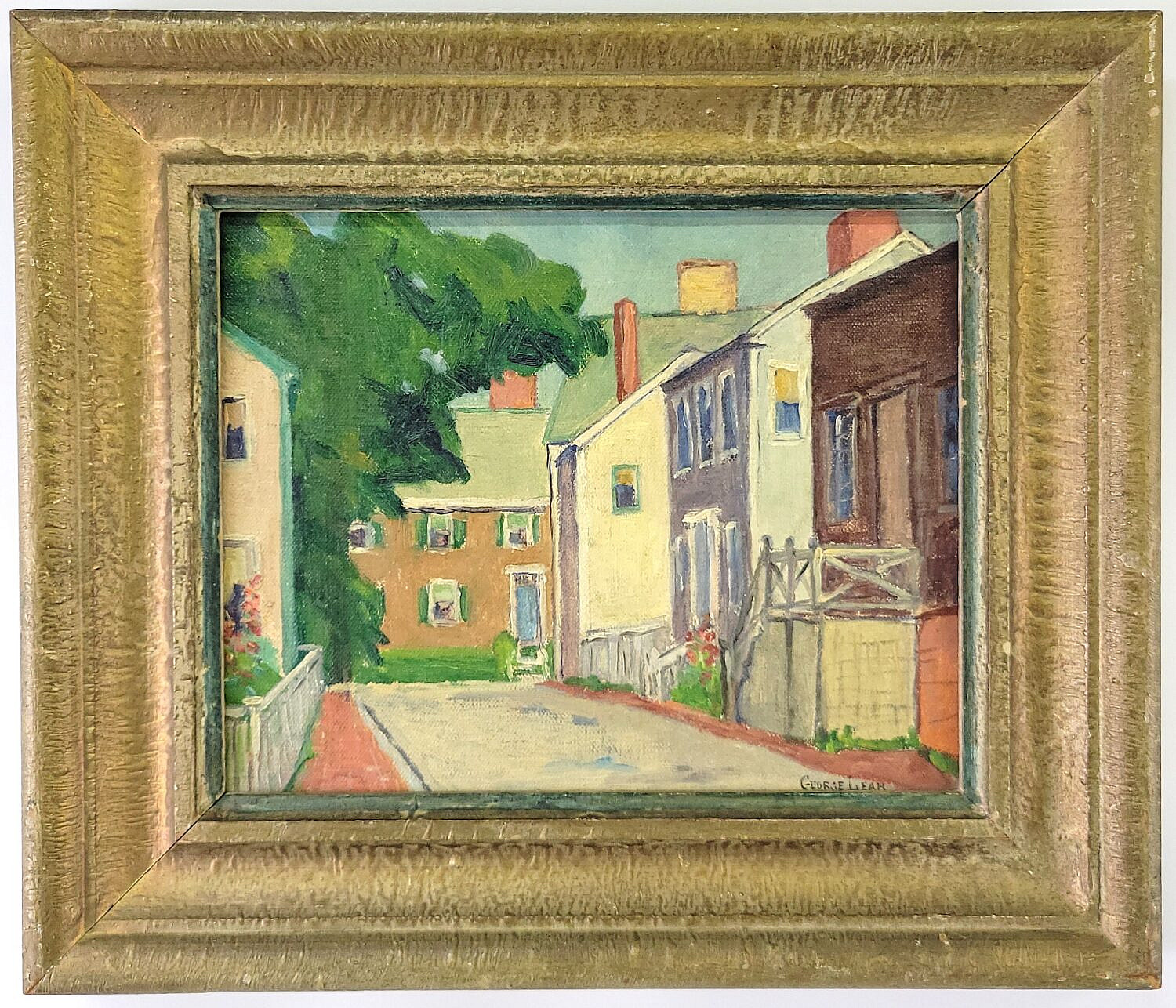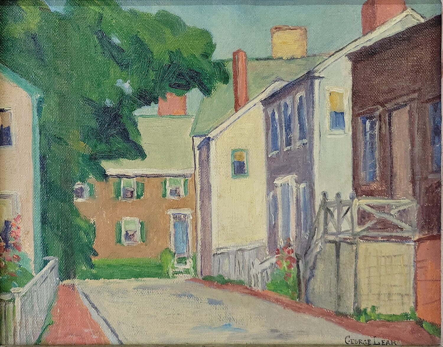 George Lear (1879-1956) “School Street, Nantucket” Oil on Board Painting Consign Now DeptNantucket ArtSizeSight 8 in. x 10 in. Framed 12 in. x 14 in. George Lear (1879-1956) “School Street, Nantucket” Oil on Board Painting, circa 1930, showing houses on the street, signed lower right, with artist’s label on reverse, original gilt frame. Sight 8 in. x 10 in. Framed 12 in. x 14 in. Please note that this auction has ended. Click here for an overview of this auction.