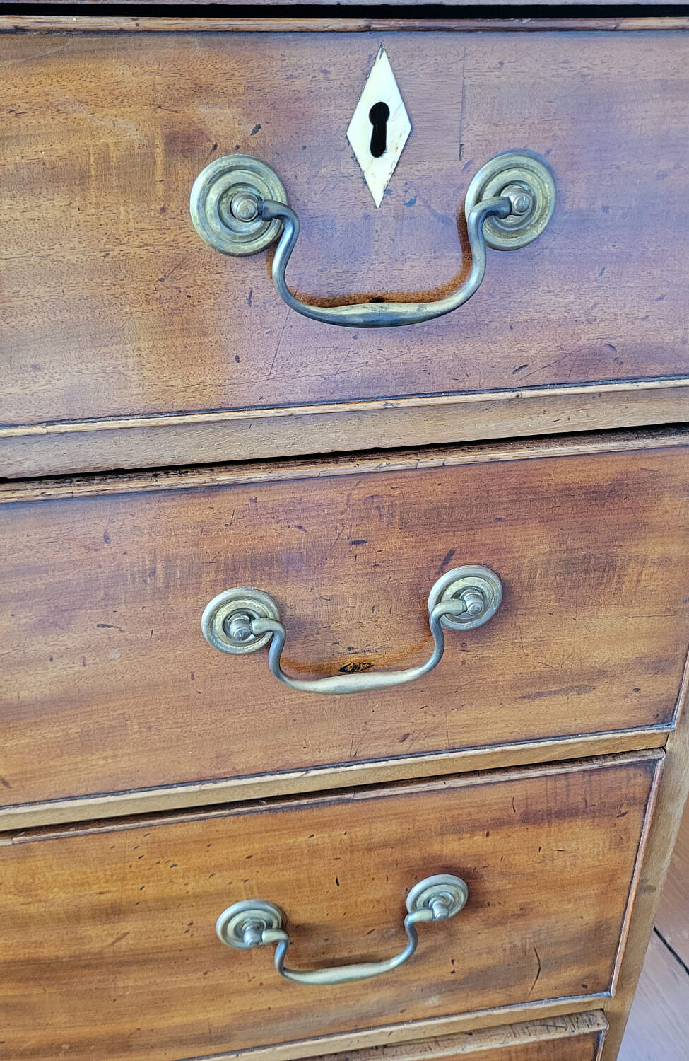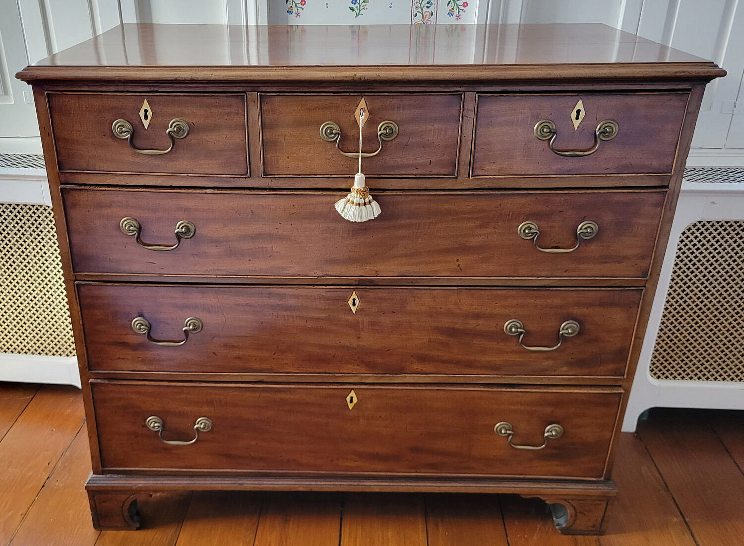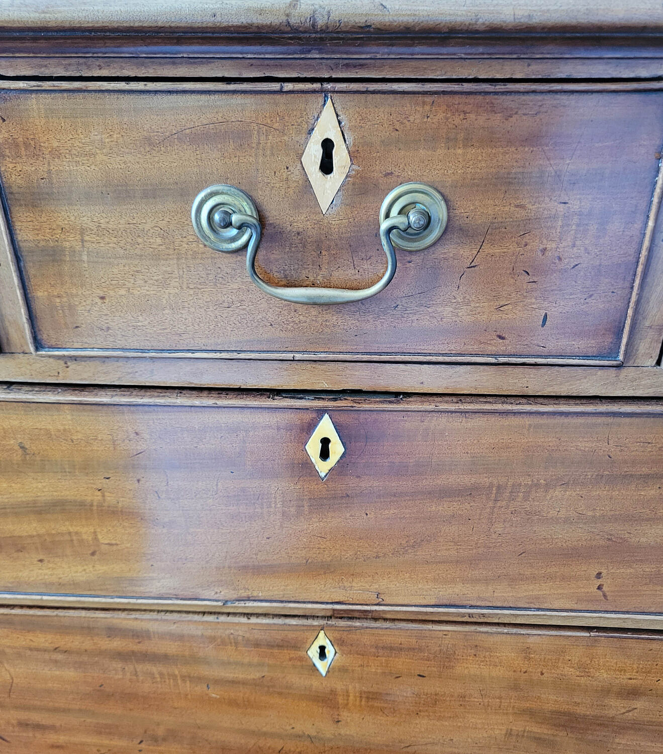 Georgian Mahogany Chest of Six Drawers, early 19th Century, three over three drawers, diamond shaped bone escutcheons, brass post and bail hardware, on petite bracket feet