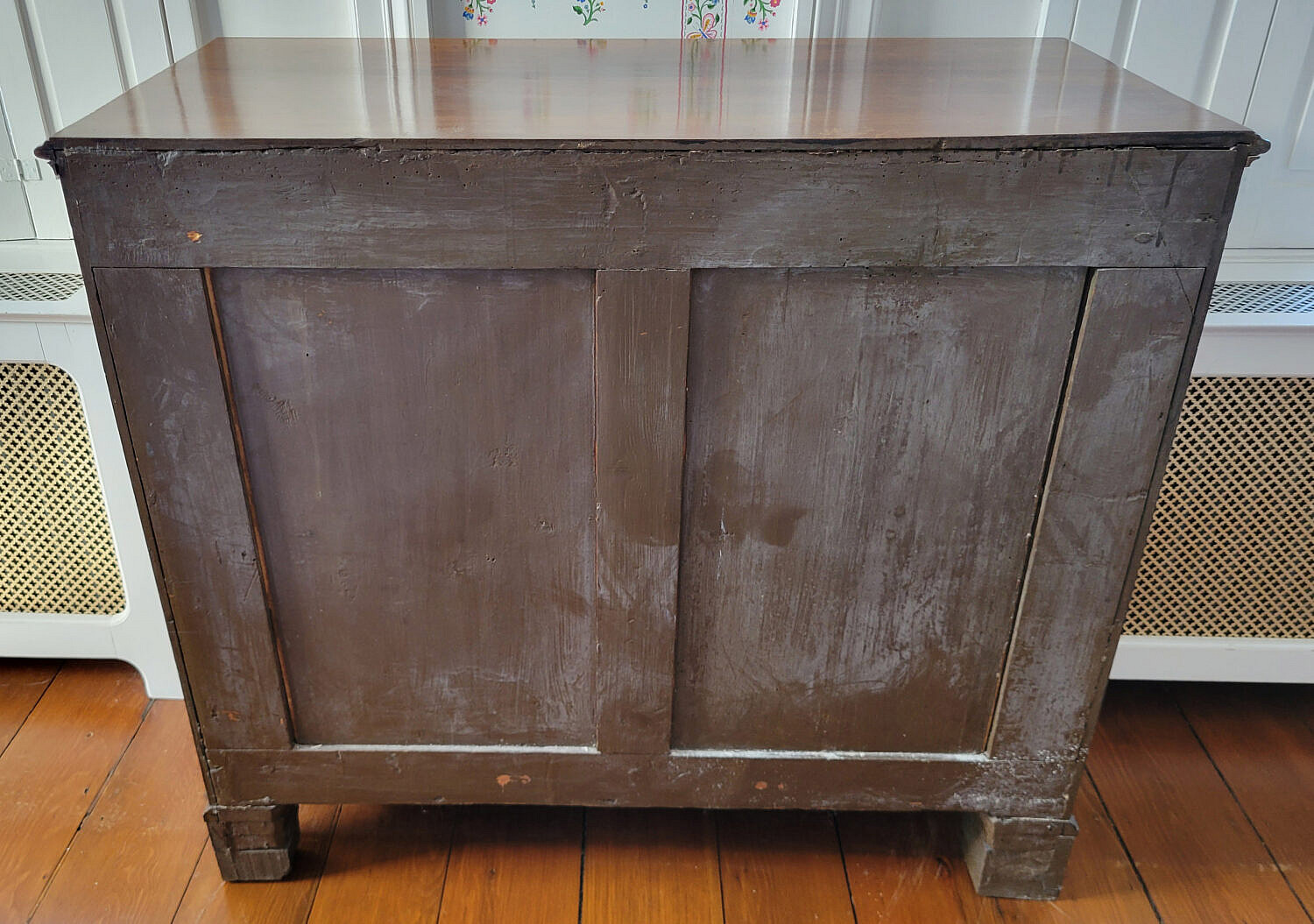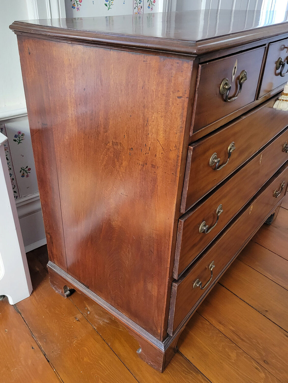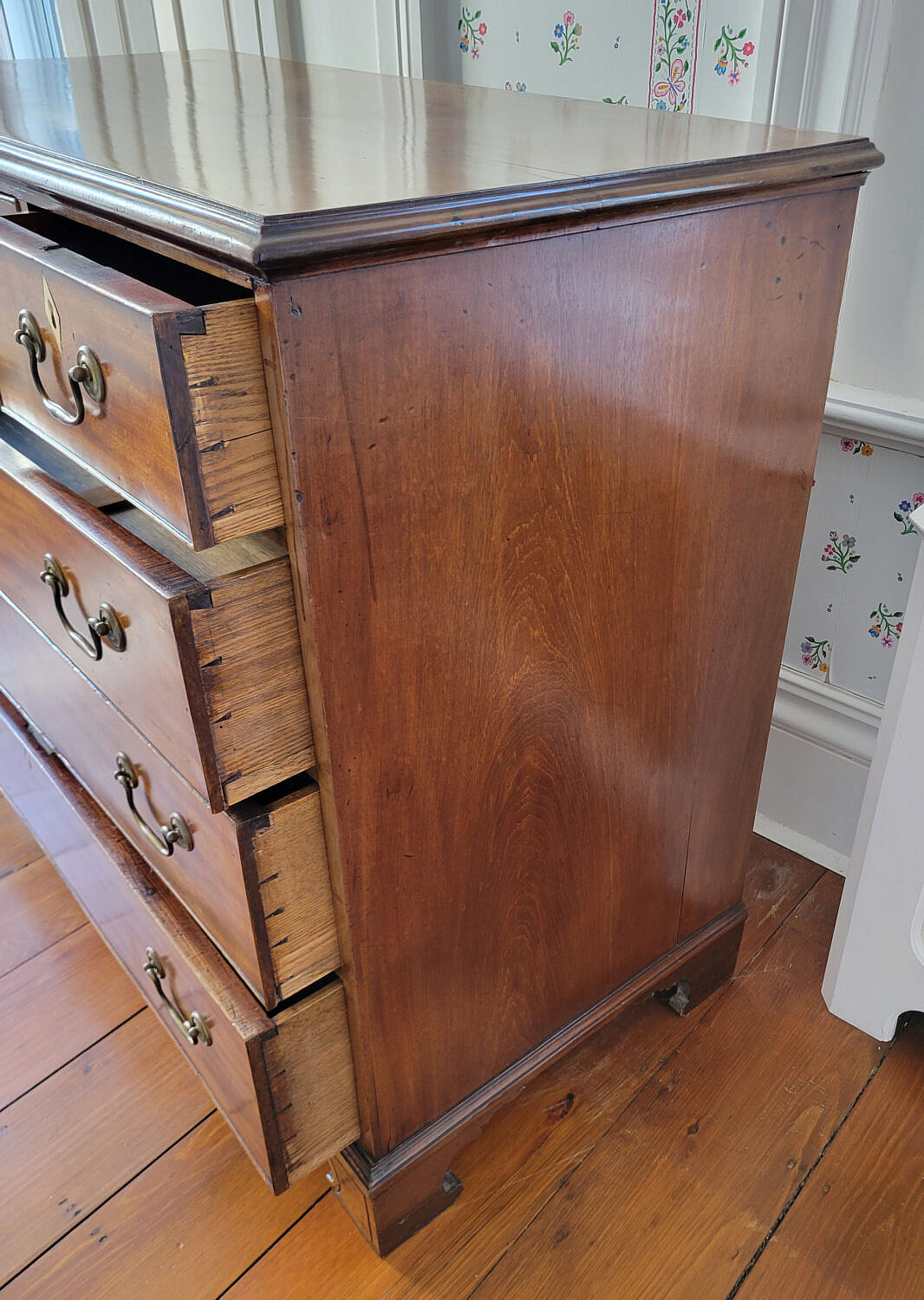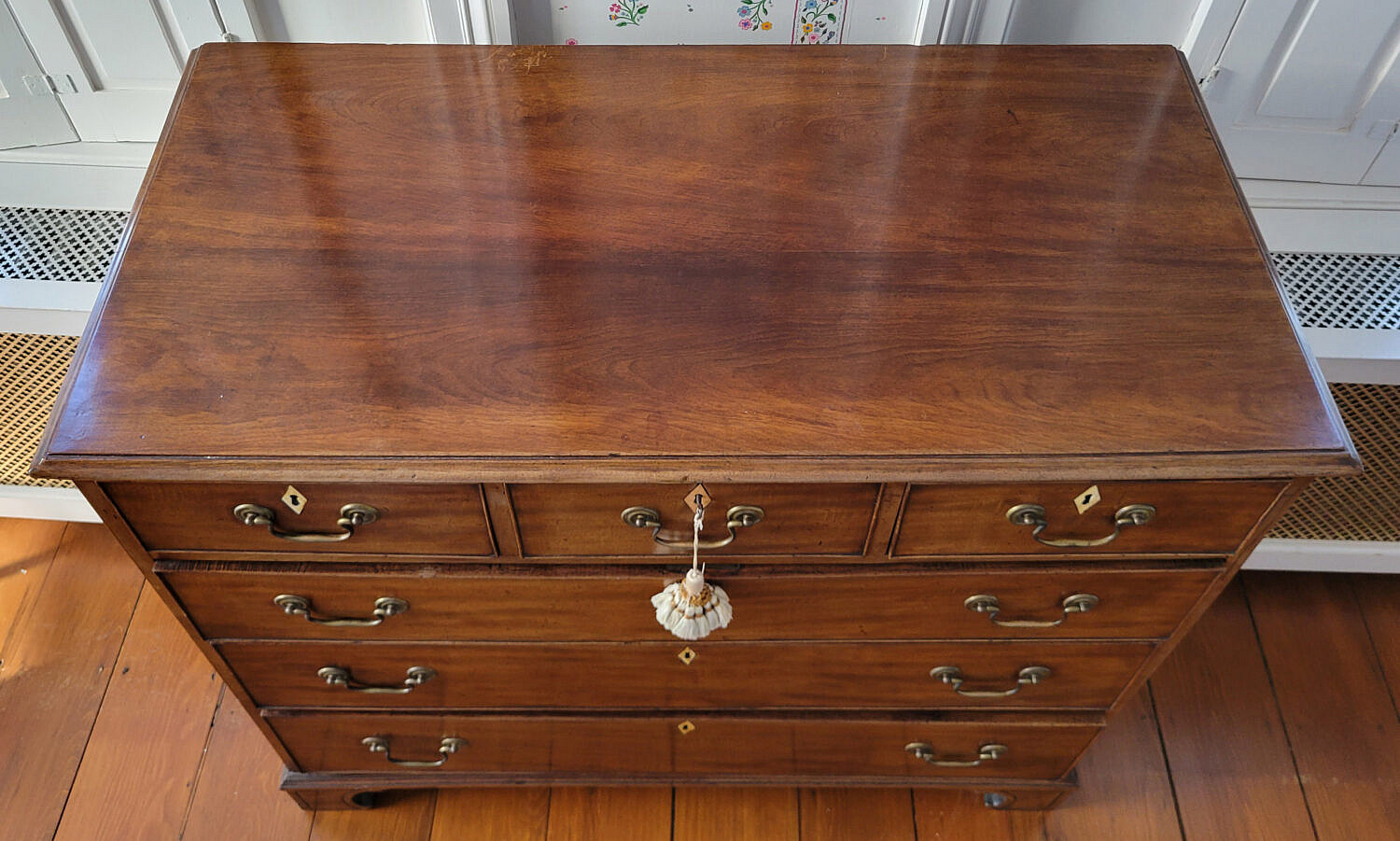 Georgian Mahogany Chest of Six Drawers, early 19th Century, three over three drawers, diamond shaped bone escutcheons, brass post and bail hardware, on petite bracket feet