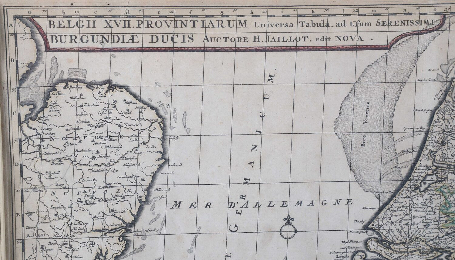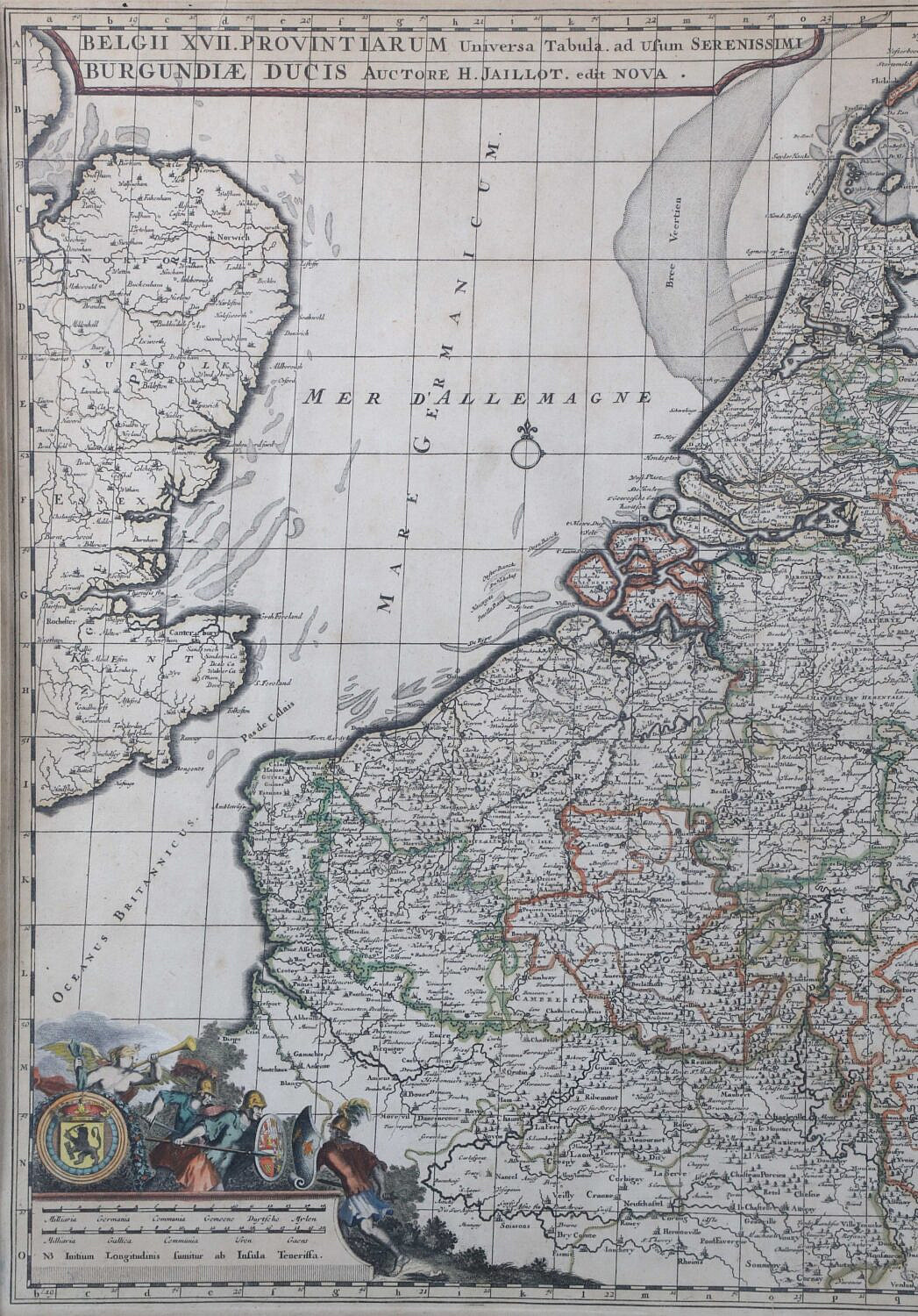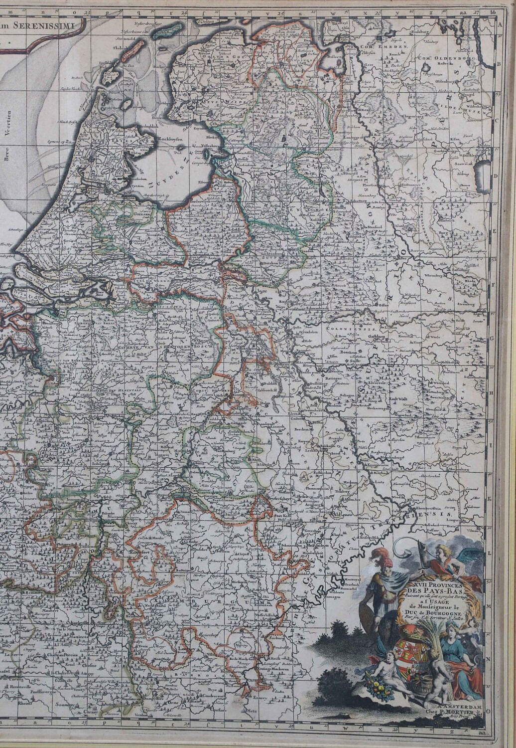 Hand Colored Historical Map of Amsterdam Created by Cartographer Alexis Hubert Jaillot, the map depicts the 17 Provinces that comprised the Dutch Republic and parts of modern day Belgium and Luxembourg at the time, published Jean Covens and Corneille Mortier, c. 1702, with two decorative cartouches, matted and framed