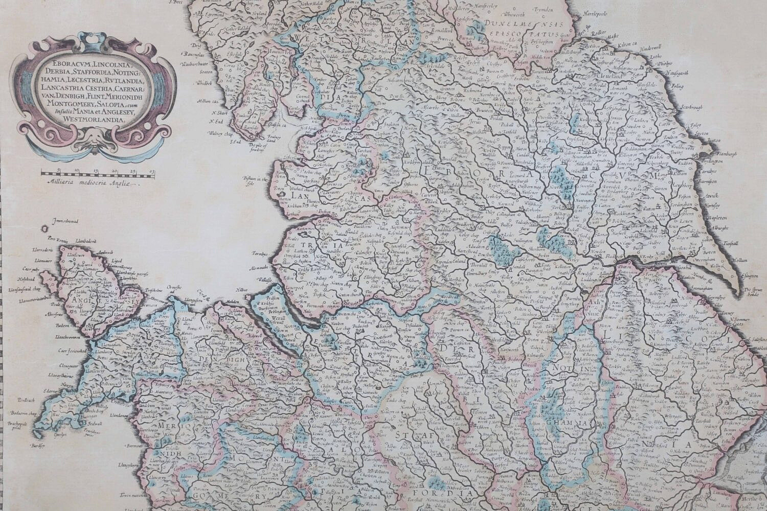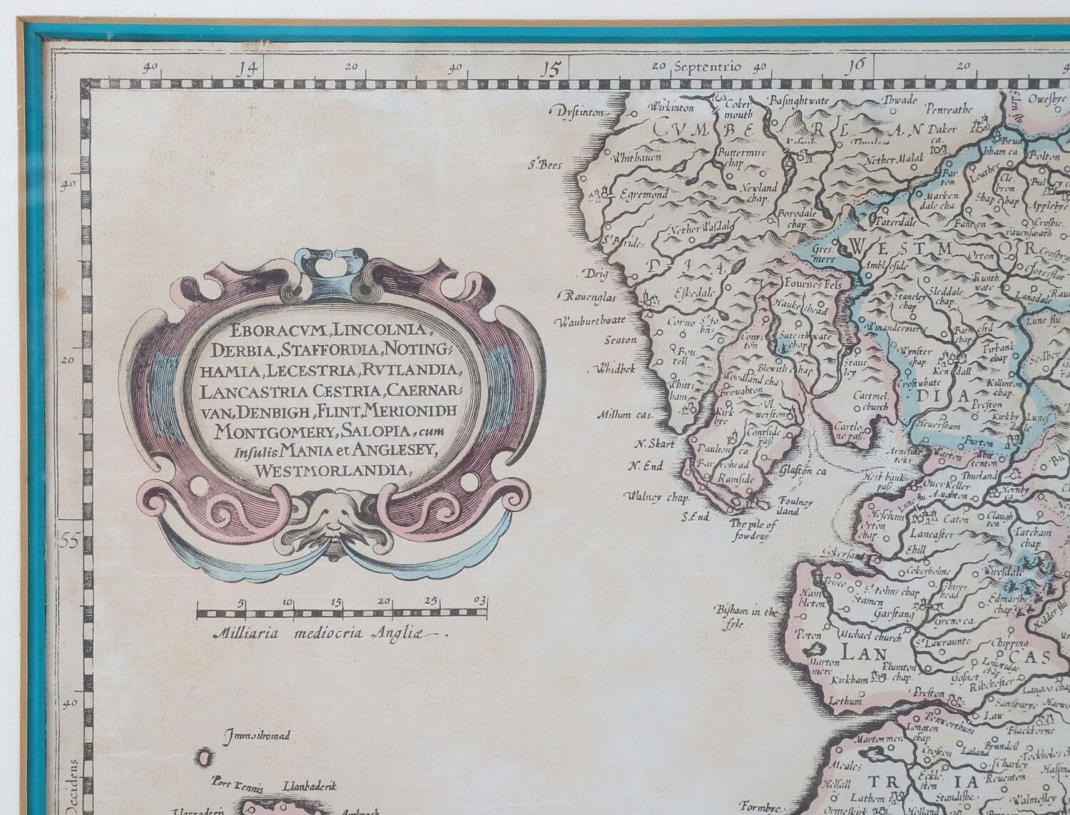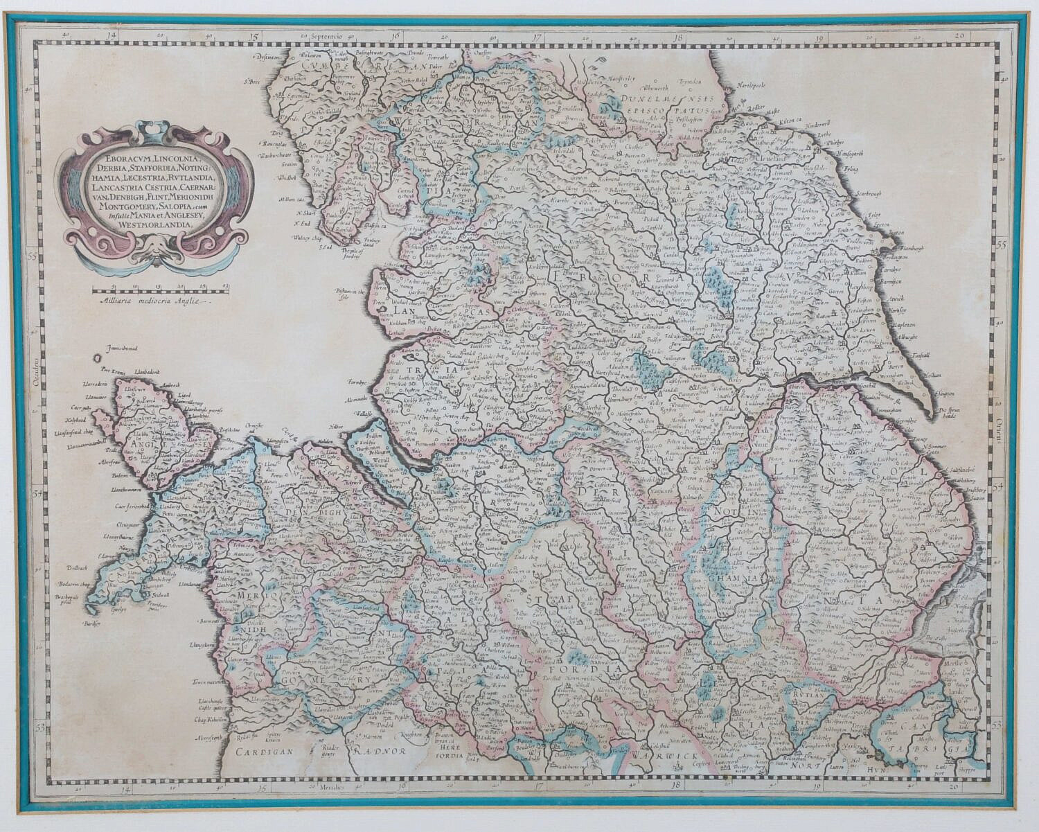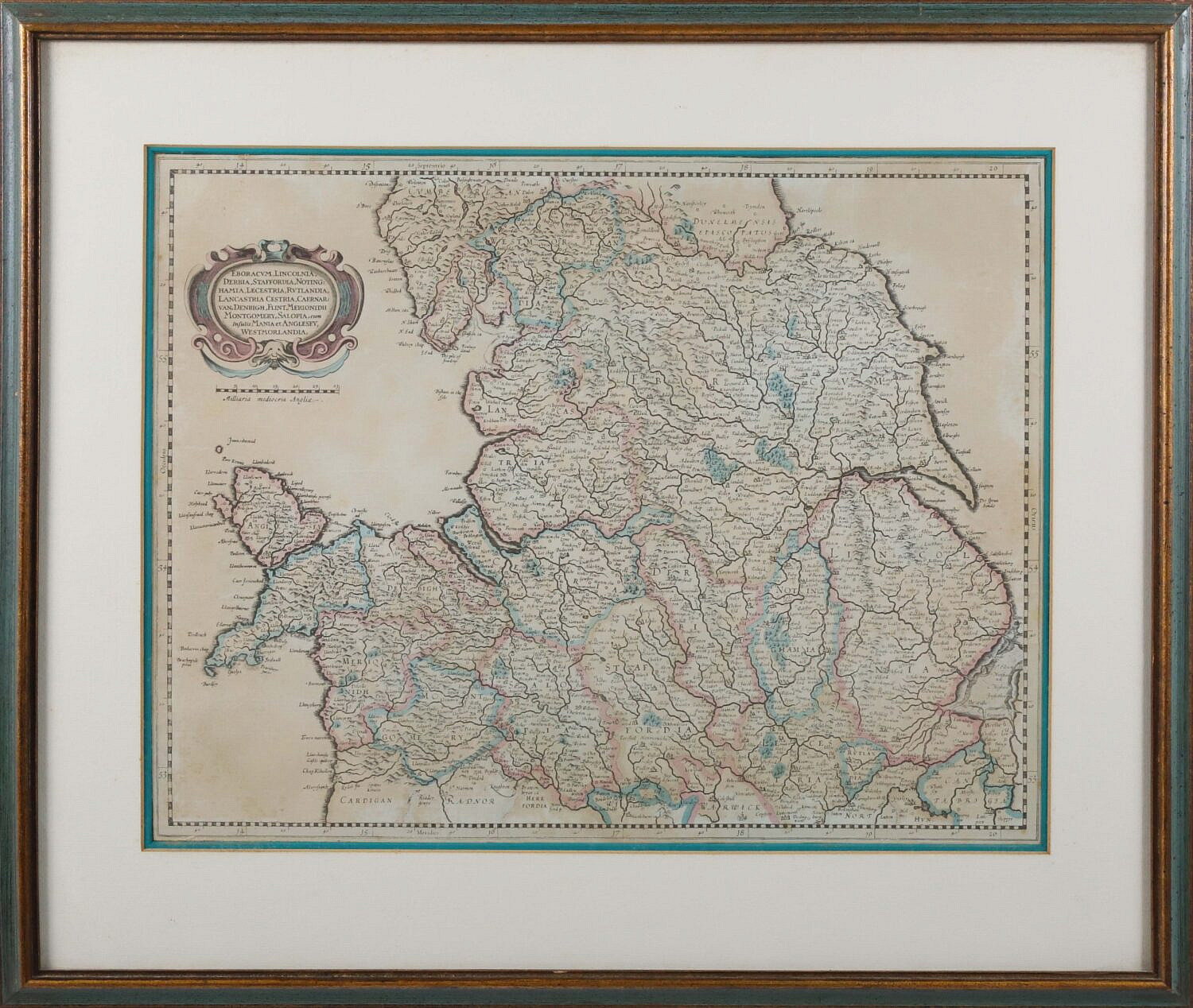 Hundius, Henricus, Map of the North of England, “Eboracum, Lincolnia, Derbia, Staffordia, Notinghamia”, originally published Amsterdam, circa 1635-45, later edition, entitled within a decorative strapwork cartouche; hand colored engraving, matted and framed