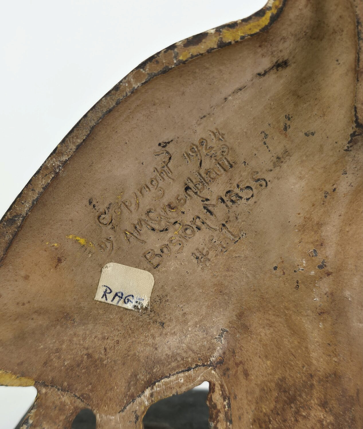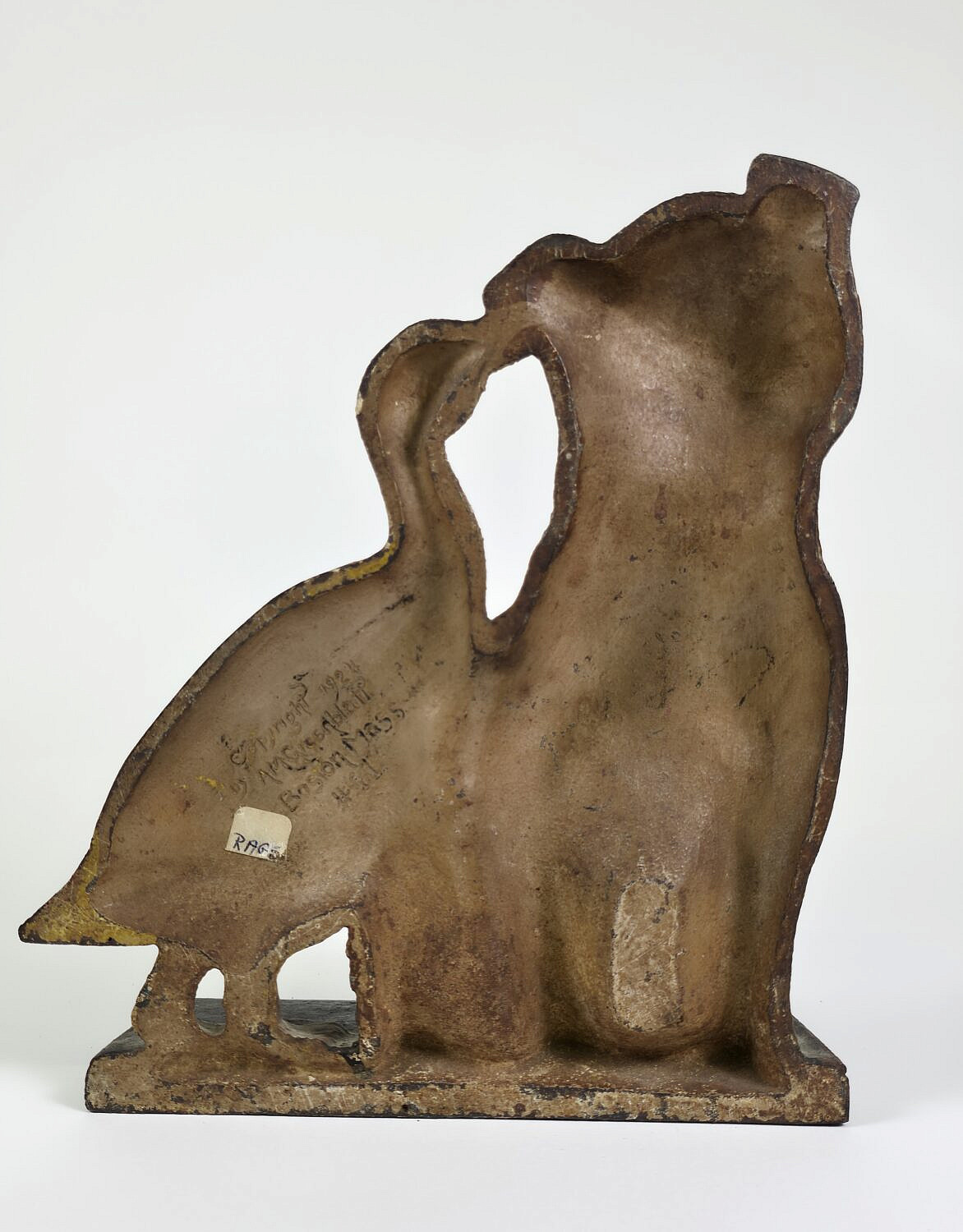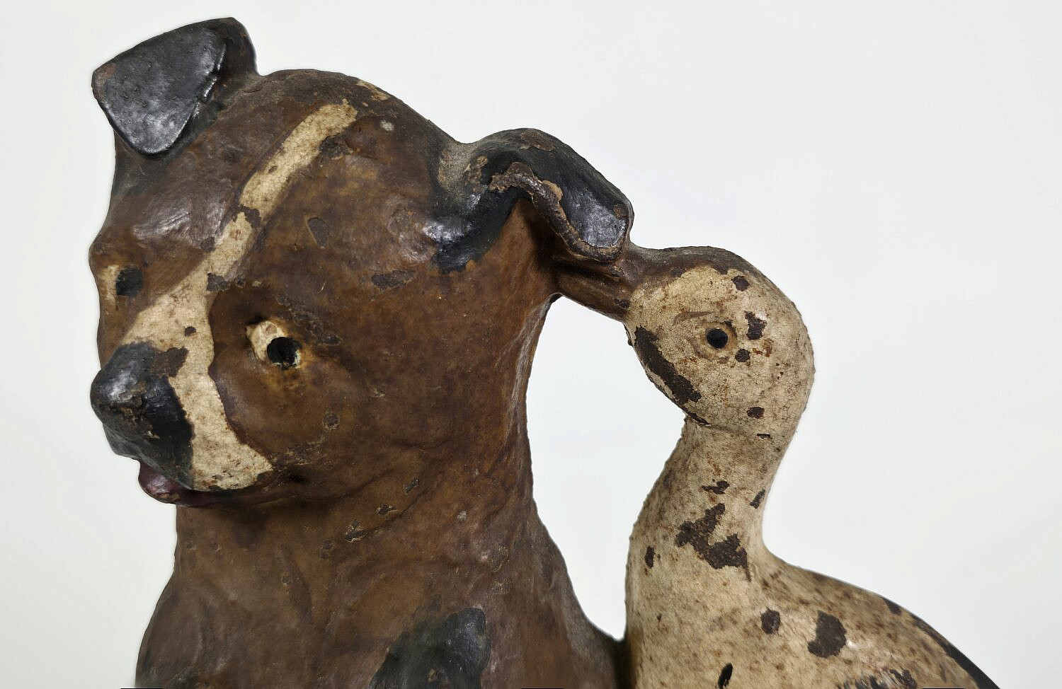 Scarce A.M. Greenblatt Antique Cast Iron Dog and Duck Doorstop, circa 1920s Consign Now Dept20th Century Design, Americana and Folk Arts, Decorative Arts, Furniture/Decorative ArtsSizeHeight 9.75 in. Width 4.75 in. Depth 2.5 in. Scarce A.M. Greenblatt Antique Cast Iron Dog and Duck Doorstop, circa 1920s, in original paint, depicting a duck nibbling on a pups ear, signed upon reverse, Copyright 1924, AM Greenblatt Boston, Mass, #11 Height 9.75 in. Width 4.75 in. Depth 2.5 in. Please note that this auction has ended. Click here for an overview of this auction.