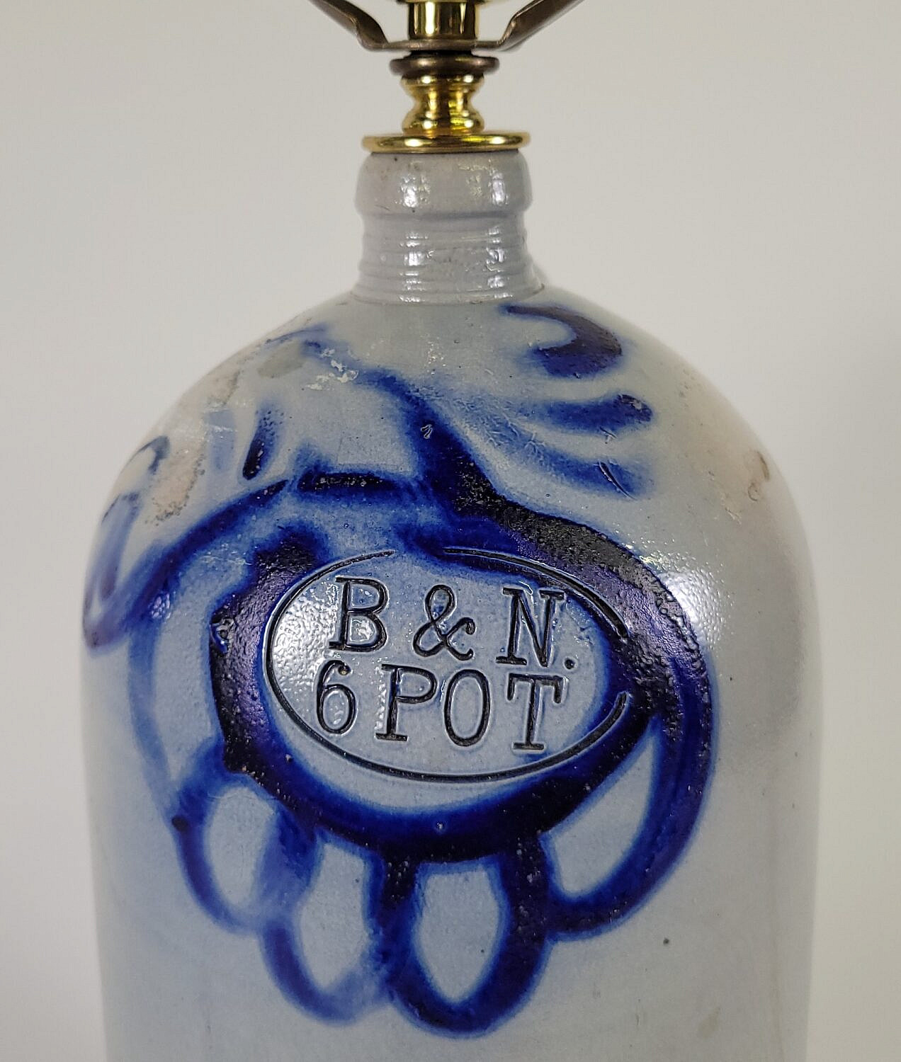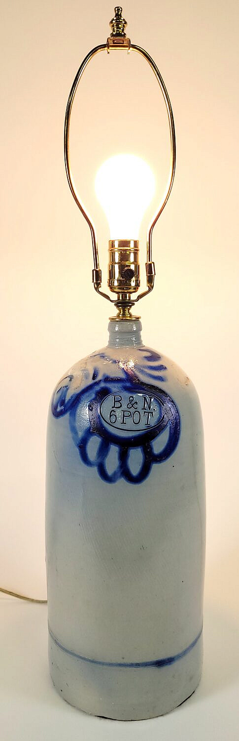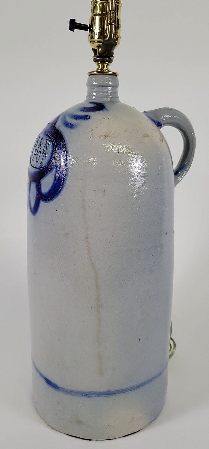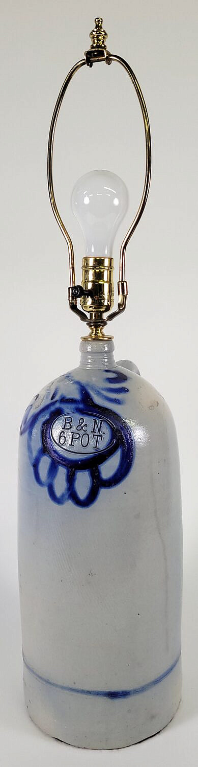 19th C. Cobalt Blue Decorated Stoneware Bottle Jug Lamp Consign Now DeptDecorative ArtsSizeHeight 16 in. Overall Height 28 in. 19th C. Cobalt Blue Decorated Stoneware Bottle Jug Lamp, marked B & N 6 Pot., converted to a lamp. Height 16 in. Overall Height 28 in. Please note that this auction has ended. Click here for an overview of this auction.