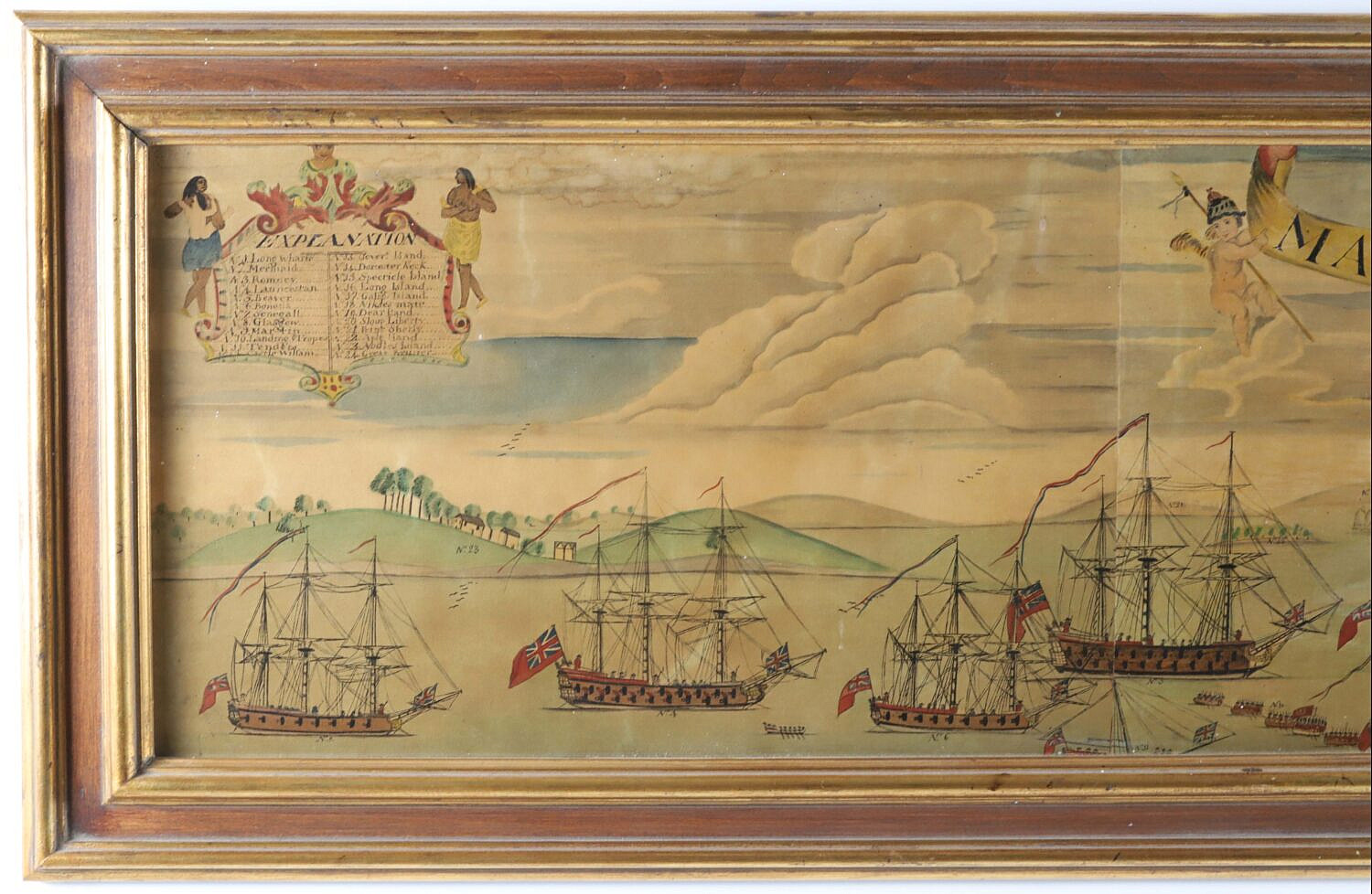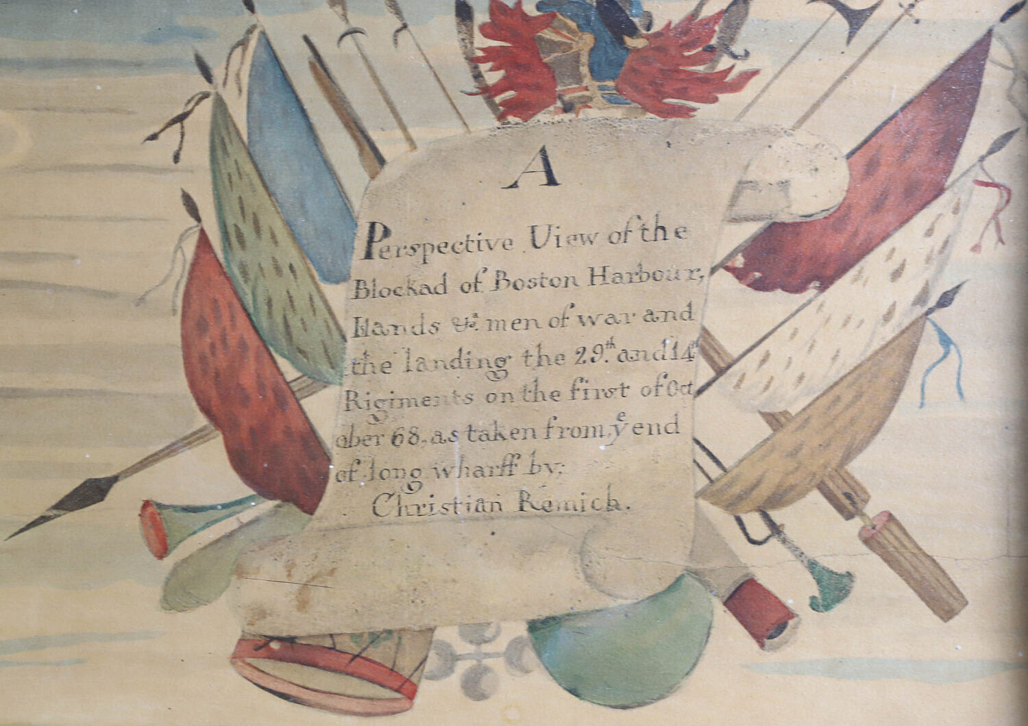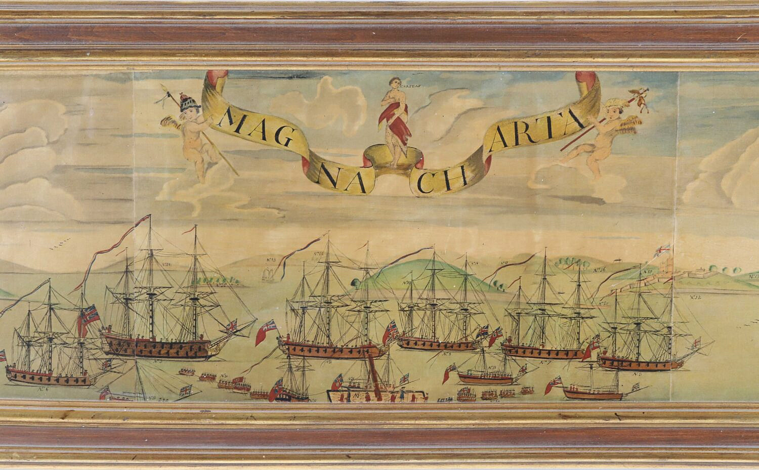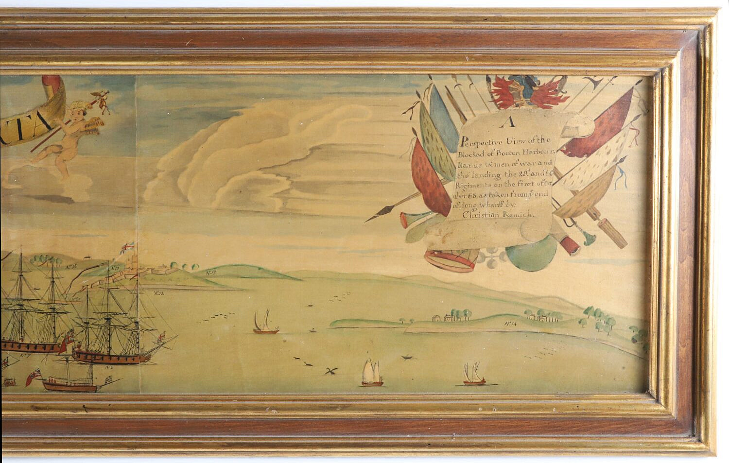 “A Perspective View of the Blockade of Boston Harbor”, a 3-part print of the Magna Charta with explanation cartouche: Governors Island, Dorchester Neck, Spectacle Island, Long Island, etc., in a molded and gilt wood frame. Note: The Museum of Fine Arts has displayed the original.