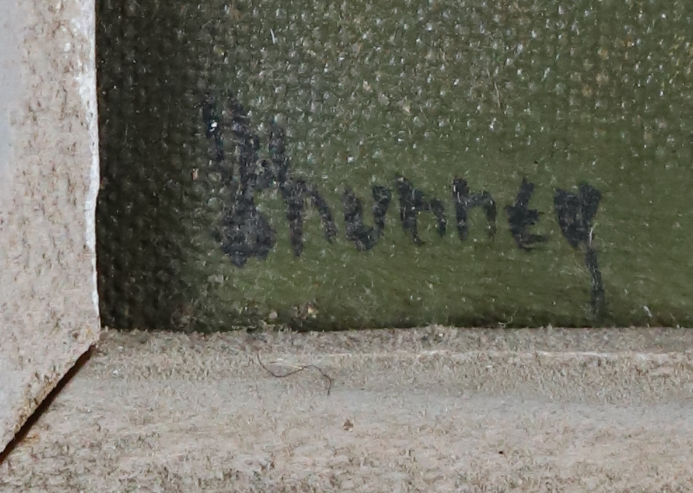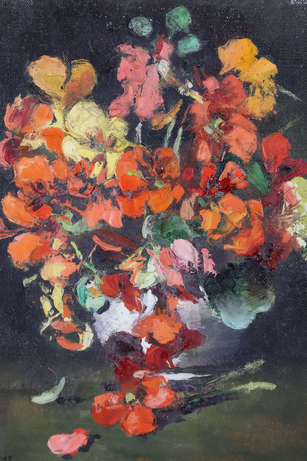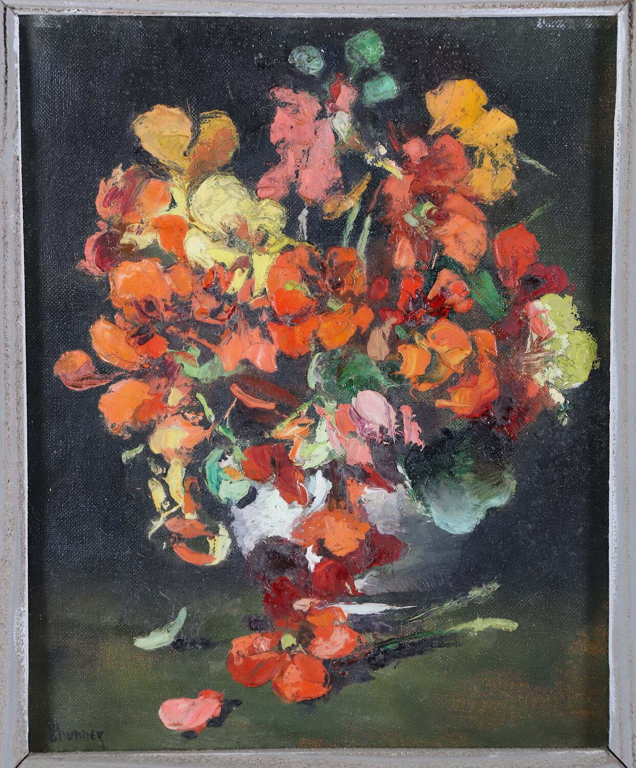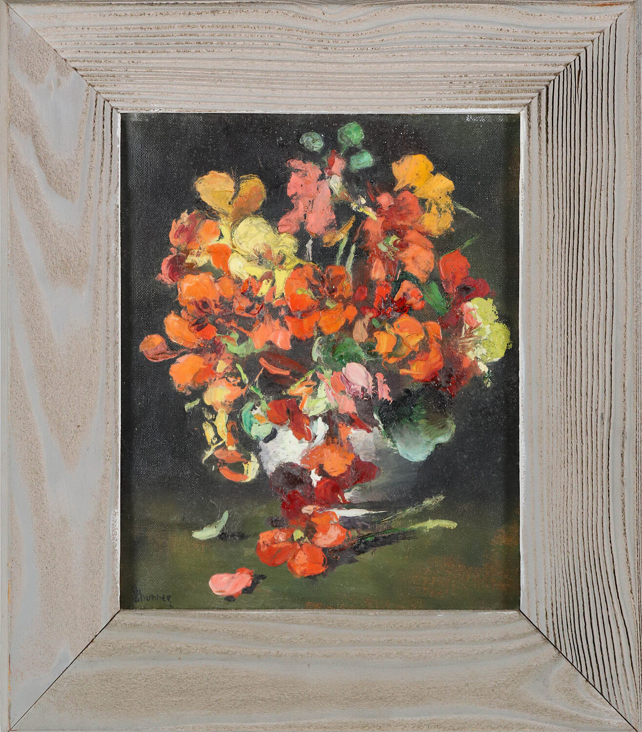 Andrew Shunney (1916-1978) Oil on Canvas “Pansies in a Vase Still Life”, signed lower left Shunney, in grained grey stained wood frame