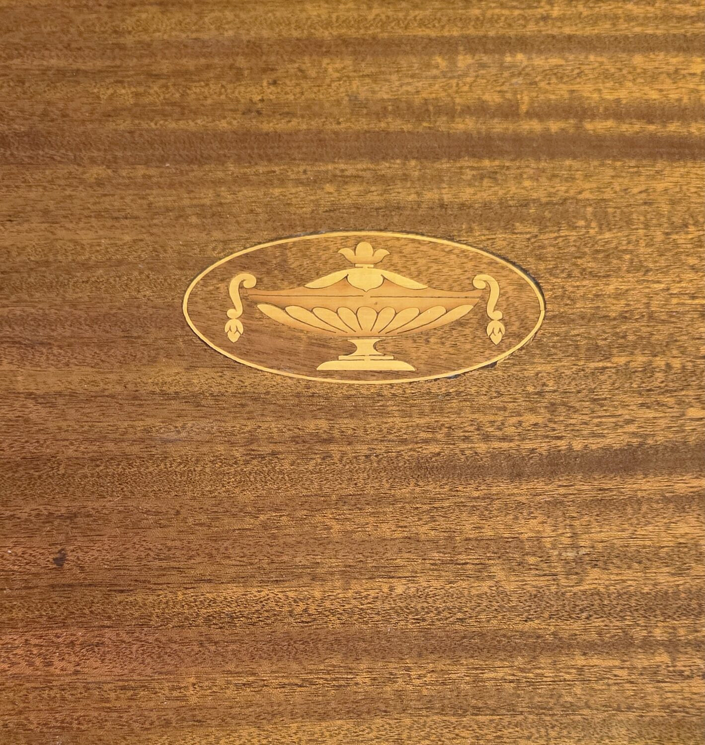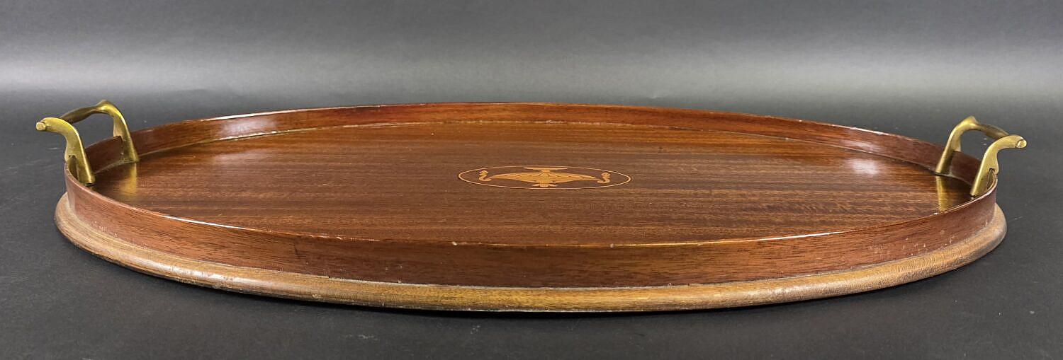 Antique Satinwood Urn Inlaid Mahogany Oval Serving Tray, circa 1920s Consign Now DeptDecorative Arts, Furniture/Decorative ArtsSizeHeight 2.25 in. Width 25.5 in. Depth 15 in. Antique Satinwood Urn Inlaid Mahogany Oval Serving Tray, circa 1920s, with flanking brass carrying handles and raised gallery edge. Height 2.25 in. Width 25.5 in. Depth 15 in. Please note that this auction has ended. Click here for an overview of this auction.