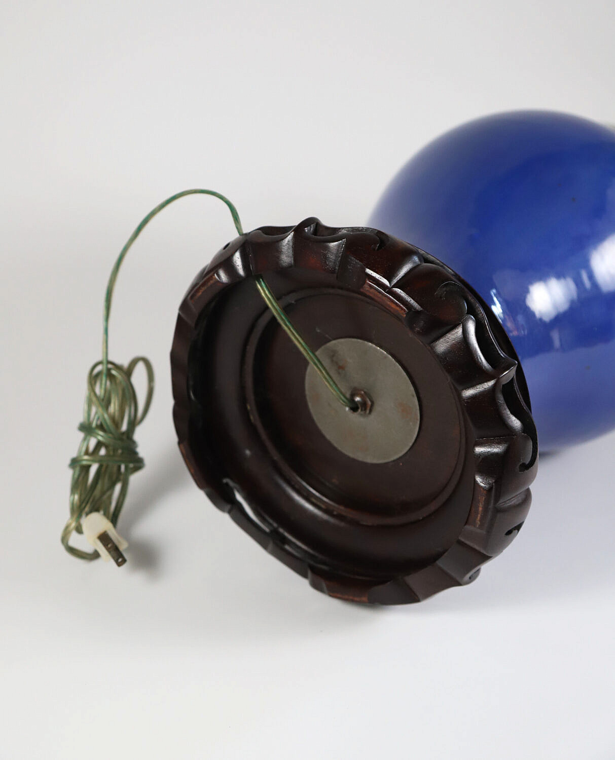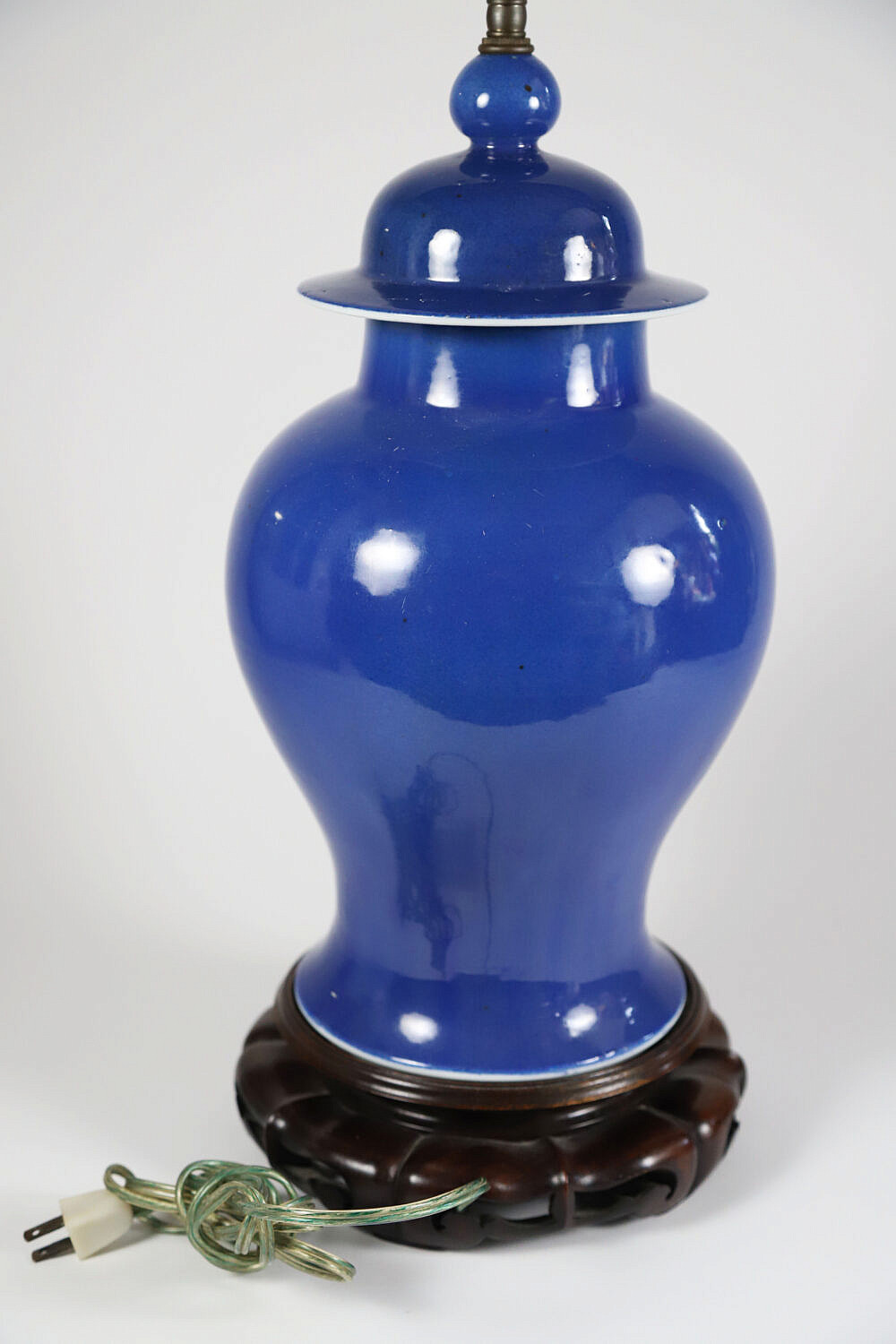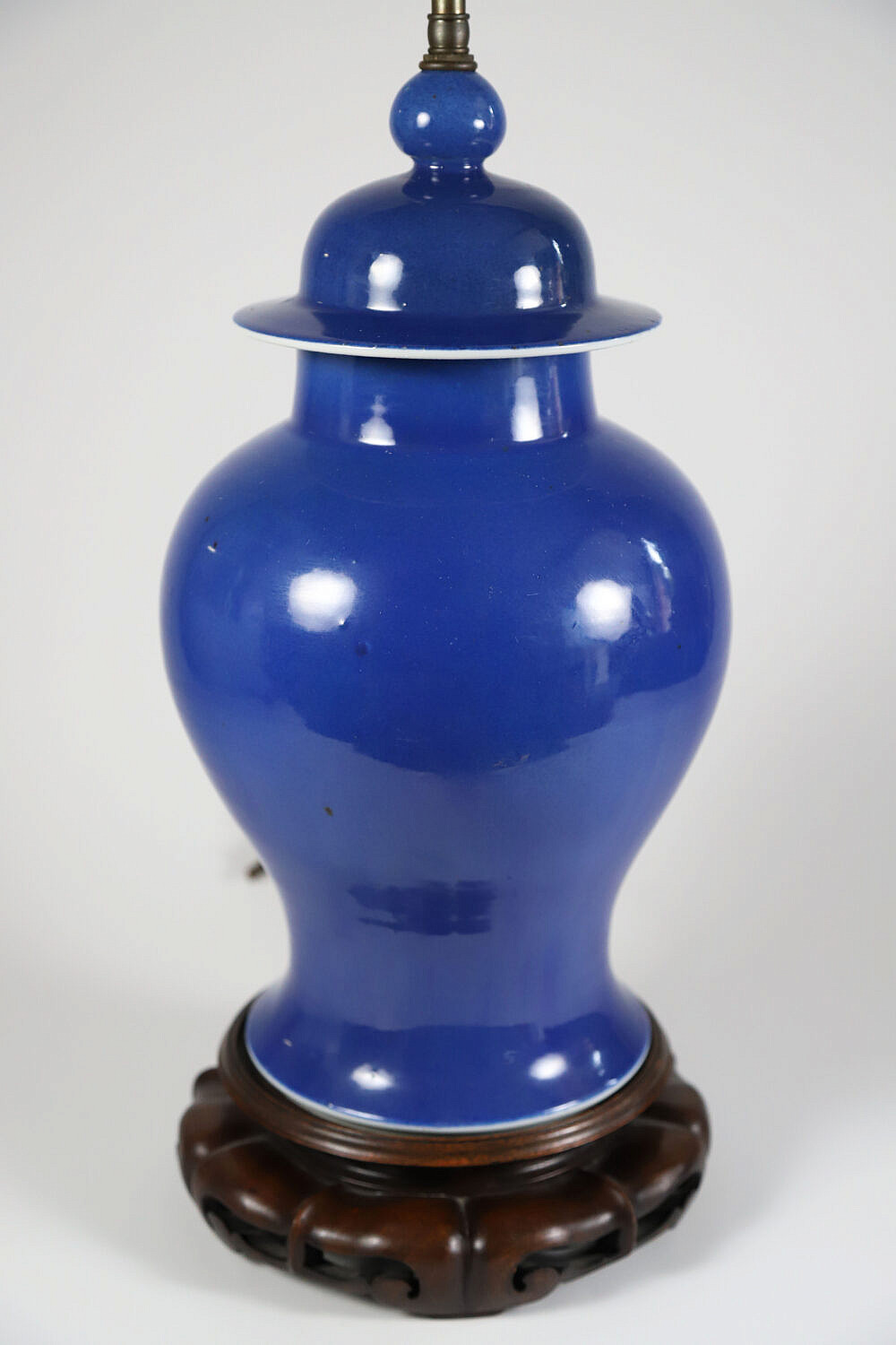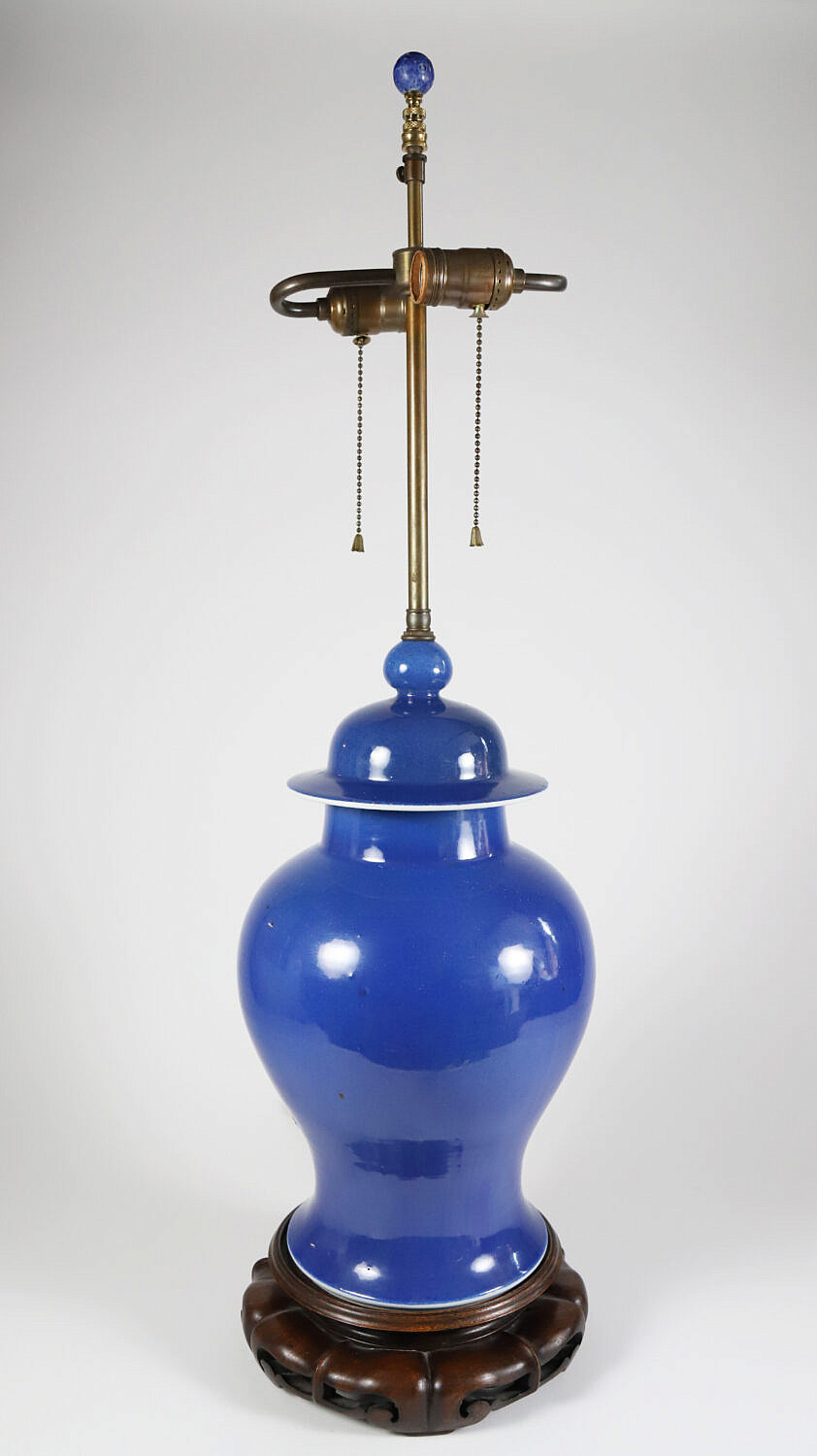 Chinese Blue Porcelain Temple Jar Mounted as Lamp Consign Now DeptAsian Arts/China Trade, Ceramics & Glass, Lighting/Candlesticks/SconcesSizeHeight 17 in. Chinese Blue Porcelain Temple Jar Mounted as Lamp, carved teakwood base Height 17 in. Please note that this auction has ended. Click here for an overview of this auction.