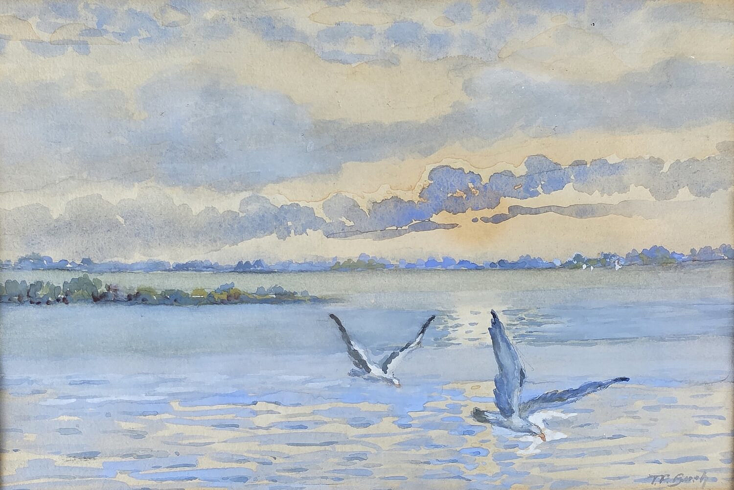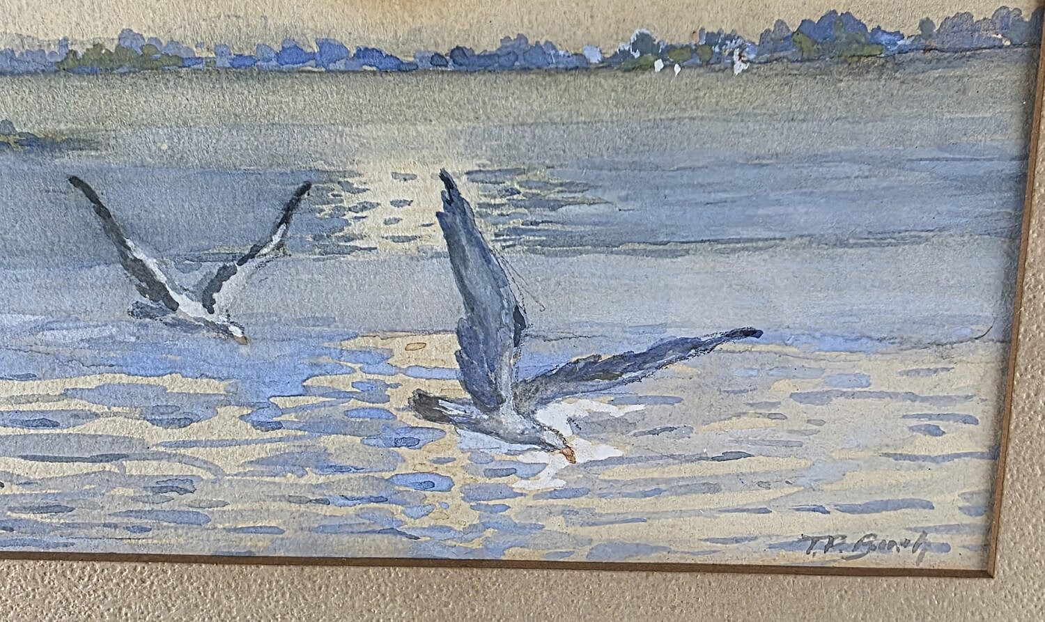 Fine Seascape Coastal Shorebirds Impressionist Watercolor Consign Now DeptDecorative Arts, Fine ArtsSize6 in. x 9 in. Overall 9.75 in. X 12.75 in. Fine Seascape Coastal Shorebirds Impressionist Watercolor, signed lower right TP Bush, inscribed on reverse, painted by Theodora Bush, sister of Mrs. Champion, Seaside Park New Jersey, Barnegat Bay. 6 in. x 9 in. Overall 9.75 in. X 12.75 in. Please note that this auction has ended. Click here for an overview of this auction.