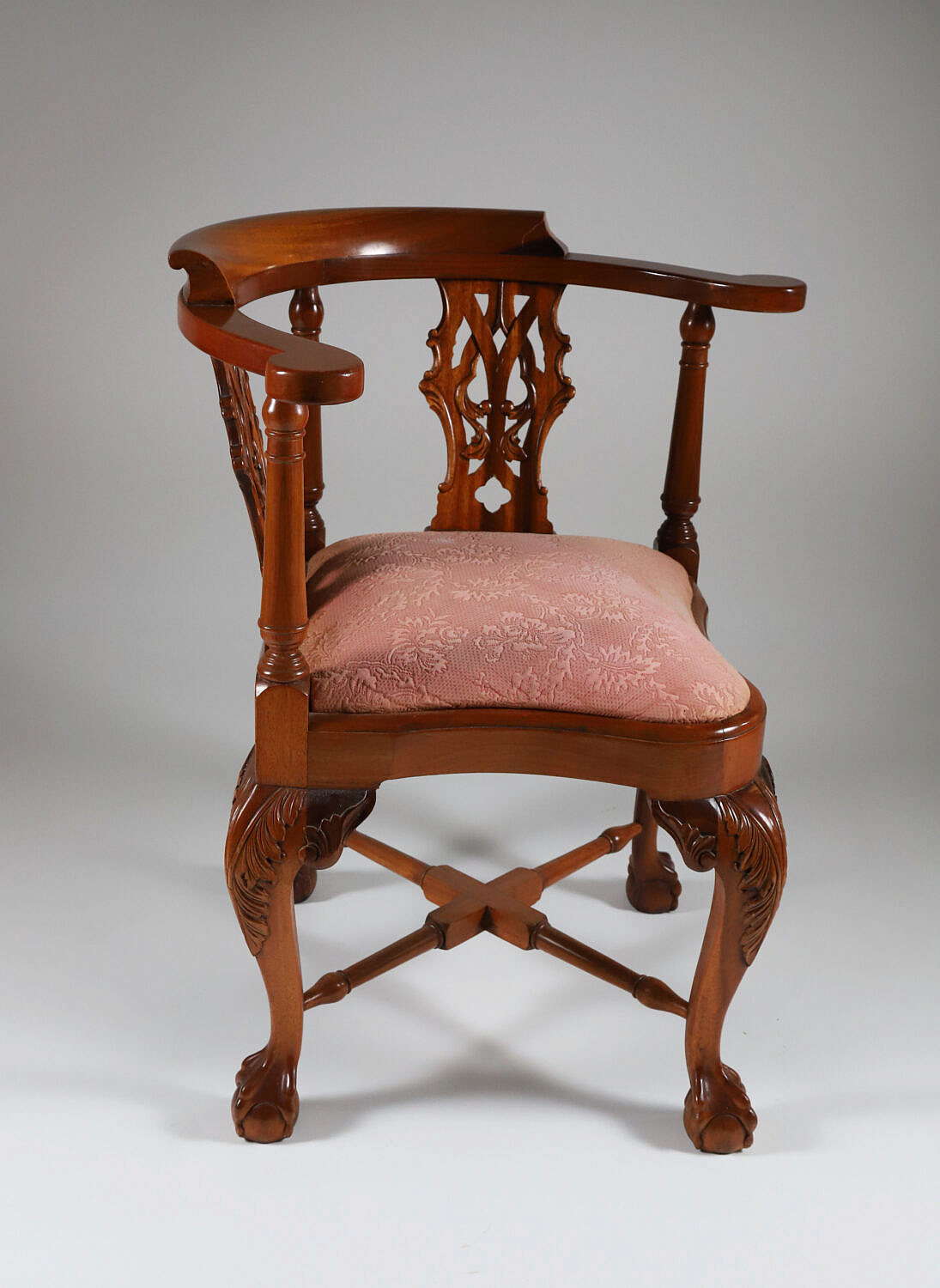 Georgian Style Mahogany Corner Chair, 20th Century, with slip seat and carved cross strecher base, cabriole legs ending in ball and claw feet