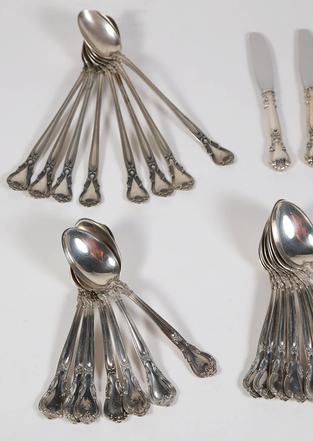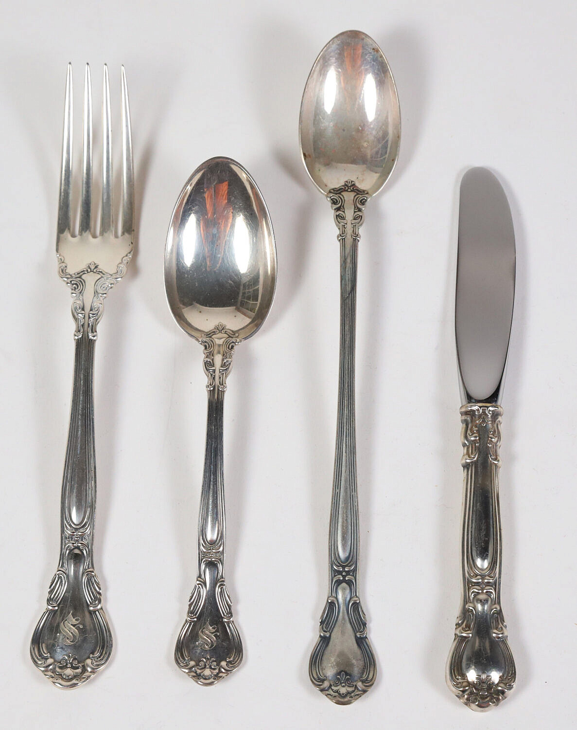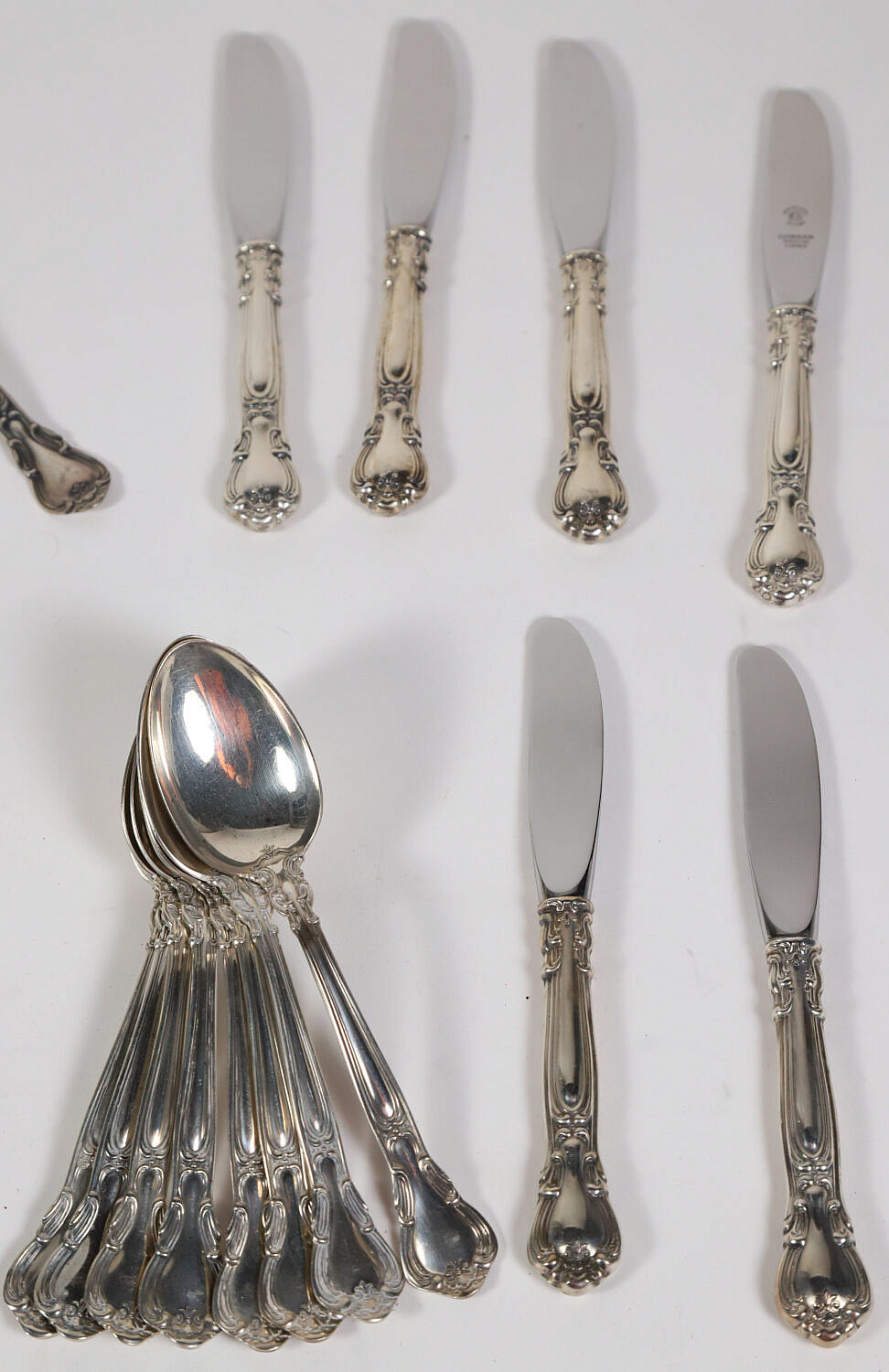 Gorham Sterling Silver Flatware in the Chantilly Pattern Consign Now DeptDecorative Arts, SilverSizeLengths 6 in. to 7.5 in. 50 troy ounces Gorham Sterling Silver Flatware in the Chantilly Pattern, comprising; 14 dinner forks 22 teaspoons 8 iced tea spoons 6 butter knives (sterling silver handles – stainless blades) Lengths 6 in. to 7.5 in. 50 troy ounces (not including butter knives) Please note that this auction has ended. Click here for an overview of this auction.