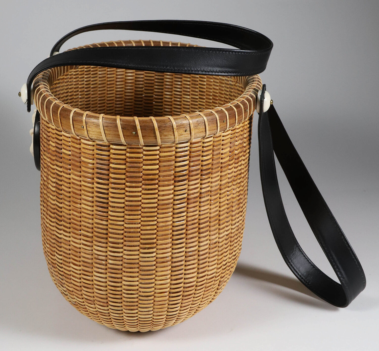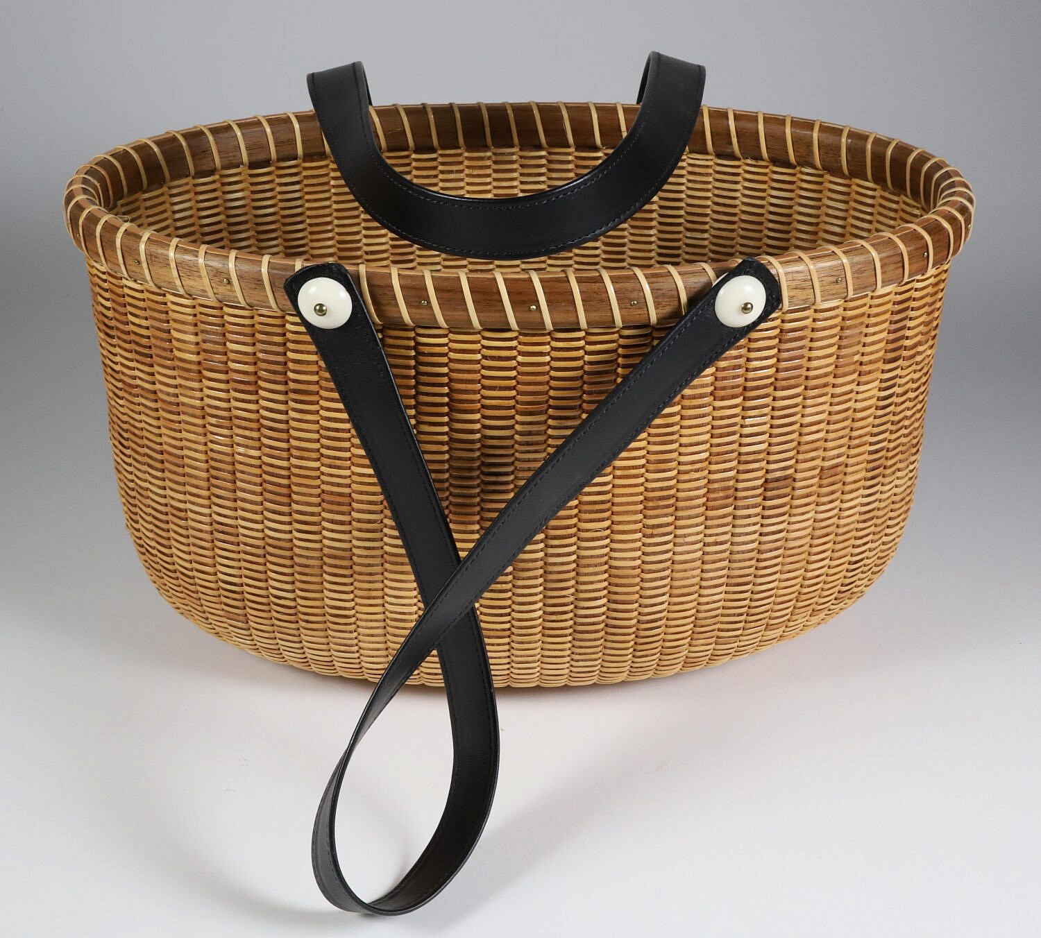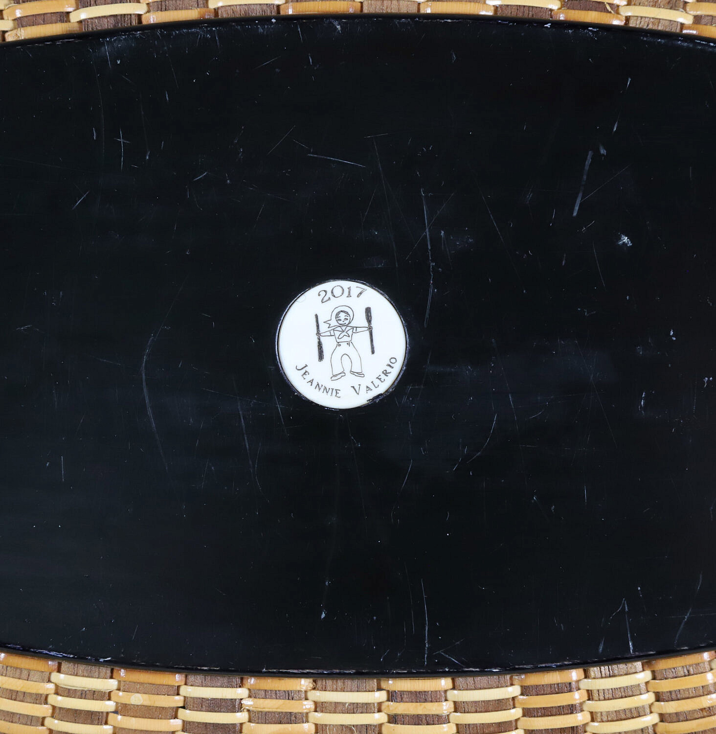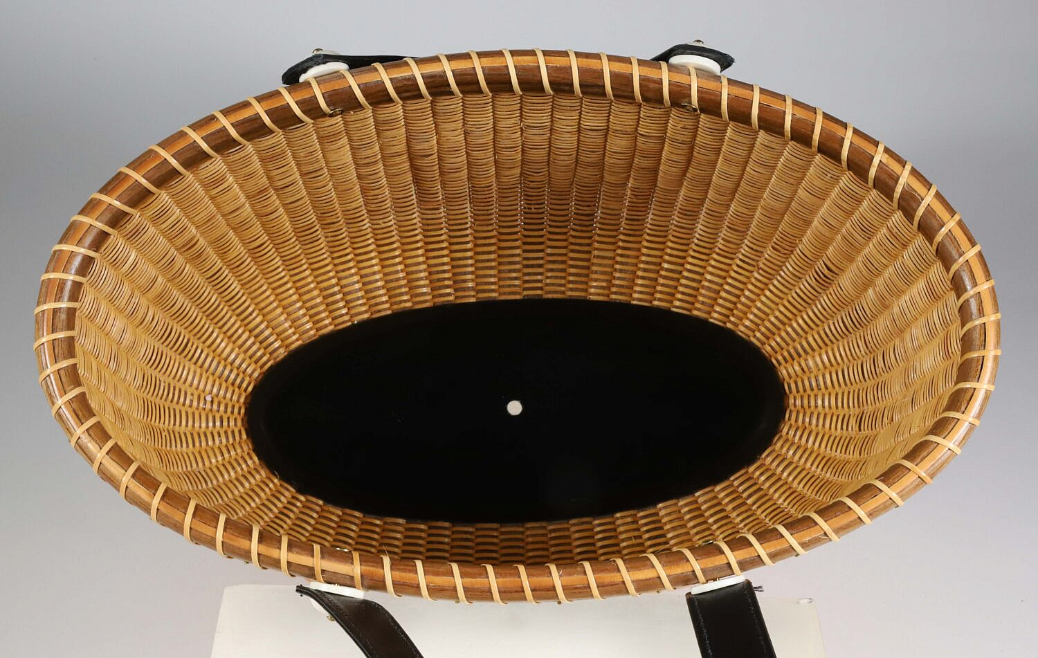 Jean M. Valerio Woven Oval Open Nantucket Basket Handbag, circa 2017, with two leather handles, ebony base and plaque with anchor, fitted with fabric interior, weaver logo on base