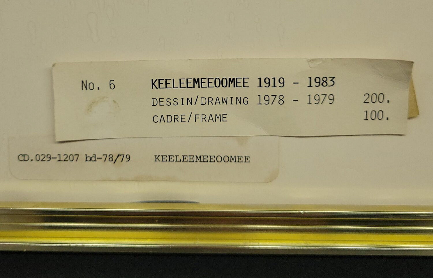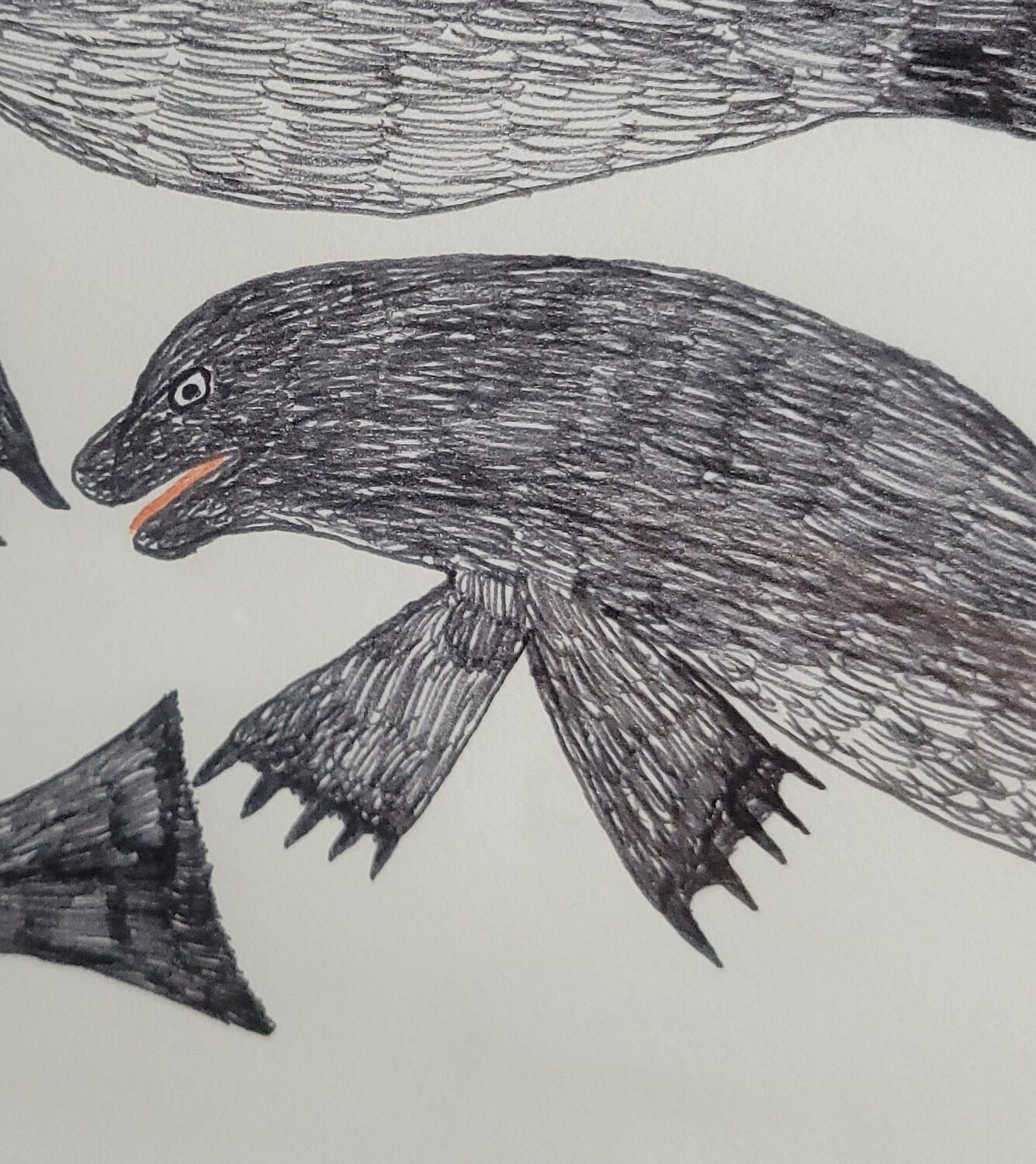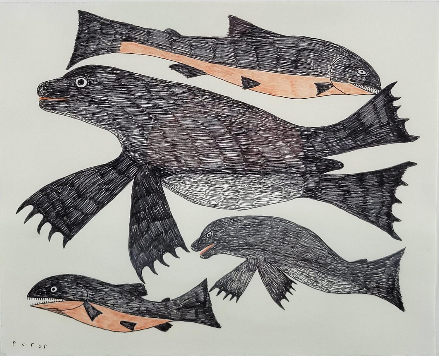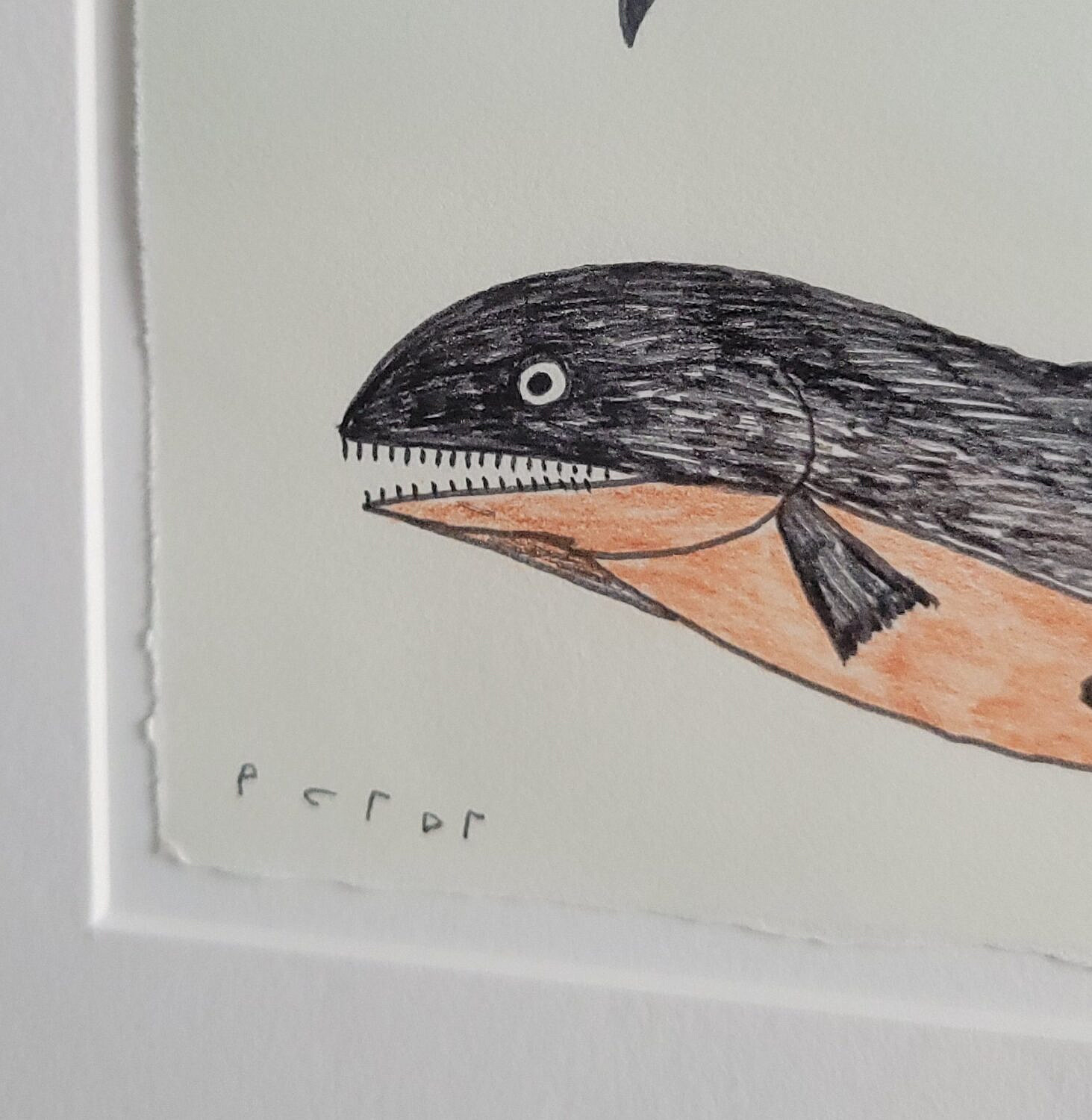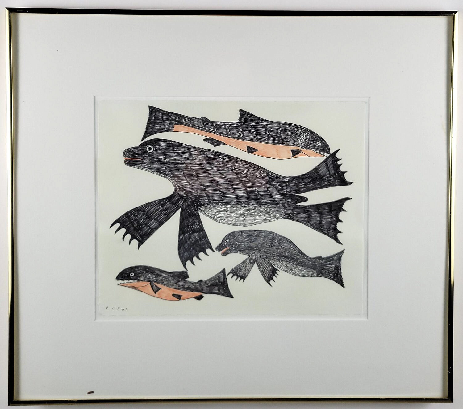 Keeleemeeoomee Samualie (1919-1983) Inuit Mixed Media Drawing, on paper, circa 1978, Baffin Island, Nunavut Canada, depicting seals and salmon, signed lower left, with gallery show label on reverse.