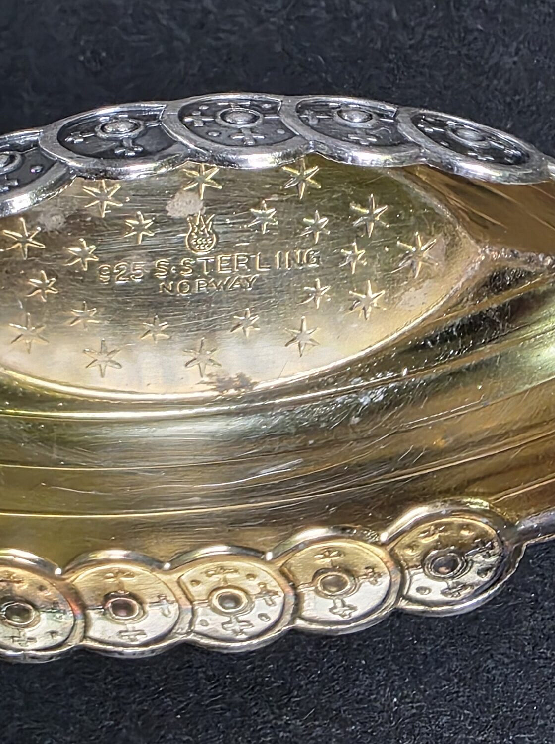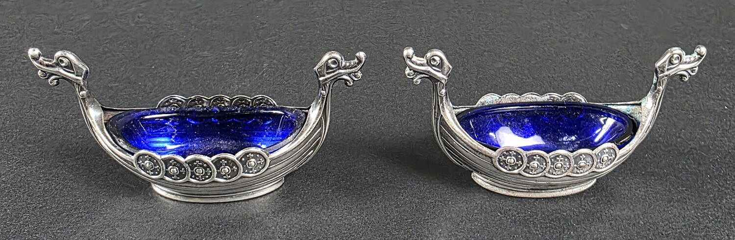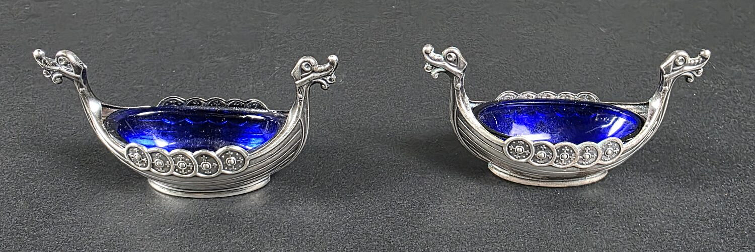 Pair of Sterling Silver Viking Ship Open Salt Cellars, 20th Century Consign Now Dept20th Century Design, Decorative Arts, Maritime Arts, SilverSizeHeight 1.75 in. Width 3.25 in. Depth 1.25 in. Pair of Sterling Silver Viking Ship Open Salt Cellars, 20th century, each with sterling silver spoon, cobalt liner, and is marked Sterling 925 Norway. Height 1.75 in. Width 3.25 in. Depth 1.25 in. Please note that this auction has ended. Click here for an overview of this auction.